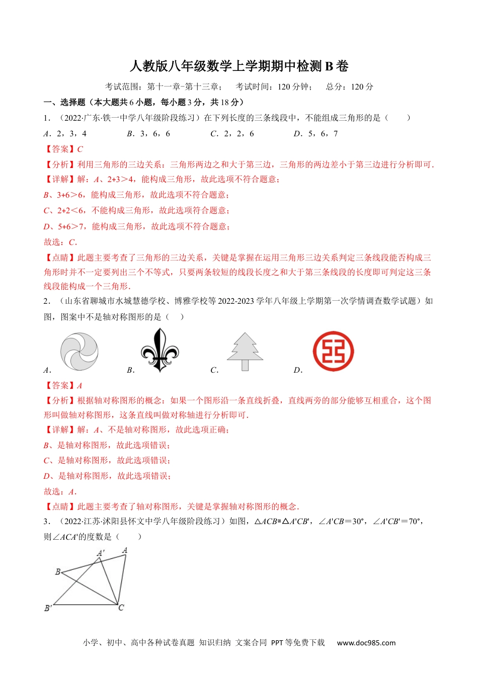 小学、初中、高中各种试卷真题知识归纳文案合同PPT等免费下载www.doc985.com人教版八年级数学上学期期中检测B卷考试范围:第十一章-第十三章;考试时间:120分钟;总分:120分一、选择题(本大题共6小题,每小题3分,共18分)1.(2022·广东·铁一中学八年级阶段练习)在下列长度的三条线段中,不能组成三角形的是()A.2,3,4B.3,6,6C.2,2,6D.5,6,7【答案】C【分析】利用三角形的三边关系:三角形两边之和大于第三边,三角形的两边差小于第三边进行分析即可.【详解】解:A、2+3>4,能构成三角形,故此选项不符合题意;B、3+6>6,能构成三角形,故此选项不符合题意;C、2+2<6,不能构成三角形,故此选项符合题意;D、5+6>7,能构成三角形,故此选项不符合题意;故选:C.【点睛】此题主要考查了三角形的三边关系,关键是掌握在运用三角形三边关系判定三条线段能否构成三角形时并不一定要列出三个不等式,只要两条较短的线段长度之和大于第三条线段的长度即可判定这三条线段能构成一个三角形.2.(山东省聊城市水城慧德学校、博雅学校等2022-2023学年八年级上学期第一次学情调查数学试题)如图,图案中不是轴对称图形的是()A.B.C.D.【答案】A【分析】根据轴对称图形的概念:如果一个图形沿一条直线折叠,直线两旁的部分能够互相重合,这个图形叫做轴对称图形,这条直线叫做对称轴进行分析即可.【详解】解:A、不是轴对称图形,故此选项正确;B、是轴对称图形,故此选项错误;C、是轴对称图形,故此选项错误;D、是轴对称图形,故此选项错误;故选:A.【点睛】此题主要考查了轴对称图形,关键是掌握轴对称图形的概念.3.(2022·江苏·沭阳县怀文中学八年级阶段练习)如图,△ACB≌△A'CB',∠A'CB=30°,∠A'CB'=70°,则∠ACA'的度数是()小学、初中、高中各种试卷真题知识归纳文案合同PPT等免费下载www.doc985.comA.20°B.30°C.35°D.40°【答案】D【分析】根据全等三角形对应角相等,得到∠ACB=∠A′CB′,再根据角的和差关系∠ACA′=∠ACB-∠A′CB即得.【详解】 △ACB≌△A′CB′,∴∠ACB=∠A′CB′=70°, ∠A'CB=30°,∴∠ACA′=∠ACB-∠A′CB=40°.故选D.【点睛】本题主要考查了全等三角形,解决问题的关键是熟练掌握全等三角形对应角相等的性质,角的和差的计算.4.(2021·广东·梅华中学八年级期中)若一个多边形的内角和是其外角和的4倍,则此多边形的对角线共有()A.35条B.40条C.10条D.50条【答案】A【分析】设多边形的边数为n,根据题意,得(n-2)×180°=4×360°,确定n后,根据对角线条数为计算选择即可.【详解】解:设多边形的边数为n,根据题意,得(n-2)×180°=4×360°,解得n=10,所以此多边形的对角线共有=35(条),故选A.【点睛】本题考查了多边形的内角和定理、外角和定理,对角线条数的计算,熟练掌握计算公式是解题的关键.5.(2022·江苏·苏州高新区实验初级中学八年级阶段练习)如图,AD是△ABC中∠BAC的平分线,,垂足为点E,,,,则AC的长是()A.2B.3C.4D.5【答案】D【分析】过点D作于点F,根据角平分线的性质,得出,根据三角形面积公式求出小学、初中、高中各种试卷真题知识归纳文案合同PPT等免费下载www.doc985.com,根据,求出,根据三角形面积公式即可得出.【详解】解:过点D作于点F,如图所示: AD平分∠BAC,,∴, ,∴, ,∴, ,∴,∴,故D正确.故选:D.【点睛】本题主要考查了角平分线的性质,三角形面积的计算,作出辅助线,求出,是解题的关键.6.(2022·广东·丰顺县潘田中学九年级开学考试)如图,已知每个小方格的边长为,,两点都在小方格的顶点上,请在图中找一个顶点,使为等腰三角形,则这样的顶点有()A.个B.个C.个D.个【答案】A【分析】当为底时,作的垂直平分线,当为腰时,分别以、点为顶点,以为半径作弧,分别找到格点即可求解.小学、初中、高中各种试卷真题知识归纳文案合同PPT等免费下载www.doc985.com【详解】解:当为底时,作的垂直平分线,可找出格点的个数有个,当为腰时,分别以、点为顶点,以为半径作弧,可找出格点的个数有个;...