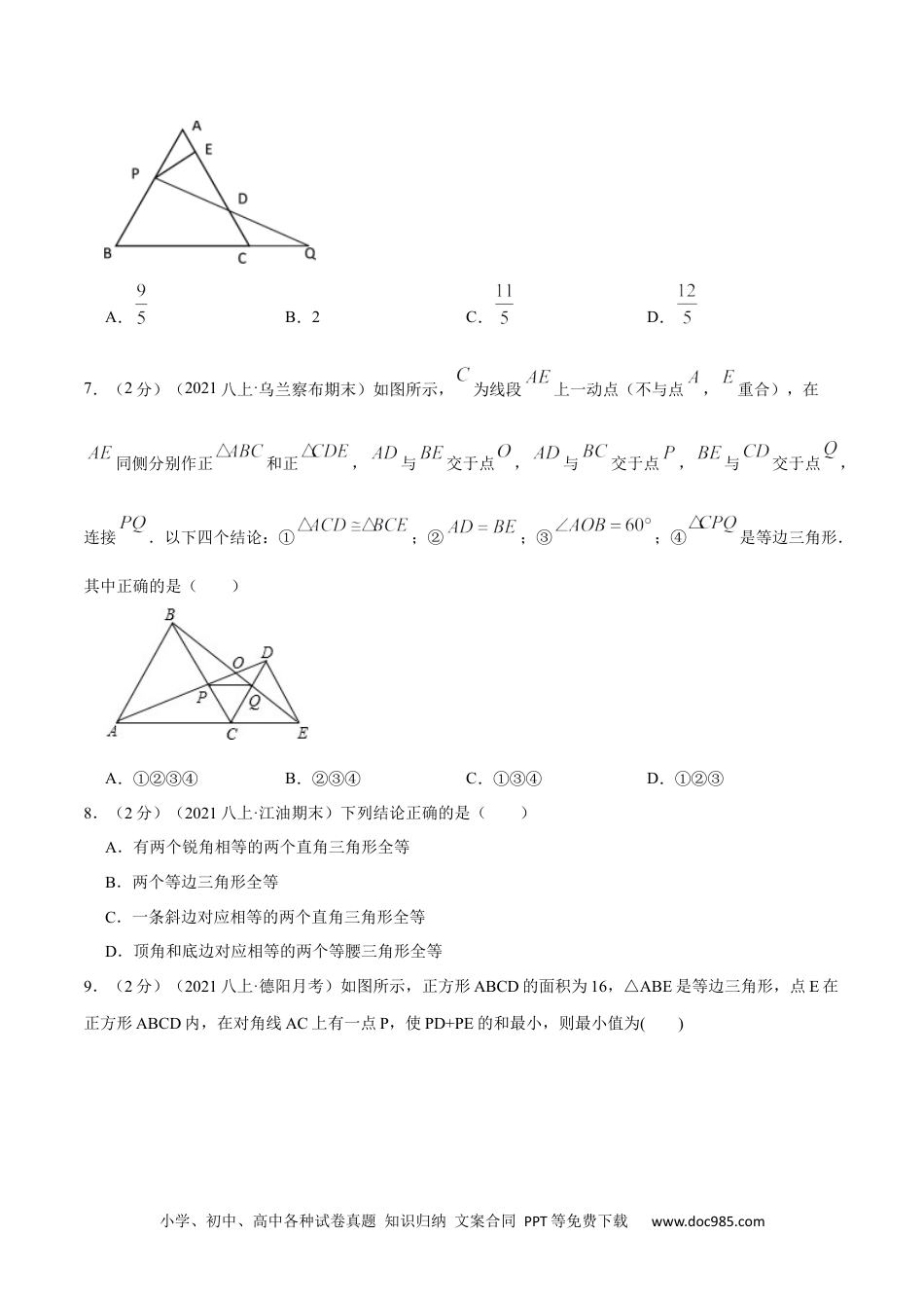 小学、初中、高中各种试卷真题知识归纳文案合同PPT等免费下载www.doc985.com2022-2023学年人教版数学八年级上册压轴题专题精选汇编专题06等边三角形的性质考试时间:120分钟试卷满分:100分姓名:__________班级:__________考号:__________题号一二三总分得分评卷人得分一.选择题(共10小题,满分20分,每小题2分)1.(2分)(2021八上·嵩县期末)如图,是等边三角形,是中线,延长至E,使,则下列结论错误的是()A.B.C.D.2.(2分)(2021八上·凉山期末)三角形中,最大角的取值范围是()A.B.C.D.3.(2分)(2021八上·遵义期末)点D、E分别是等边三角形的边、的中点,,F是AD上一动点,则的最小值是()小学、初中、高中各种试卷真题知识归纳文案合同PPT等免费下载www.doc985.comA.6B.7C.8D.94.(2分)(2021八上·松桃期末)如图,△ABC是等边三角形,点E是AC的中点,过点E作EF⊥AB于点F,延长BC交EF的反向延长线于点D,若EF=1,则DF的长为()A.2B.2.5C.3D.3.55.(2分)(2021八上·灌阳期末)△BDE和△FGH是两个全等的等边三角形,将它们按如图的方式放置在等边三角形ABC内.若BC=5,则五边形DECHF的周长为()A.8B.10C.11D.126.(2分)(2021八上·河东期末)如图,过边长为4的等边的边AB上一点P,作PE⊥AC于E,Q为BC延长线上一点,当PA=CQ时,连PQ交AC边于D,则DE的长为()小学、初中、高中各种试卷真题知识归纳文案合同PPT等免费下载www.doc985.comA.B.2C.D.7.(2分)(2021八上·乌兰察布期末)如图所示,为线段上一动点(不与点,重合),在同侧分别作正和正,与交于点,与交于点,与交于点,连接.以下四个结论:①;②;③;④是等边三角形.其中正确的是()A.①②③④B.②③④C.①③④D.①②③8.(2分)(2021八上·江油期末)下列结论正确的是()A.有两个锐角相等的两个直角三角形全等B.两个等边三角形全等C.一条斜边对应相等的两个直角三角形全等D.顶角和底边对应相等的两个等腰三角形全等9.(2分)(2021八上·德阳月考)如图所示,正方形ABCD的面积为16,△ABE是等边三角形,点E在正方形ABCD内,在对角线AC上有一点P,使PD+PE的和最小,则最小值为()小学、初中、高中各种试卷真题知识归纳文案合同PPT等免费下载www.doc985.comA.2B.3C.4D.610.(2分)(2021八上·句容期末)如图,边长为5的等边三角形中,M是高所在直线上的一个动点,连接,将线段绕点B逆时针旋转得到,连接.则在点M运动过程中,线段长度的最小值是()A.B.1C.2D.评卷人得分二.填空题(共10小题,满分20分,每小题2分)11.(2分)(2021八上·丰台期末)如图,在等边三角形中,,是边的高线,延长至点,使,则BE的长为.小学、初中、高中各种试卷真题知识归纳文案合同PPT等免费下载www.doc985.com12.(2分)(2021八上·本溪期末)如图,和都是等边三角形,连接AD,BD,BE,.下列四个结论中:①≌;②;③;④,正确的是(填写所有正确结论的序号).13.(2分)(2021八上·延边期末)如图,正三角形ABC中,D是AB的中点,于点E,过点E作与BC交于点F.若,则的周长为.14.(2分)(2021八上·道里期末)如图,是等边三角形,点E在AC的延长线上,点D在线段AB上,连接ED交线段BC于点F,过点F作于点N,,,若,则AN的长为.小学、初中、高中各种试卷真题知识归纳文案合同PPT等免费下载www.doc985.com15.(2分)(2021八上·铁西期末)如图,是等边三角形,是边上的高,是的中点,是上的一个动点,当与的和最小时,度.16.(2分)(2021八上·延边期末)如图,是等腰直角三角形,AB是斜边,以BC为一边在右侧作等边三角形BCD,连接AD与BC交于点E,则的度数为度.17.(2分)(2021八上·灌云期中)如图,等边△ABC中,AD为BC边上的高,点M、N分别在AD、AC上,且AM=CN,连BM、BN,当BM+BN最小时,∠MBN=度.小学、初中、高中各种试卷真题知识归纳文案合同PPT等免费下载www.doc985.com18.(2分)(2021八上·铁东期中)如图,在中,,,以BC为边在BC的右侧作等边,点E为BD的中点,点P为CE上一动点,连结AP,BP.当的值最小时,的度...
