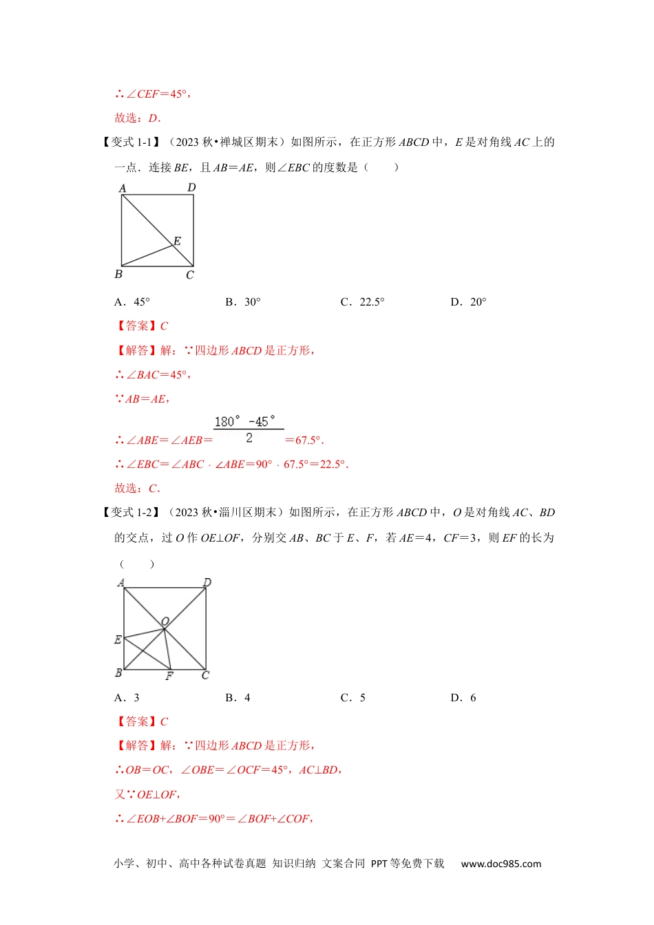 小学、初中、高中各种试卷真题知识归纳文案合同PPT等免费下载www.doc985.com第04讲正方形的性质和判定【题型1正方形的概念和性质】【题型2正方形的判定】【题型3正方形的性质与判定综合】考点1:正方形的概念与性质正方形的定义:一组邻边相等的矩形叫做正方形。※正方形的性质:正方形具有平行四边形、矩形、菱形的一切性质。(正方形是轴对称图形,有两条对称轴)【题型1正方形形的概念和性质】【典例1】(2023秋•顺德区期末)在正方形ABCD中,等边三角形AEF的顶点E、F分别在边BC和CD上,则∠CEF=()A.75°B.60°C.50°D.45°【答案】D【解答】解: 四边形ABCD是正方形,∴AB=AD=BC=CD,∠B=∠D=∠C=90°, △AEF是等边三角形,∴AE=AF,∴Rt△ABERt≌△ADF(HL),∴BE=DF,∴CE=CF,∴△CEF是等腰直角三角形,小学、初中、高中各种试卷真题知识归纳文案合同PPT等免费下载www.doc985.com∴∠CEF=45°,故选:D.【变式1-1】(2023秋•禅城区期末)如图所示,在正方形ABCD中,E是对角线AC上的一点.连接BE,且AB=AE,则∠EBC的度数是()A.45°B.30°C.22.5°D.20°【答案】C【解答】解: 四边形ABCD是正方形,∴∠BAC=45°, AB=AE,∴∠ABE=∠AEB==67.5°.∴∠EBC=∠ABC﹣∠ABE=90°67.5°﹣=22.5°.故选:C.【变式1-2】(2023秋•淄川区期末)如图所示,在正方形ABCD中,O是对角线AC、BD的交点,过O作OE⊥OF,分别交AB、BC于E、F,若AE=4,CF=3,则EF的长为()A.3B.4C.5D.6【答案】C【解答】解: 四边形ABCD是正方形,∴OB=OC,∠OBE=∠OCF=45°,AC⊥BD,又 OE⊥OF,∴∠EOB+∠BOF=90°=∠BOF+∠COF,小学、初中、高中各种试卷真题知识归纳文案合同PPT等免费下载www.doc985.com∴∠EOB=∠COF,∴△BEO≌△CFO(ASA),∴BE=CF=3,又 AB=BC,∴AE=BF=4,∴Rt△BEF中,EF===5.故选:C.【变式1-3】(2023秋•西宁期末)如图,正方形AOBC的边OB,OA分别在x轴和y轴上,点A(0,4),点D(4,3)在BC边上,将△ACD以点A为旋转中心,顺时针旋转90°得到△AOD′,AM平分∠DAD′交OB于点M,则点M的坐标是(2.4,0).【答案】(2.4,0).【解答】解:连接DM, 将△ACD以点A为旋转中心,顺时针旋转90°得到△AOD′,∴AD'=AD,D'O=CD, AM平分∠DAD′交OB于点M,∴∠D'AM=∠DAM, AM=AM,∴△D′AM≌△DAM,∴D'M=DM, 点A(0,4),点D(4,3),四边形AOBC是正方形,小学、初中、高中各种试卷真题知识归纳文案合同PPT等免费下载www.doc985.com∴OA=BC=4,BD=3,CD=1,设OM=x,则D'M=DM=1+x,BM=4﹣x,∴DM2=BM2+BD2,∴(1+x)2=32+(4﹣x)2,解得x=2.4,∴M的坐标为(2.4,0),故答案为:(2.4,0).【变式1-4】(2023秋•磐石市期末)如图,正方形ABCD的对角线相交于点O,点O又是另一个正方形A'B'C'O的一个顶点.若两个正方形的边长均为2,则图中阴影部分图形的面积为1.【答案】见试题解答内容【解答】解:设A′O与AB交于点E,C′O与BC交于点F,因为四边形ABCD是正方形,所以AO=BO,∠AOB=90°,∠EAO=∠FBO.∴∠AOE+∠BOE=90°.又∠BOF+∠BOE=90°,∴∠AOE=∠BOF.所以△AEO≌△BFO(ASA).∴四边形EBFO面积=△BEO面积+△BFO面积=△BEO面积+△AEO面积=△ABO面积.小学、初中、高中各种试卷真题知识归纳文案合同PPT等免费下载www.doc985.com因为正方形ABCD边长为2,∴正方形面积为4,∴△ABO面积为1.所以阴影部分面积为1.故答案为1.考点2:正方形的判定※正方形常用的判定:有一个内角是直角的菱形是正方形;邻边相等的矩形是正方形;对角线相等的菱形是正方形;对角线互相垂直的矩形是正方形。注意:正方形、矩形、菱形和平行边形四者之间的关系(如图3所示):【题型2正方形的判定】【典例2】(2023•秦都区校级二模)如图,在矩形ABCD中,对角线AC、BD交于点O,添加下列一个条件,能使矩形ABCD成为正方形的是()A.BD=ABB.DC=ADC.∠AOB=60°D.OD=CD【答案】B【解答】解:要使矩形成为正方形,可根据正方形的判定定理解答:小学、初中、高中各种试卷真题知识归...