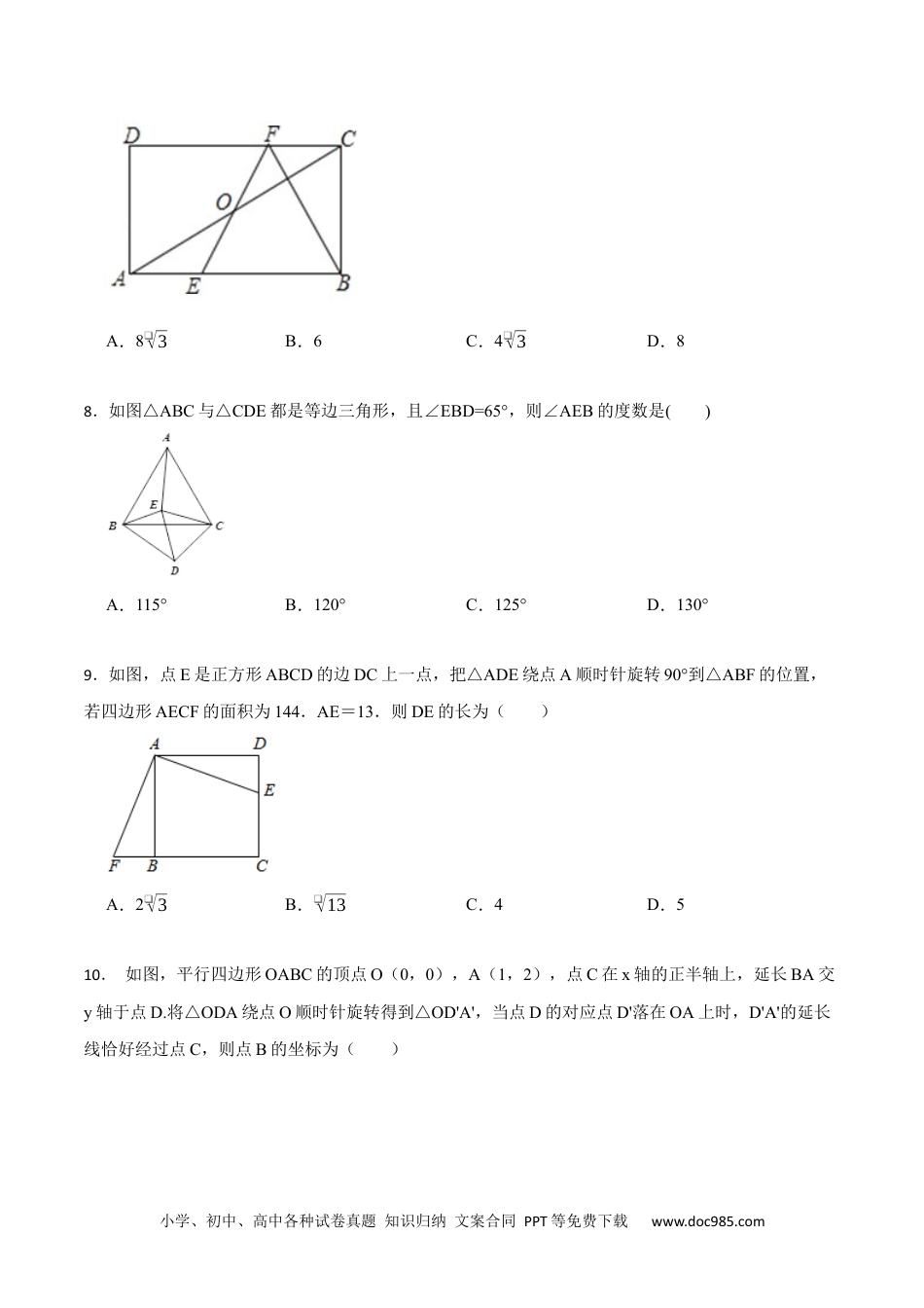 小学、初中、高中各种试卷真题知识归纳文案合同PPT等免费下载www.doc985.com第23章旋转单元检测一、单选题1.下面这几个车标中,是中心对称图形而不是轴对称图形的共有()A.1个B.2个C.3个D.4个2.相信同学们都玩过万花筒,如图是某个万花筒的造型,图中的小三角形均是全等的等边三角形,那么图中的菱形AEFG可以看成是把菱形ABCD以A为旋转中心()A.顺时针旋转60°得到B.顺时针旋转120°得到C.逆时针旋转60°得到D.逆时针旋转120°得到3.如图,直角三角板ABC的斜边AB=12㎝,∠A=30°,将三角板ABC绕C顺时针旋转90°至三角板A'B'C'的位置后,再沿CB方向向左平移,使点落在原三角板ABC的斜边AB上,则三角板平移的距离为()A.6㎝B.4㎝C.(6-2❑√3)㎝D.(4❑√3-6)㎝4.如图,在平面直角坐标系xOy中,△A′B′C′由△ABC绕点P旋转得到,则点P的坐标为()小学、初中、高中各种试卷真题知识归纳文案合同PPT等免费下载www.doc985.comA.(0,1)B.(1,﹣1)C.(0,﹣1)D.(1,0)5.将∠AOB绕点O顺时针旋转15°,得到∠COD,若∠COD=45°,则∠AOB的度数是()A.15°B.30°C.45°D.60°6.如图,将△ABC绕点B顺时针旋转得到△DBE,点C的对应点为E,点A的对应点D落在AC的延长线上,连接EC.则下列结论一定正确的是()A.∠BAC=∠DBEB.AB=CEC.∠BDE=∠BDCD.BC=ED7.如图,在矩形ABCD中,E是边AB上的点,将线段BE绕B点顺时针旋转一定角度后交边CD于点F,此时AE=CF,连接EF交对角线AC于点O,且BE=BF,∠BEF=2BAC∠,FC=2,则AB的长为()小学、初中、高中各种试卷真题知识归纳文案合同PPT等免费下载www.doc985.comA.8❑√3B.6C.4❑√3D.88.如图△ABC与△CDE都是等边三角形,且∠EBD=65°,则∠AEB的度数是()A.115°B.120°C.125°D.130°9.如图,点E是正方形ABCD的边DC上一点,把△ADE绕点A顺时针旋转90°到△ABF的位置,若四边形AECF的面积为144.AE=13.则DE的长为()A.2❑√3B.❑√13C.4D.510.如图,平行四边形OABC的顶点O(0,0),A(1,2),点C在x轴的正半轴上,延长BA交y轴于点D.将△ODA绕点O顺时针旋转得到△OD'A',当点D的对应点D'落在OA上时,D'A'的延长线恰好经过点C,则点B的坐标为()小学、初中、高中各种试卷真题知识归纳文案合同PPT等免费下载www.doc985.comA.(2❑√5,2)B.(2❑√3,2)C.(2❑√3+1,2)D.(2❑√5+1,2)二、填空题11.如图,将△AOB绕点O顺时针旋转36°得△COD,AB与其对应边CD相交所构成的锐角的度数是.12.如图,BD为正方形ABCD的对角线,BE平分∠DBC,交DC与点E,将△BCE绕点C顺时针旋转90°得到△DCF,若CE=1cm,则BF=cm.13.已知:点E是正方形ABCD边上的一点,将线段AE绕点E顺时针旋转90°,得到线段EA′,若AB=2,则线段DA′的最小值为小学、初中、高中各种试卷真题知识归纳文案合同PPT等免费下载www.doc985.com14.如图,在△ABC中,AB=AC=5,BC=8,将△ABC绕着点B旋转得到△A′BC′,点A的对应点A′,点C的对应点C′.如果点A′在BC边上,那么点C和点C′之间的距离为.15.如图,将△ABC绕点A逆时针旋转得到△AB′C′.若B′落到BC边上,∠B=50°,则∠CB′C′的度数为.三、作图题16.如图,在每个小正方形的边长为1的网格中,点A,B,C均在格点上,连接AB,AC,并按下列要求用无刻度的直尺作图,并保留作图痕迹.小学、初中、高中各种试卷真题知识归纳文案合同PPT等免费下载www.doc985.com(1)将线段AB沿AC方向平移❑√5个单位长度得线段CD,并连接BD;(2)将点C绕点A逆时针旋转90°,使点C落在点E处,并作一条直线l,使其过点E并且平分四边形ABDC的面积.四、解答题17.已知△ABC如图所示,A(﹣4,1),B(﹣1,1),C(﹣4,3),在网格中按要求画图:(1)画出△ABC关于y轴对称的△A1B1C1;(2)画出△ABC绕点A顺时针旋转90°后的△AB2C2.18.如图,四边形ABCD是正方形.△ABE是等边三角形,M为对角线BD(不含B,D点)上任意一点,将线段BM绕点B逆时针旋转60°得到BN,连接EN,AM、CM.请判断线段AM和线段EN的数量关系,并说明理由.小学、初中、高中各种试卷真题知识归纳文...