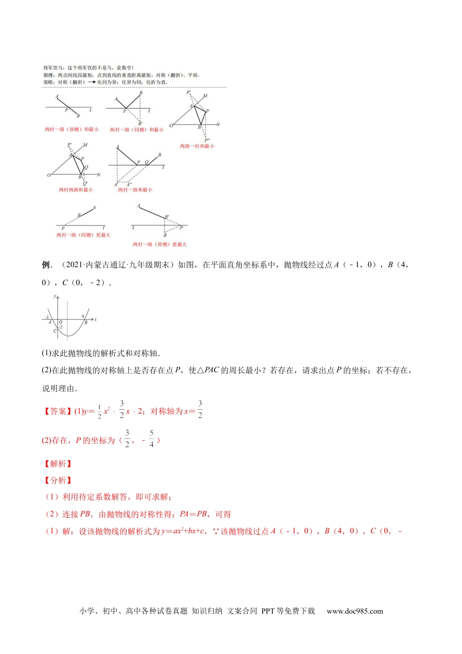 小学、初中、高中各种试卷真题知识归纳文案合同PPT等免费下载www.doc985.com专题09二次函数的最值和存在性问题【思维导图】◎突破一:线段周长最值【技巧】二次函数求最值通常有两种类型:一种是通过几何性质线段公理和垂线段公理求最值,常常把折的问题转化成直的问题;另一种通过函数的性质求最值。线段最值即把线段的两个端点用坐标表示出来,然后根据距离差,列出关于坐标的二次函数的表达式,化为顶点式,即可求出;在求周长的最值问题时,一般会和将军饮马问题有关,找到对称点,将周长问题转化为线段最值即可。小学、初中、高中各种试卷真题知识归纳文案合同PPT等免费下载www.doc985.com例.(2021·内蒙古通辽·九年级期末)如图,在平面直角坐标系中,抛物线经过点A(﹣1,0),B(4,0),C(0,﹣2).(1)求此抛物线的解析式和对称轴.(2)在此抛物线的对称轴上是否存在点P,使△PAC的周长最小?若存在,请求出点P的坐标;若不存在,说明理由.【答案】(1)y=x2﹣x2﹣;对称轴为x=(2)存在,P的坐标为(,﹣)【解析】【分析】(1)利用待定系数解答,即可求解;(2)连接PB,由抛物线的对称性得:PA=PB,可得(1)解:设该抛物线的解析式为y=ax2+bx+c, 该抛物线过点A(﹣1,0),B(4,0),C(0,﹣小学、初中、高中各种试卷真题知识归纳文案合同PPT等免费下载www.doc985.com2),代入,得:解得:∴此抛物线的解析式为y=x2﹣x2﹣. 抛物线解析式为y=x2﹣x2﹣=﹣∴抛物线的对称轴为x=.(2)解:存在,理由如下:连接PB由抛物线的对称性得:PA=PB∴△PAC的周长PA+PC+AC=PB+PC+AC,∴当B、P、C三点共线时,PB+PC最小,即当B、P、C三点共线时,△PAC的周长最小,设直线BC的解析式为y=kx+m,将点B(4,0),点C(0,﹣2)代入,得,解得:,即直线BC的解析式为y=x2﹣.令x=,则有y=﹣2=﹣,即点P的坐标为(,﹣).∴在此抛物线的对称轴上存在点P,使△PAC的周长最小,此时点P的坐标为(,﹣).【点睛】本题主要考查了二次函数的图象和性质,熟练掌握二次函数的图象和性质是解题的关键.专训1.(2021·安徽宣城·九年级期中)如图,抛物线y=ax2+bx+4(a≠0)与x轴交于A(﹣2,0),B(6,0)两点,与y轴交于点C,抛物线的对称轴l与x轴交于点M.(1)求抛物线的函数关系式.小学、初中、高中各种试卷真题知识归纳文案合同PPT等免费下载www.doc985.com(2)设点P是直线l上的一个动点,求△PAC周长的最小值.【答案】(1);(2).【解析】【分析】(1)根据点的坐标,利用待定系数法即可得;(2)作点关于对称轴对称的点,连接,先根据二次函数的解析式求出点的坐标,从而可得点的坐标,再根据二次函数的对称性可得,然后根据两点之间线段最短可得当点共线时,周长最小,最后利用两点之间的距离公式即可得.【详解】解:(1)将点代入得:,解得,则抛物线的函数关系式为;(2)二次函数的对称轴为直线,当时,,即,,小学、初中、高中各种试卷真题知识归纳文案合同PPT等免费下载www.doc985.com如图,作点关于对称轴对称的点,连接,则,,周长为,当取得最小值时,周长最小,由两点之间线段最短可知,当点共线时,最小,最小值为,由两点之间的距离公式得:,则周长的最小值为.【点睛】本题考查了二次函数的图象与性质、求二次函数的解析式等知识点,熟练掌握待定系数法和二次函数的性质是解题关键.专训2.(2021··九年级专题练习)如图,已知抛物线y=-x2+4x+m与x轴交于A,B两点,AB=2,与y轴交于点C.(1)求抛物线的解析式;(2)若P为对称轴上一点,要使PA+PC最小,求点P的坐标.【答案】(1);(2)P点坐标为(2,-1)【解析】【分析】小学、初中、高中各种试卷真题知识归纳文案合同PPT等免费下载www.doc985.com(1)设点A的坐标为,点B的坐标为,然后根据AB=2及抛物线的对称轴可求解A、B的坐标,进而抛物线解析式可求;(2)连接BC,交直线x=2于点P,则PA=PB,则有PA+PC=PB+PC=BC,所以此时PA+PC最小,然后求出直线BC的解析式,进而问题可求.【详解】解:(1)设点A的坐标为,点B的坐标为,,∴,把点A的坐标(1,0)代入...