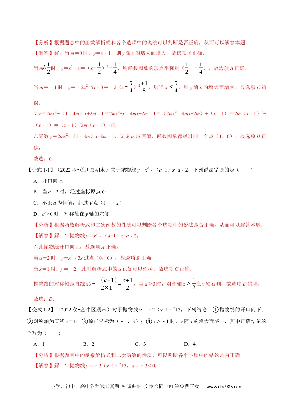 小学、初中、高中各种试卷真题知识归纳文案合同PPT等免费下载www.doc985.com专题22.3二次函数的性质【六大题型】【人教版】【题型1利用二次函数的性质判断结论】........................................................................................................................1【题型2利用二次函数的性质比较函数值】....................................................................................................................4【题型3二次函数的对称性的应用】................................................................................................................................6【题型4利用二次函数的性质求字母的范围】................................................................................................................7【题型5利用二次函数的性质求最值】............................................................................................................................9【题型6二次函数给定范围内的最值问题】..................................................................................................................12【题型1利用二次函数的性质判断结论】【例1】(2022•新华区校级一模)已知函数y=2mx2+(14﹣m)x+2m1﹣,下列结论错误的是()A.当m=0时,y随x的增大而增大B.当m¿12时,函数图象的顶点坐标是(12,−14)C.当m=﹣1时,若x<54,则y随x的增大而减小D.无论m取何值,函数图象都经过同一个点小学、初中、高中各种试卷真题知识归纳文案合同PPT等免费下载www.doc985.com【分析】根据题意中的函数解析式和各个选项中的说法可以判断是否正确,从而可以解答本题.【解答】解:当m=0时,y=x1﹣,则y随x的增大而增大,故选项A正确,当m¿12时,y=x2﹣x=(x−12)2−14,则函数图象的顶点坐标是(12,−14),故选项B正确,当m=﹣1时,y=﹣2x2+5x3﹣=﹣2(x−54)2+18,则当x<54,则y随x的增大而增大,故选项C错误, y=2mx2+(14﹣m)x+2m1﹣=2mx2+x4﹣mx+2m1﹣=(2mx24﹣mx+2m)+(x1﹣)=2m(x1﹣)2+(x1﹣)=(x1﹣)[2m(x1﹣)+1],∴函数y=2mx2+(14﹣m)x+2m1﹣,无论m取何值,函数图象都经过同一个点(1,0),故选项D正确,故选:C.【变式1-1】(2022秋•遂川县期末)关于抛物线y=x2﹣(a+1)x+a2﹣,下列说法错误的是()A.开口向上B.当a=2时,经过坐标原点OC.不论a为何值,都过定点(1,﹣2)D.a>0时,对称轴在y轴的左侧【分析】根据函数解析式和二次函数的性质可以判断各个选项中的说法是否正确,从而可以解答本题.【解答】解: 抛物线y=x2﹣(a+1)x+a2﹣,∴此抛物线开口向上,故选项A正确,当a=2时,y=x23﹣x过点(0,0),故选项B正确,当x=1时,y=﹣2,此时解析式中的a正好可以消掉,故选项C正确,抛物线的对称轴是直线x¿−−(a+1)2×1=a+12,当a>0时,对称轴x>12在y轴右侧,故选项D错误,故选:D.【变式1-2】(2022秋•金牛区期末)对于抛物线y=﹣2(x+1)2+3,下列结论:①抛物线的开口向下;②对称轴为直线x=1:③顶点坐标为(﹣1,3);④x>﹣1时,y随x的增大而减小,其中正确结论的个数为()A.1B.2C.3D.4【分析】根据题目中的函数解析式和二次函数的性质,可以判断各个小题中的结论是否正确.【解答】解: 抛物线y=﹣2(x+1)2+3,a=﹣2<0,小学、初中、高中各种试卷真题知识归纳文案合同PPT等免费下载www.doc985.com∴抛物线的开口向下,故①正确,对称轴是直线x=﹣1,故②错误,顶点坐标为(﹣1,3),故③正确,x>﹣1时,y随x的增大而减小,故④正确,故选:C.【变式1-3】(2022•赤壁市一模)对于二次函数y=x22﹣mx3﹣,有下列结论:①它的图象与x轴有两个交点;②如果当x≤1﹣时,y随x的增大而减小,则m=﹣1;③如果将它的图象向左平移3个单位后过原点,则m=1;④如果当x=2时的函数值与x=8时的函数值相等,则m=5.其中一定正确的结论是①③④.(把你认为正确结论的序...