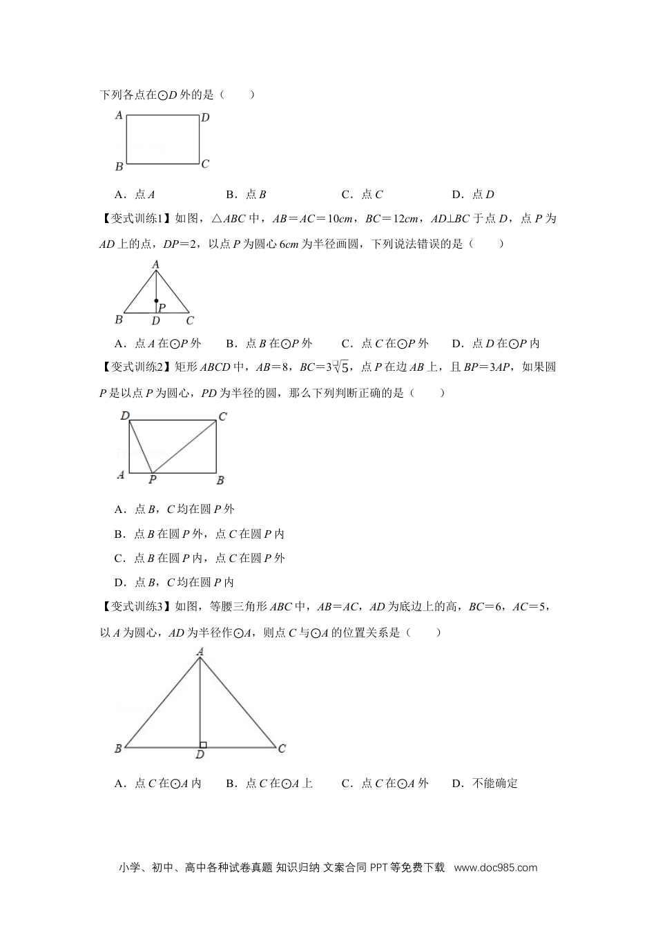 小学、初中、高中各种试卷真题知识归纳文案合同PPT等免费下载www.doc985.com专题24.2点和圆、直线和圆的位置关系目录点和圆的位置关系....................................................................................................................................1取值范围......................................................................................................................................................2最值问题......................................................................................................................................................3直线和圆的位置关系...............................................................................................................................4取值范围......................................................................................................................................................5切线求角度.................................................................................................................................................5切线求长度.................................................................................................................................................7切线的判定.................................................................................................................................................8切线长定理.................................................................................................................................................9三角形的内切圆......................................................................................................................................10证明综合....................................................................................................................................................11点和圆的位置关系【例1】已知⊙O的半径为5,OA=4,则点A在()A.⊙O内B.⊙O上C.⊙O外D.无法确定【变式训练1】已知⊙O的半径为3,平面内有一点到圆心O的距离为5,则此点可能在()A.⊙O内B.⊙O外C.⊙O上D.以上都有可能【变式训练2】已知,点A为⊙O所在平面上一点,且点A到⊙O上所有点的距离中,最长为5,最短为1,则⊙O的半径为()A.2B.2.5C.3D.2或3【变式训练3】已知⊙O的半径为5,点A在⊙O外,则OA长度可能是()A.2.5B.4C.5D.7【例2】如图,在矩形ABCD中,AB=6,AD=8,若以点D为圆心,8为半径作⊙D,则①点在圆内点到圆心的距离小于半径②点在圆上点到圆心的距离等于半径③点在圆外点到圆心的距离大于半径小学、初中、高中各种试卷真题知识归纳文案合同PPT等免费下载www.doc985.com下列各点在⊙D外的是()A.点AB.点BC.点CD.点D【变式训练1】如图,△ABC中,AB=AC=10cm,BC=12cm,AD⊥BC于点D,点P为AD上的点,DP=2,以点P为圆心6cm为半径画圆,下列说法错误的是()A.点A在⊙P外B.点B在⊙P外C.点C在⊙P外D.点D在⊙P内【变式训练2】矩形ABCD中,AB=8,BC=3❑√5,点P在边AB上,且BP=3AP,如果圆P是以点P为圆心,PD为半径的圆,那么下列判断正确的是()A.点B,C均在圆P外B.点B在圆P外,点C在圆P内C.点B在圆P内,点C在圆P外D.点B,C均在圆P内【变式训练3】如图,等腰三角形ABC中,AB=AC,AD为底边上的高,BC=6,AC=5,以A为圆心,AD为半径作⊙A,则点C与⊙A的位置关系是()A.点C在⊙A内B.点C在⊙A上C.点C在⊙A外D.不能确定小学、初中、高中各种试卷真题知识归纳文案合同PPT等免费下载www.doc985.com取值范围【例3】如图,在Rt△ABC中,∠C=90°,AC=4,BC=7,点D在边BC上,CD=3,以点D为圆心作⊙D,其半径长为r,要使点A恰在⊙D外,点B在⊙D内,那么r的取值范围是()A.4<r...