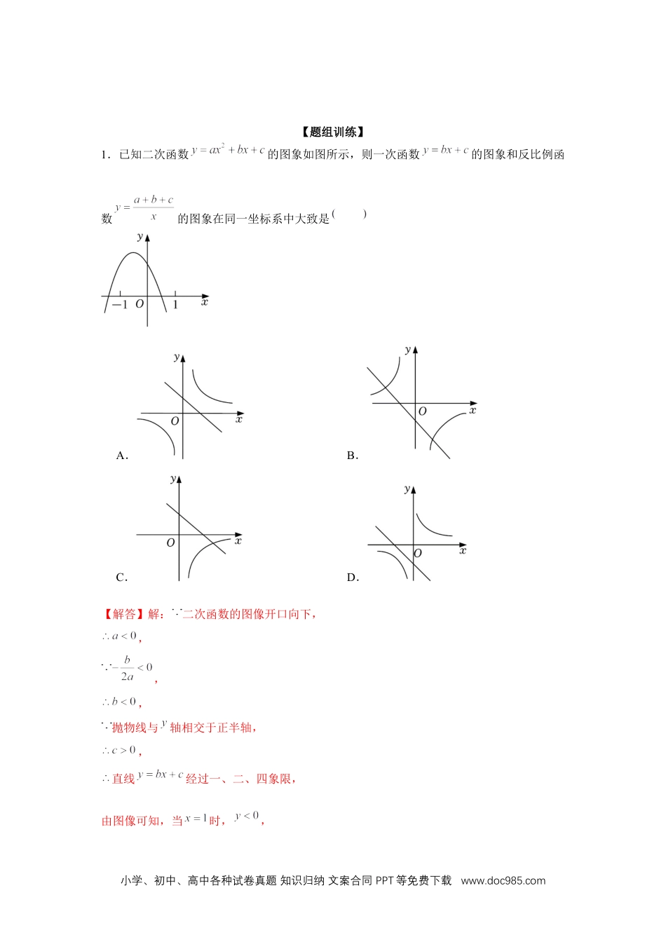 小学、初中、高中各种试卷真题知识归纳文案合同PPT等免费下载www.doc985.com专题22.2二次函数与图象共存问题【例题精讲】【例1】二次函数与一次函数在同一平面直角坐标系中的图象可能是A.B.C.D.【解答】解:二次函数,对称轴为直线,一次函数,当,则,直线与二次函数的对称轴交于轴上同一点,故、、不合题意,、由抛物线可知,,,得,由直线可知,,,故本选项正确;故选:.小学、初中、高中各种试卷真题知识归纳文案合同PPT等免费下载www.doc985.com【题组训练】1.已知二次函数的图象如图所示,则一次函数的图象和反比例函数的图象在同一坐标系中大致是A.B.C.D.【解答】解:二次函数的图像开口向下,,,,抛物线与轴相交于正半轴,,直线经过一、二、四象限,由图像可知,当时,,小学、初中、高中各种试卷真题知识归纳文案合同PPT等免费下载www.doc985.com,反比例函数的图像必在二、四象限,故、、错误,正确;故选:.2.二次函数的图象如图所示,则一次函数的图象不经过A.第一象限B.第二象限C.第三象限D.第四象限【解答】解:根据函数图象得:,,,,故一次函数的图象不经过第四象限.故选:.3.二次函数的图象如图所示,则一次函数的图象不经过A.第一象限B.第二象限C.第三象限D.第四象限【解答】解:由二次函数的图象可得,小学、初中、高中各种试卷真题知识归纳文案合同PPT等免费下载www.doc985.com,,,一次函数的图象经过第一、二、三象限,不经过第四象限,故选:.4.在同一平面直角坐标系中,,函数与的图象可能正确的有个A.0B.1C.2D.3【解答】解:当时,则函数中,随的增大而增大,函数开口向上,故①正确,④错误;当时,则函数中,随的增大而减小,函数开口向下,故③不正确,②正确;两函数图象可能是①②,故选:.5.函数与的图象可能是A.B.C.D.【解答】解:由函数与抛物线可知两函数图象交轴上同一点小学、初中、高中各种试卷真题知识归纳文案合同PPT等免费下载www.doc985.com,抛物线的对称轴为直线,在轴的左侧,、抛物线的对称轴在轴的右侧,故选项错误;、抛物线的对称轴在轴的右侧,故选项错误;、由一次函数的图象可知,由二次函数的图象知道,且交于轴上同一点,故选项正确;、由一次函数的图象可知,由二次函数的图象知道,故选项错误;故选:.6.已知一次函数的图象如图,则二次函数在平面直角坐标系中的图象可能是A.B.C.D.【解答】解:观察函数图象可知:、,小学、初中、高中各种试卷真题知识归纳文案合同PPT等免费下载www.doc985.com二次函数的图象对称轴,与轴的交点在轴正正半轴.故选:.7.在同一平面直角坐标系中,一次函数与二次函数的大致图象可以是A.B.C.D.【解答】解:由可知抛物线的开口向上,故不合题意;二次函数与轴交于负半轴,则,,一次函数的图象经过经过第一、二、三象限,选项符合题意,、不符合题意;故选:.8.一次函数与二次函数在同一个平面坐标系中图象可能是A.B.C.D.小学、初中、高中各种试卷真题知识归纳文案合同PPT等免费下载www.doc985.com【解答】解:一次函数和二次函数都经过轴上的,两个函数图象交于轴上的同一点,故不符合题意;当时,二次函数的图象开口向上,一次函数中值随值的增大而增大,故不符合题意;当时,二次函数的图象开口向下,一次函数中值随值的增大而减小,故不符合题意.故选:.9.一次函数与二次函数在同一平面直角坐标系中的图象可能是A.B.C.D.【解答】解:、由抛物线可知,,,,由直线可知,,,故本选项不合题意;、由抛物线可知,,,,由直线可知,,,故本选项不合题意;、由抛物线可知,,,,由直线可知,,,故本选项不合题意;、由抛物线可知,,,,由直线可知,,,故本选项符合题意.故选:.小学、初中、高中各种试卷真题知识归纳文案合同PPT等免费下载www.doc985.com10.一次函数与二次函数在同一平面直角坐标系中的大致图象可能是A.B.C.D.【解答】解:、由抛物线可知,,,得,由直线可知,,,故本选项不符合题意;、由抛物线可知,,,得,由直线可知,,,故本选项符合题意;、由抛物线可知,,,得,由直线可知,...