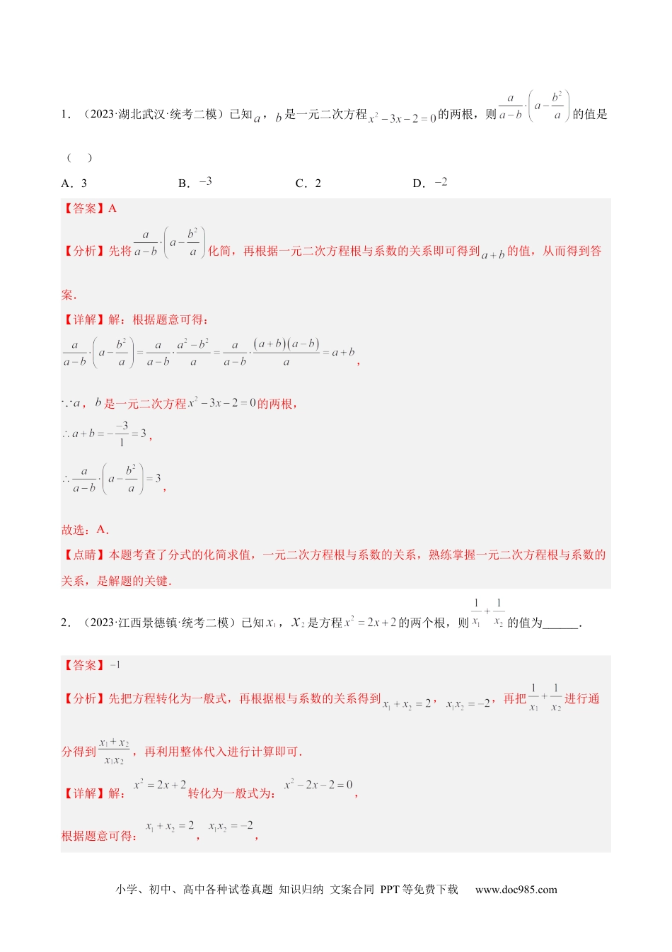 小学、初中、高中各种试卷真题知识归纳文案合同PPT等免费下载www.doc985.com专题02一元二次方程根与系数的关系重难点题型专训【题型目录】题型一利用根与系数的关系直接求代数式的值题型二利用根与系数的关系间接求代数式的值题型三利用根与系数的关系降次求代数式的值题型四构造一元二次方程求代数式的值题型五由两根关系求方程字母系数题型六根与系数关系的新定义问题题型七一元二次方程根与系数的关系综合【知识梳理】如果一元二次方程()的两根为那么,就有比较等式两边对应项的系数,得①式与②式也可以运用求根公式得到.人们把公式①与②称之为韦达定理,即根与系数的关系.因此,给定一元二次方程就一定有①与②式成立.反过来,如果有两数满足①与②,那么这两数必是一个一元二次方程的根.利用这一基本知识常可以简捷地处理问题.利用根与系数的关系,我们可以不求方程的根,而知其根的正、负性.在的条件下,我们有如下结论:当时,方程的两根必一正一负.若,则此方程的正根不小于负根的绝对值;若,则此方程的正根小于负根的绝对值.当时,方程的两根同正或同负.若,则此方程的两根均为正根;若,则此方程的两根均为负根.⑴韦达定理(根与系数的关系):如果的两根是,,则,.(隐含的条件:)⑵若,是的两根(其中),且为实数,当时,一般地:①,②且,③且,特殊地:当时,上述就转化为有两异根、两正根、两负根的条件.⑶以两个数为根的一元二次方程(二次项系数为1)是:.⑷其他:①若有理系数一元二次方程有一根,则必有一根(,为有理数).小学、初中、高中各种试卷真题知识归纳文案合同PPT等免费下载www.doc985.com②若,则方程必有实数根.③若,方程不一定有实数根.④若,则必有一根.⑤若,则必有一根.⑸韦达定理(根与系数的关系)主要应用于以下几个方面:①已知方程的一个根,求另一个根以及确定方程参数的值;②已知方程,求关于方程的两根的代数式的值;③已知方程的两根,求作方程;④结合根的判别式,讨论根的符号特征;⑤逆用构造一元二次方程辅助解题:当已知等式具有相同的结构时,就可以把某两个变元看作某个一元二次方程的两根,以便利用韦达定理;⑤利用韦达定理求出一元二次方程中待定系数后,一定要验证方程的.一些考试中,往往利用这一点设置陷阱.【经典例题一利用根与系数的关系直接求代数式的值】【例1】(2023·天津河北·统考二模)已知一元二次方程有两个实数根,则的值为()A.6B.2C.4D.3【答案】B【分析】先根据根与系数的关系得,然后利用整体代入的方法计算.【详解】解:根据根与系数的关系得,所以.故选:B.【点睛】本题考查了根与系数的关系:若是一元二次方程的两根时,.【变式训练】小学、初中、高中各种试卷真题知识归纳文案合同PPT等免费下载www.doc985.com1.(2023·湖北武汉·统考二模)已知,是一元二次方程的两根,则的值是()A.3B.C.2D.【答案】A【分析】先将化简,再根据一元二次方程根与系数的关系即可得到的值,从而得到答案.【详解】解:根据题意可得:,,是一元二次方程的两根,,,故选:A.【点睛】本题考查了分式的化简求值,一元二次方程根与系数的关系,熟练掌握一元二次方程根与系数的关系,是解题的关键.2.(2023·江西景德镇·统考二模)已知,是方程的两个根,则的值为______.【答案】【分析】先把方程转化为一般式,再根据根与系数的关系得到,,再把进行通分得到,再利用整体代入进行计算即可.【详解】解:转化为一般式为:,根据题意可得:,,小学、初中、高中各种试卷真题知识归纳文案合同PPT等免费下载www.doc985.com∴,故答案为:.【点睛】本题考查一元二次方程的根与系数的关系、整体代入求值,熟练掌握一元二次方程的根与系数的关系得到,是解题的关键.3.(2022春·八年级单元测试)已知,是方程的两实数根,求:(1),(2)的值.【答案】(1)10(2)30【分析】(1)由,是方程的两实数根,得出,,由,代入相关数据即可得;(2)代入即可.【详解】(1)解: ,是方程的两实数根,∴,,∴,∴;(2)解: ,是方程的两实数根,小学、初中、高中各种试卷真题知识归...