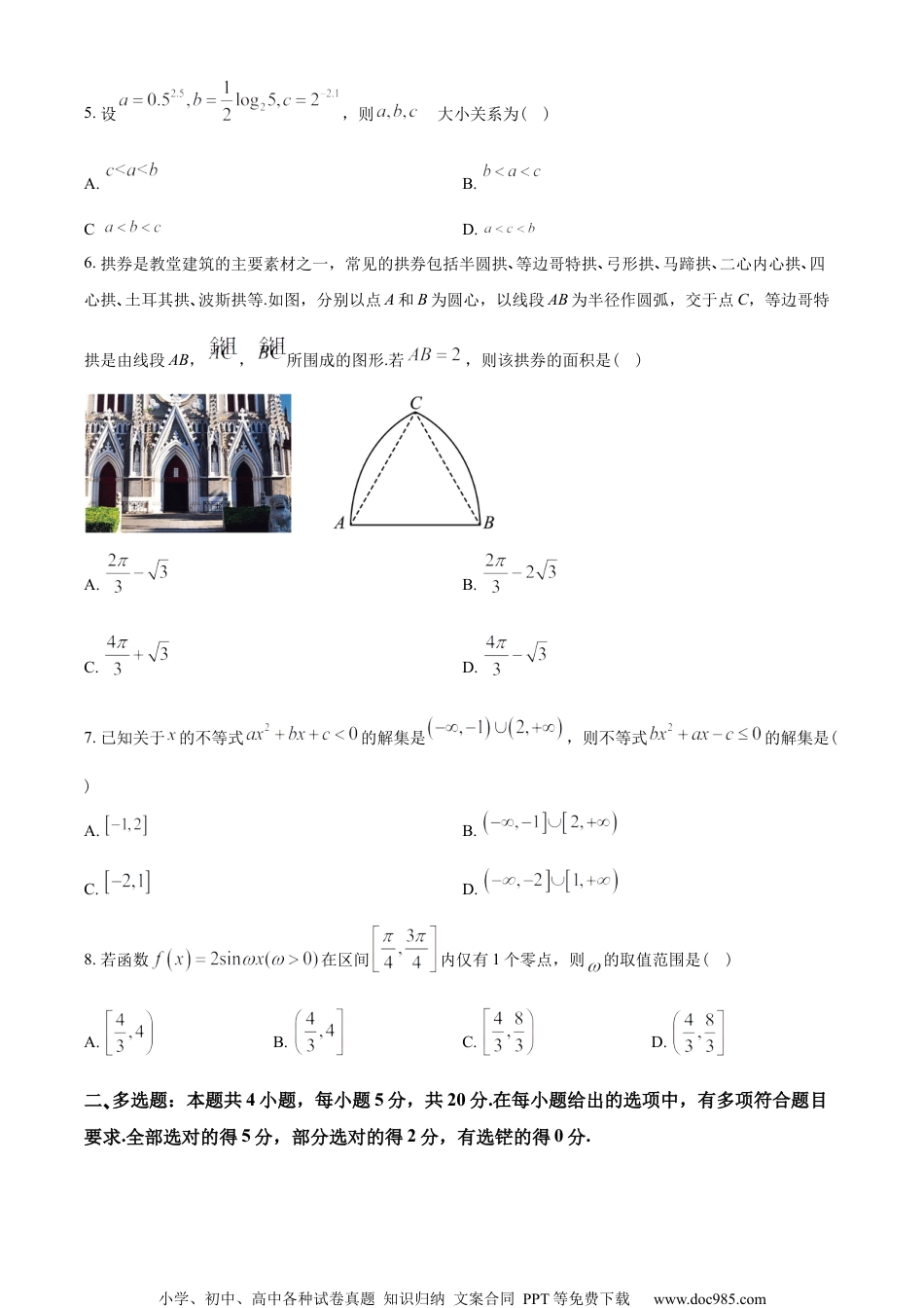 小学、初中、高中各种试卷真题知识归纳文案合同PPT等免费下载www.doc985.com2022~2023学年度第一学期期末抽测高一年级数学试题注意事项:1.答卷前,考生务必将自己的姓名考生号等填写在答题卡和试卷指定位置上、.2.回答选择题时,选出每小题答案后,用铅笔把答题卡上对应题目的答案标号涂黑.如需改动,用橡皮擦干净后,再选涂其它答案标号.回答非选择题时,将答案写在答题卡上.写在本试卷上无效.3.考试结束后,将本试卷和答题卡一并交回.一选择题:本题共、8小题,每小题5分,共40分.在每小题给出的四个选项中,只有一项是符合题目要求的.1.命题“”的否定是()A.B.C.D.2.已知集合,则()A.B.C.D.3.已知函数,角终边经过与图象的交点,则()A.1B.C.D.4.“”是“”的()A.充分必要条件B.充分条件C.必要条件D.既不充分又不必要条件小学、初中、高中各种试卷真题知识归纳文案合同PPT等免费下载www.doc985.com5.设,则的大小关系为()A.B.C.D.6.拱券是教堂建筑的主要素材之一,常见的拱券包括半圆拱、等边哥特拱、弓形拱、马蹄拱、二心内心拱、四心拱、土耳其拱、波斯拱等.如图,分别以点A和B为圆心,以线段AB为半径作圆弧,交于点C,等边哥特拱是由线段AB,,所围成的图形.若,则该拱券的面积是()A.B.C.D.7.已知关于的不等式的解集是,则不等式的解集是()A.B.C.D.8.若函数在区间内仅有1个零点,则的取值范围是()A.B.C.D.二多选题:本题共、4小题,每小题5分,共20分.在每小题给出的选项中,有多项符合题目要求.全部选对的得5分,部分选对的得2分,有选铓的得0分.小学、初中、高中各种试卷真题知识归纳文案合同PPT等免费下载www.doc985.com9.已知都是正数,且,则()A.B.C.D.10.若函数在一个周期内的图象如图所示,则()A.的最小正周期为B.的增区间是C.D.将的图象上所有点的横坐标变为原来的倍(纵坐标不变)得到的图象11.已知函数,则下列命题正确的是()A.函数是奇函数B.函数在区间上存在零点C.当时,D.若,则12.悬链线是平面曲线,是柔性链条或缆索两端固定在两根支柱顶部,中间自然下垂所形成的外形.在工程小学、初中、高中各种试卷真题知识归纳文案合同PPT等免费下载www.doc985.com中有广泛的应用,例如县索桥双曲拱桥架空电缆都用到了悬链线的原理、、.当微积分尚未出现的伽利略时期,伽利略猜测这种形状是抛物线.直到1691年莱布尼兹和伯努利利用微积分推导出悬链线的方程是,其中为有关参数.这样,数学上又多了一对与有关的著名函数——双曲函数:双曲正弦函数和双曲余弦函数.则()A.B.C.D.三填空题:本题共、4小题,每小题5分,共20分.13.函数的定义域为__________.14.已知,则的值为__________.15.已知正数满足,则的最小值为__________.16.已知函数是定义在上的奇函数,当时,,则的解集是__________.四解答题:本题、6小题,共70分.解答应写出文字说明证明过程或演算步骤、.17.已知集合.(1)若,求;(2)若,求实数的取值范围.小学、初中、高中各种试卷真题知识归纳文案合同PPT等免费下载www.doc985.com18.已知,且.求下列各式的值:(1):(2).19.已知函数.(1)求函数的值域;(2)若关于的不等式恒成立,求实数的取值范围.20.“硬科技”是以人工智能航空航天生物技术光电芯片信息技术新材料新能源智能制造等为代表的、、、、、、、高精尖科技,属于由科技创新构成的物理世界,是需要长期研发投入持续积累才能形成的原创技术,具、有极高技术门槛和技术壁垒,难以被复制和模仿最近十年,我国的一大批自主创新的企业都在打造自己、的科技品牌,某高科技企业自主研发了一款具有自主知识产权的高级设备,并从2023年起全面发售.经测算,生产该高级设备每年需投入固定成本1000万元,每生产x百台高级设备需要另投成本万元,且每百台高级设备售价为160万元,假设每年生产的高级设备能够全部售出,且高级设备年产展最大为10000台.(1)求企业获得年利润(万元)关于年产量(百台)的函数关系式;(2)当年产量为多少时,企业所获年利润最大?并求最大年利润.21.已知函数的图象与x轴的两个相邻交点之间的距离为,直线是的图象的一条对称轴.(1)求函数的解析式;小学、初中、高中各种试卷真题知识归纳文案合同PPT...