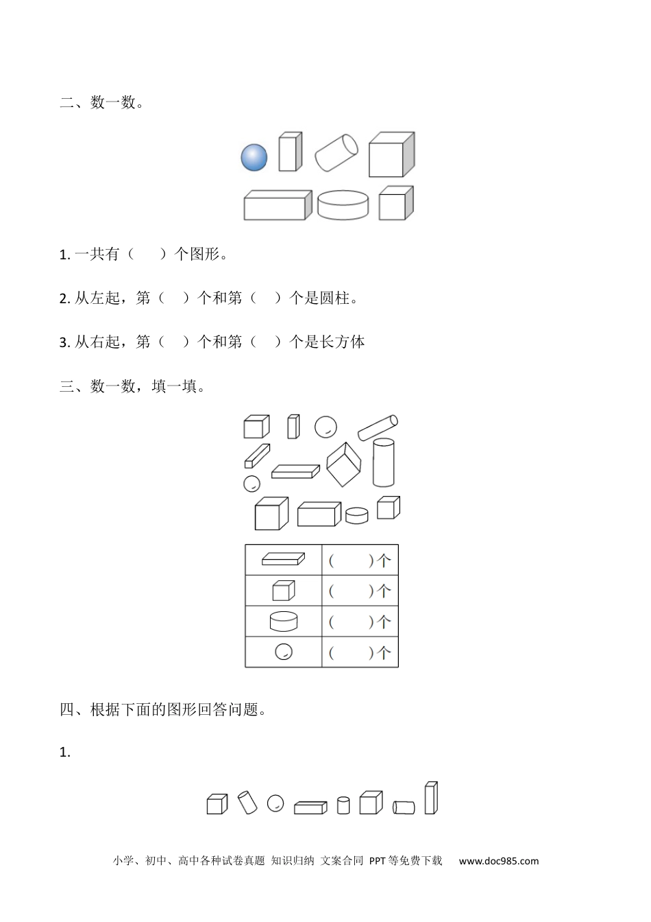 小学、初中、高中各种试卷真题知识归纳文案合同PPT等免费下载www.doc985.com第四单元认识图形(一)本课导学知识点:知识点:感知长方体、正方体、圆柱和球的特征,能说出这些形体的名称。在正方体的下面画“√”特别提醒::正方体的看起来是方方的,所有的边都相等。【快乐训练营】一、连一连。长方体正方体圆柱球小学、初中、高中各种试卷真题知识归纳文案合同PPT等免费下载www.doc985.com二、数一数。1.一共有()个图形。2.从左起,第()个和第()个是圆柱。3.从右起,第()个和第()个是长方体三、数一数,填一填。四、根据下面的图形回答问题。1.小学、初中、高中各种试卷真题知识归纳文案合同PPT等免费下载www.doc985.com(1)有()个正方体,()个圆柱。(2)有()个长方体,()个球。(3)从右边起,第()个是球,第()个和第()个是正方体。2.(1)从右数,第()个是,第()和第()个是。(2)左边的一个图形是(),右边的一个图形是()【知识加油站】五、请你找出用右侧哪一个物体可以画出左侧的图形,用笔圈出来。六、数一数。小学、初中、高中各种试卷真题知识归纳文案合同PPT等免费下载www.doc985.com七、数一数,填一填。1.最多的是()。小学、初中、高中各种试卷真题知识归纳文案合同PPT等免费下载www.doc985.com2.最少的是()。3.再添()个就和的个数同样多。八、下面的图形中各有几个正方体?【我来纠错】参考答案第四单元认识图形(一)小学、初中、高中各种试卷真题知识归纳文案合同PPT等免费下载www.doc985.com二、1.72.363.36三、4422四、1.(1)23(2)21(3)6382.(1)215(2)(3)五、略六、1.32532.64433.5134七、八、4644