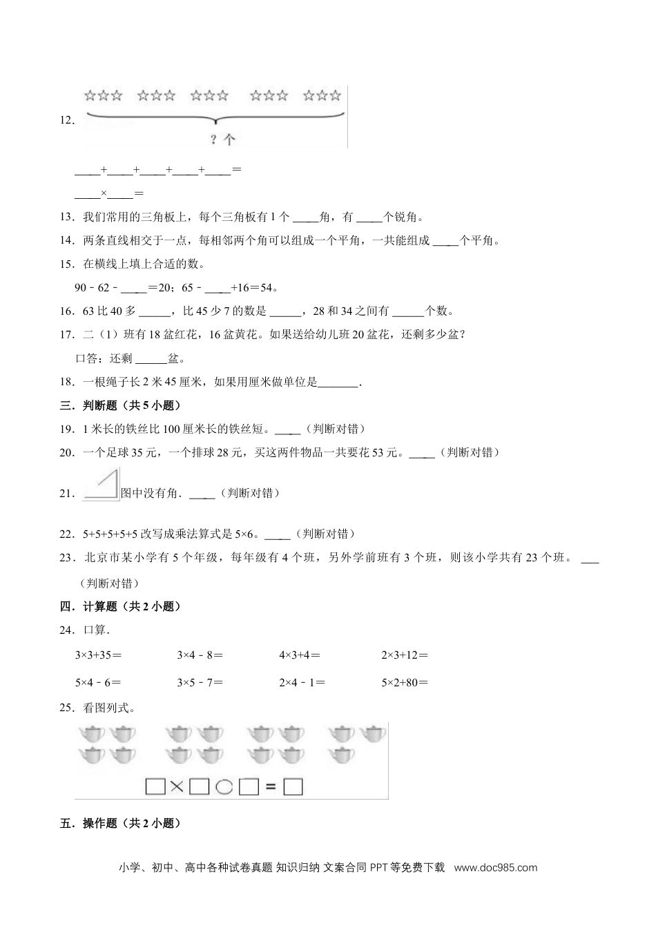 2022-2023学年人教版二年级数学上册期中试卷一.选择题(共8小题)1.长度接近20厘米的是()A.粉笔B.筷子C.跳绳2.可以用测量物体长度单位的是()A.时B.角C.分D.米3.妈妈有100元钱,买水果用去36元,买青菜用去8元,妈妈一共用去了()元钱。A.56B.46C.44D.344.食堂里原有42棵白菜,吃了27棵,又买来35棵。现在食堂里有多少棵白菜?下面列式正确的是()A.42+27﹣35B.42﹣27+35C.42+27+355.下面说法中,错误的个数是()(1)6点零5分,钟面上时针与分针所组成的角是平角;(2)因为直线没有端点,所以它无法量出长度。A.0B.1C.26.方桌上的直角和三角尺上的直角相比,()A.方桌上的直角大B.三角尺上的直角大C.一样大7.壮壮吃了5个,求还剩多少个.下面算式正确的是()A.3+3﹣5B.3×3﹣5C.3×3+58.小明吃了7个,还剩多少个?下面算式正确的是()A.4+3﹣7B.4×3+7C.4×3﹣7二.填空题(共10小题)9.在计算45﹣8+13时,先算法,再算法,结果是.10.6×5+4先算,再算。11.3个4比2个4多,比4个4少。小学、初中、高中各种试卷真题知识归纳文案合同PPT等免费下载www.doc985.com12.++++=×=13.我们常用的三角板上,每个三角板有1个角,有个锐角。14.两条直线相交于一点,每相邻两个角可以组成一个平角,一共能组成个平角。15.在横线上填上合适的数。90﹣62﹣=20;65﹣+16=54。16.63比40多,比45少7的数是,28和34之间有个数。17.二(1)班有18盆红花,16盆黄花。如果送给幼儿班20盆花,还剩多少盆?口答:还剩盆。18.一根绳子长2米45厘米,如果用厘米做单位是.三.判断题(共5小题)19.1米长的铁丝比100厘米长的铁丝短。(判断对错)20.一个足球35元,一个排球28元,买这两件物品一共要花53元。(判断对错)21.图中没有角.(判断对错)22.5+5+5+5+5改写成乘法算式是5×6。(判断对错)23.北京市某小学有5个年级,每年级有4个班,另外学前班有3个班,则该小学共有23个班。(判断对错)四.计算题(共2小题)24.口算.3×3+35=3×4﹣8=4×3+4=2×3+12=5×4﹣6=3×5﹣7=2×4﹣1=5×2+80=25.看图列式。五.操作题(共2小题)小学、初中、高中各种试卷真题知识归纳文案合同PPT等免费下载www.doc985.com26.在下面的图形中增加一条线段,使它增加3个直角。27.画一条比12厘米少8厘米的线段。六.应用题(共5小题)28.可爱的小猫.(1)一共有几只小猫?(2)每只小猫有2只耳朵,一共有多少只耳朵?29.框中一共有多少个字?30.一件上衣36元,一条裤子18元,妈妈准备拿50元钱买一件上衣和一条裤子,钱够吗?31.小红家、学校、小东家在马路的同一侧,小红家到学校65米,小东家到学校28米。小红家到小东家有多远?32.(1)一件衬衣和一副手套一共多少元?(2)一顶帽子比一件衬衣便宜多少元?小学、初中、高中各种试卷真题知识归纳文案合同PPT等免费下载www.doc985.com参考答案与试题解析一.选择题(共8小题)1.【分析】根据生活实际情况,筷子的长度接近20厘米,据此解答即可。【解答】解:根据生活实际情况,筷子的长度接近20厘米。故选:B。【点评】此类题目一定要联系实际,不能和实际情况违背。2.【分析】测量物体的长度单位有千米,米,分米,厘米,毫米,问题得到解决.【解答】解:可以用测量物体长度单位的是米.故选:D。【点评】本题考查的内容是学生对测量物体长度的单位的记忆.3.【分析】把买水果和买青菜用去的钱数相加,就是妈妈一共用去的钱数。【解答】解:36+8=44(元)答:妈妈一共用去了44元钱。故选:C。【点评】本题考查了加法的意义的实际应用,关键是明确数量之间的关系。4.【分析】根据题意,用原来的42棵白菜,减去吃的27棵,再加上有买来的35棵,就是现在的棵数,即42﹣27+35。【解答】解:42﹣27+35=15+35=50(棵)答:现在食堂里有50棵白菜。故选:B。【点评】本题关键是明确,吃的要减去,买来的要加上,然后再进一步解答。5.【分析】(1)因为钟表上的刻度是把一个圆平均分成了12等份,每一份是30°,6点零5分时,时针指向6多一点,分针指向1,时针与分针相差5.5大格,因此6点零...
