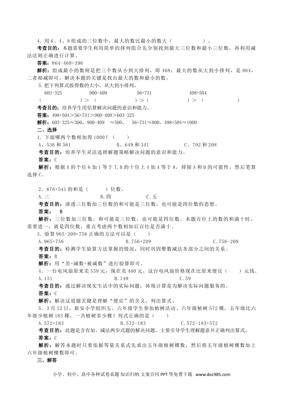 《万以内的加法和减法(二)》同步试题一、填空1.在□里填上合适的数。考查目的:这是一组基本的三位数加减三位的笔算练习,让学生巩固“从个位算起”“满十进一”“不够减退一当十”的计算法则,形成计算技能。答案:解析:第(1)题是不进位加法,第⑵题是进位加法,第⑶题是不退位减法,第⑷题是退位减法。2.算出每张卡片上的两个数的和与差。考查目的:熟练掌握进位加法和连续退位减法的计算。答案:和775和731和821差539差219差183解析:本题根据整数加法与减法的运算法则计算出每张卡片上的两个数的和与差即可。3.填表。总数量卖出还剩37989576157174265考查目的:让学生进一步巩固所学知识,同时体会计算在实际生活中的价值。答案:290,419,439。解析:根据加减法的意义和总量与部分量之间的数量关系,分别列出“379-89”“576-157”“174+265”。小学、初中、高中各种试卷真题知识归纳文案合同PPT等免费下载www.doc985.com4.用6、4、8组成的三位数中,最大的数比最小的数大()。考查目的:本题需要学生利用简单的排列组合先分别找到最大三位数和最小三位数,再利用减法法则正确进行计算。答案:864-468=396解析:组成最小的数则是把三个数从小到大排列,即468;最大的数从大到小排列,是864,二者相减即可,解决本题的关键是找出最大的数和最小的数。5.把下列算式按得数的大小,从大到小排列。603-325900-40956+731498+504()>()>()>()考查目的:培养学生用估算解决问题的意识和能力。答案:498+504>56+731>900-409>603-325解析:603-325≈300,900-409≈500,56+731≈800,498+504≈1000二、选择1.下面哪两个数相加得1000?()A、536和361B、649和341C、792和208考查目的:培养学生灵活选择解题策略解决问题的意识和能力。答案:C解析:根据A的个位6加1等于7,B的十位上4加4等于8,排除A和B的可能性,然后笔算选择C。2.678+541的和是()位数。A.三B.四C.五考查目的:渗透三位数加三位数的和可能是三位数,也可能是四位数的思想。答案:B解析:三位数加三位数,和可能是三位数,也可能是四位数。本题百位上的数的和满十时,需要进一,就是四位数,重点考虑两个数相加后百位是否满十。3.验算965-209=756正确的方法可以是()A.965+756B.756+209C.756-209考查目的:检测学生验算方法掌握的情况,同时巩固整数减法各部分之间的关系。答案:B解析:用“差+减数=被减数”进行验算即可。4.一台电风扇原来卖539元,现在卖480元。这台电风扇价格现在比原来便宜()元钱。A.131B.149C.59考查目的:通过解决现实生活中的实际问题,体现计算是为解决实际问题服务的。答案:C解析:解决这道题关键是理解“便宜”的含义,列出算式。5.3月12日,新安小学组织五、六年级学生参加植树活动。六年级植树572棵,五年级比六年级少植树183棵,一共植树多少棵?列式正确的是()A.572+183B.572-183C.572-183+572考查目的:此题是含有加、减法两步式题的解决问题,主要引导学生理解题意并正确列出算式。答案:C解析:解答本题时只要依据等量关系式先求出五年级植树棵数,然后将五年级植树棵数加上六年级植树棵数即可。三、解答小学、初中、高中各种试卷真题知识归纳文案合同PPT等免费下载www.doc985.com1.笔算下列各题,并验算。801-564605-31975+508258+389考查目的:此题主要考查整数加、减法的笔算、验算方法。答案:略解析:根据整数加、减法的计算法则笔算即可;加法的验算:交换两个加数的位置再加一遍;减法的验算:用差加减数看是否等于被减数。2.下面的计算正确吗?把错误的改正过来。考查目的:本题是针对学生学习中容易出现的错误选编,如相同数位没有对齐、忘记加进上来的1、忘记减去已经借走的1等等。目的是让学生在辨析错误和改正错误中进一步明确算理,熟练掌握计算方法。答案:××××解析:(1)错误,相同数位没有对齐。(2)错误,在计算十位时,没向百位进一。(3)错误,在计算个位时,向十位借一,十位被借后没有退一。(4)错误,十位向百位借一后,百位7没有退一。3.估一估,按要求连一连。考查目的:此题主要是培养学生的估算意识,掌握...