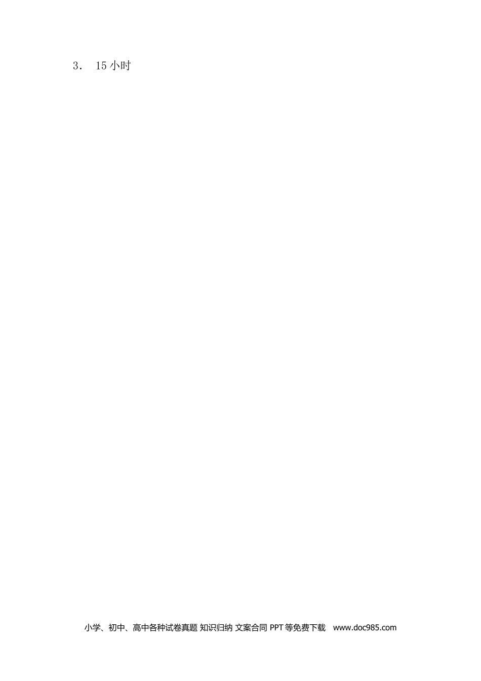 6.324时计时法1.写出时刻(1)用24时记时法表示出下列的时刻。凌晨5时晚上9时上午9时下午4时中午12时晚上12时(2)用普通记时法表示下列的时刻。6时11时14时16时19时23时2.根据箭头所指时刻,填出经过时间。(1)(2)(3)3.应用题。一个广播电台每天播音时间如下:第一次:5:30——10:30第二次:11:00——14:30第三次:16:30——23:00全天一共播音多少时间?参考答案1.(1)5:0021:009:0016:0012:0024:00(0:00)(2)凌晨6:00中午11:00下午2:00下午4:00晚上7:00晚上11:002.(1)6小时,2小时(2)3小时,2小时,4小时(3)1小时,5小时小学、初中、高中各种试卷真题知识归纳文案合同PPT等免费下载www.doc985.com3.15小时小学、初中、高中各种试卷真题知识归纳文案合同PPT等免费下载www.doc985.com
