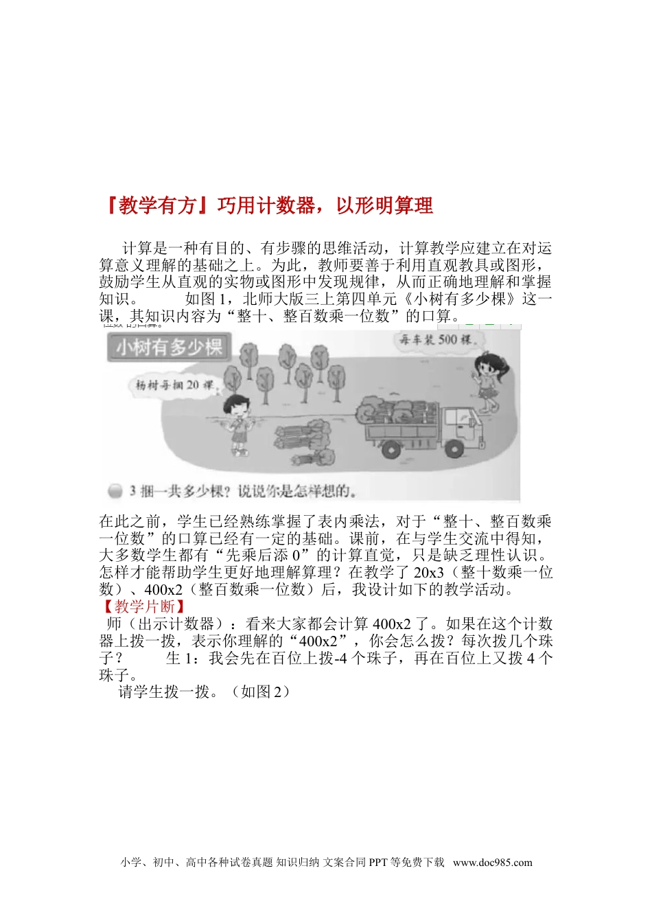 『教学有方』巧用计数器,以形明算理计算是一种有目的、有步骤的思维活动,计算教学应建立在对运算意义理解的基础之上。为此,教师要善于利用直观教具或图形,鼓励学生从直观的实物或图形中发现规律,从而正确地理解和掌握知识。如图1,北师大版三上第四单元《小树有多少棵》这一课,其知识内容为“整十、整百数乘一位数”的口算。在此之前,学生已经熟练掌握了表内乘法,对于“整十、整百数乘一位数”的口算已经有一定的基础。课前,在与学生交流中得知,大多数学生都有“先乘后添0”的计算直觉,只是缺乏理性认识。怎样才能帮助学生更好地理解算理?在教学了20x3(整十数乘一位数)、400x2(整百数乘一位数)后,我设计如下的教学活动。【教学片断】师(出示计数器):看来大家都会计算400x2了。如果在这个计数器上拨一拨,表示你理解的“400x2”,你会怎么拨?每次拨几个珠子?生1:我会先在百位上拨-4个珠子,再在百位上又拨4个珠子。请学生拨一拨。(如图2)小学、初中、高中各种试卷真题知识归纳文案合同PPT等免费下载www.doc985.com师:为什么在百位上拨2次,每次拨4个珠子就可以了?生1:因为百位上每一个珠子都表示1个百。师:那你能否结合计数器拨珠子的活动,来解释一下你是怎样计算“400x2”?生1:就是直接用“4x2”,再在后面添上2个“0”。因为这里的“4”表示的是4个百,所以结果就是8个百。师:你分析得很有道理。(课件出示图3)那下面这三幅图分别可以用什么乘法算式来表示?根据学生的回答,教师板书三个乘法算式:40x2、4x2、4000x2。师(课件呈现图4):观察这4幅图和算式,它们都有什么相同之处?小学、初中、高中各种试卷真题知识归纳文案合同PPT等免费下载www.doc985.com生2:都是表示乘法算式。生3:都有8个珠子,分2次拨。师:有什么不同之处?生4:算式不同。生5:算珠所在的位置不同。生6:每幅图中的4表示的意义不同,表示4个百的珠子就在百位上,表示价十的珠子在十位上……师:小朋友们真能干,一下看出了问题的本质。图上的4个算式虽然不同,但是在计算时都用到了4x2=8。至于是8个十还是8个百,就要看这个4表示的意义了。【教学思考】本节课,虽然经过前面的学习,学生已经掌握了“整十、整百数乘一位数”的口算方法,但对算理的理解可能并不透彻。因此,笔者补充了上面的活动。通过问题引发学生思考,并在操作与解释中,明确了数字的位值:而之后的看计数器写算式,在相似的图形信息呈现中观察比较,进一步明确了每一幅图表示算式的实际意义,理解“整十、整百数乘一位数”的基本思路是一致的。整个过程,学生实现了“实物操作”向思维中的“算理理解”顺利过渡,不仅理解了算理,抽象思维也碍到了发展。小学、初中、高中各种试卷真题知识归纳文案合同PPT等免费下载www.doc985.com