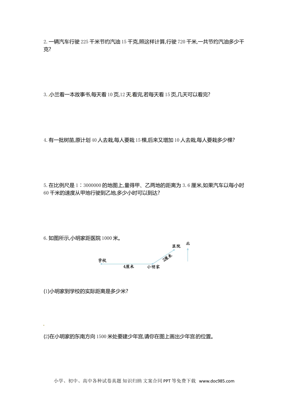 第四单元检测一、填空题。1.()÷12=18∶()==0.752.把比例8∶4=12∶6写成分数的形式是(),根据比例的基本性质,写成乘法等式是()。3.A×=2×(A≠0,B≠0),则A和B成()比例。4.在一个比例中,两个内项的积是18,一个外项是3,另一个外项是()。5.一个电子零件长4毫米,用7∶1的比例尺把它画在图纸上,应画()毫米。[来源:学科网ZXXK]6.在括号里填上适当的数。=0.6∶3=()∶187.在比例尺为1∶5000的地图上,8厘米的线段代表实际距离()米。二、判断题。(对的画“√”,错的画“✕”)1.比例尺是一把尺子。()2.A、B、C、D均不为0,如果A∶B=C∶D,那么D∶C=B∶A。()3.在一幅比例尺是1∶10000的地图上,2厘米表示200厘米。()4.圆的周长和它的面积成正比例。()5.在一个比例里,如果内项的积等于1,那么两个外项的积一定是1。()三、选择题。(把正确答案的序号填在括号里)1.下面不能组成比例的是()。A.10∶12=35∶42B.4∶3=60∶45C.20∶10=60∶202.比例尺一定,实际距离扩大到原来的5倍,则图上距离()。A.缩小到原来的B.扩大到原来的5倍C.不变3.一个长方形游泳池长50米,宽30米,选用比例尺()画出的平面图最大,选用比例尺()画出的平面图最小。A.1∶1000B.1∶1500C.1∶5004.小洋家的客厅长5米,宽3.8米,画在练习本上,选比例尺()比较合适。A.1∶10B.1∶100C.1∶10005.人的体重和身高()。[来源:学科网ZXXK]A.不成比例B.成正比例C.成反比例四、计算题。1.解比例。(12分)小学、初中、高中各种试卷真题知识归纳文案合同PPT等免费下载www.doc985.com∶=4∶x=∶x=0.4∶(2+x)∶2=21∶62.填表。图上距离实际距离比例尺3厘米450米4.2厘米1∶20000350千米1∶7000000五、解决问题。1.一箱啤酒12瓶。(1)请完成下表。箱数/箱1234…总瓶数/瓶12…(2)根据表中数据,在图中描出箱数和总瓶数对应的点,再把它们按顺序连接起来。[来源:Z§xx§k.Com](3)根据图象判断,啤酒的总瓶数和箱数成什么比例?为什么?(4)8箱啤酒有多少瓶?144瓶啤酒可以装多少箱?小学、初中、高中各种试卷真题知识归纳文案合同PPT等免费下载www.doc985.com2.一辆汽车行驶225千米节约汽油15千克,照这样计算,行驶720千米,一共节约汽油多少千克?3.小兰看一本故事书,每天看10页,12天看完,若每天看15页,几天可以看完?4.有一批树苗,原计划40人去栽,每人要栽15棵,后来又增加10人去栽,每人要栽多少棵?5.在比例尺是1∶3000000的地图上,量得甲、乙两地的距离为3.6厘米,如果汽车以每小时60千米的速度从甲地行驶到乙地,多少小时可以到达?[来源:Z_xx_k.Com]6.如图所示,小明家距医院1000米。(1)小明家到学校的实际距离是多少米?(2)在小明家的东南方向1500米处要建少年宫,请你在图上画出少年宫的位置。小学、初中、高中各种试卷真题知识归纳文案合同PPT等免费下载www.doc985.com参考答案一、1.92482.=4×12=8×63.反4.65.286.63.67.400二、1.✕2.3.✕4.✕5.三、1.C2.B3.CB4.B5.A四、1.x=x=36x=x=52.1∶15000840米5厘米五、1.(1)243648(2)略(3)正比例原因:它们的比值一定(4)96瓶12箱2.解:设一共节约汽油x千克。15∶225=x∶720x=483.解:设x天可以看完。10×12=15xx=8[来源:学科网ZXXK]4.解:设每人要栽x棵。40×15=(40+10)×xx=125.3.6×3000000=10800000(厘米)=108(千米)108÷60=1.8(时)6.(1)1000÷2×4=2000(米)(2)提示:1500÷(1000÷2)=3(厘米)在小明家东南方向画一条距离小明家3厘米的线段,标上少年宫。小学、初中、高中各种试卷真题知识归纳文案合同PPT等免费下载www.doc985.com