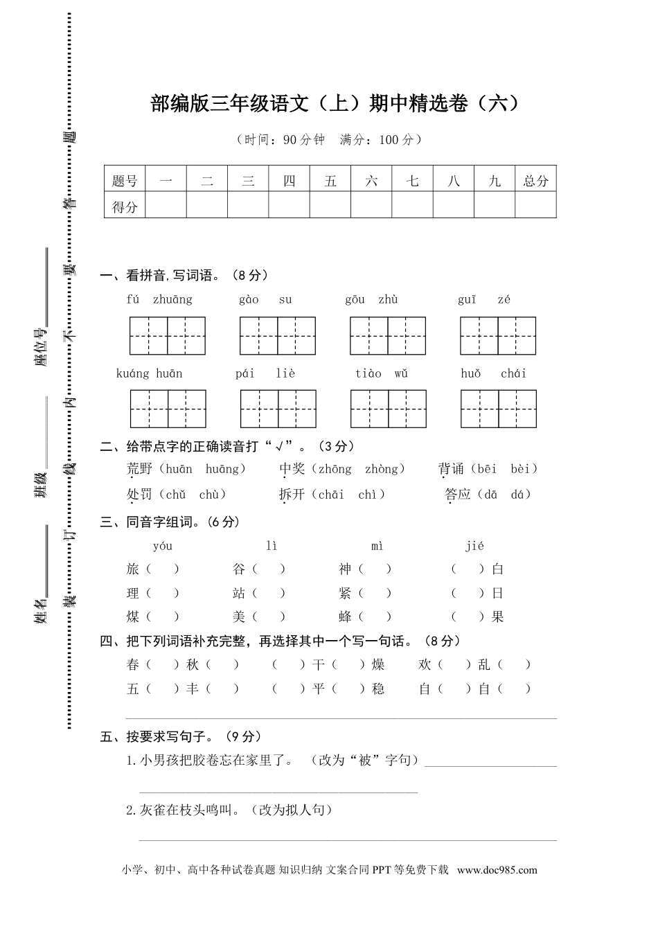 部编版三年级语文(上)期中精选卷(六)(时间:90分钟满分:100分)一、看拼音,写词语。(8分)fúzhuānggàosugōuzhùguīzékuánghuānpáiliètiàowǔhuǒchái二、给带点字的正确读音打“√”。(3分)荒野(huānhuāng)中奖(zhōngzhòng)背诵(bēibèi)处罚(chǔchù)拆开(chāichì)答应(dādá)三、同音字组词。(6分)yóulìmìjié旅()谷()神()()白理()站()紧()()日煤()美()蜂()()果四、把下列词语补充完整,再选择其中一个写一句话。(8分)春()秋()()干()燥欢()乱()五()丰()()平()稳自()自()_________________________________________________________________五、按要求写句子。(9分)1.小男孩把胶卷忘在家里了。(改为“被”字句)______________________________________________________________2.灰雀在枝头鸣叫。(改为拟人句)_______________________________________________________________小学、初中、高中各种试卷真题知识归纳文案合同PPT等免费下载www.doc985.com题号一二三四五六七八九总分得分姓名班级___________座位号………………………装…………订…………线…………内…………不…………要…………答…………题………………………姓名班级___________座位号………………………装…………订…………线…………内…………不…………要…………答…………题………………………3.菜园里种了很多蔬菜,有土豆、黄瓜、西瓜和西红柿。(用修改符号在原句上修改病句)六、按课文内容填空。(5分)1.人心齐,________________。2.灯不拨不亮,__________________。3.__________________,霜叶红于二月花。4.知有儿童挑促织,__________________。5.荷尽已无擎雨盖,_____________________________。七、课内阅读(15分)秋天的雨(节选)秋天的雨,有一盒五彩缤(bīnbīnɡ)纷的颜料。你看,它把黄色给了银杏树,黄黄的叶子像一把把小扇(shànshān)子,扇(shànshān)哪扇哪,扇走了夏天的炎热。它把红色给了枫树,红红的枫叶像一枚枚邮票,飘哇飘哇,邮来了秋天的凉爽。金黄色是给田野的,看,田野像金色的海洋。橙红色是给果树的,橘子、柿(sìshì)子你挤我碰,争着要人们去摘呢!菊花仙子得到的颜色就更多了,紫红的、淡黄的、雪白的……美丽的菊花在秋雨里频频点头。1.给带点字的正确读音打“√”。(4分)2.读了这段话,我仿佛看到了_______的银杏树,________的枫叶,________的田野,有着________、________、_______等各种颜色的菊花,秋天的色彩多么丰富啊,用文中的一个词语来形容,就是____________。(7分)3.用“——”画出一个比喻句。(2分)4.这段话是围绕哪一句来写的?用“﹏﹏”画出来。(2分)八、课外阅读(16分)阳春三月的一天,几朵白云在空中悠悠地飘着。我无意地向天空望了一眼,忽然我的视野中多了一样东西,飘来飘去,忽上忽下。我瞪大了眼睛,看清了——原来是一只粉红色的风筝,拖着长长的尾巴……啊!这风筝给静静的天空带来了几丝生气,使天空变得更迷人,更有诗情画意了。小学、初中、高中各种试卷真题知识归纳文案合同PPT等免费下载www.doc985.com放风筝的孩子出现了,看样子有七八岁。一张可爱的面孔,忽闪着一双大眼睛,像两颗水灵灵的葡萄。身上雪白的衬衫,就像天空中那悠悠的白云。他()奔跑()高声喊着:“风筝飞起来了!飞起来了!”风筝翱翔于蓝蓝的天空之中,牵动着我的心。菜畦(qí)旁,我正看得入神,风筝却忽然向下坠(zhuì)去。远处,那孩子正慢慢地拉回风筝线,风筝终于落地了,孩子呆呆地站着,看着面前一畦菜苗。天空又静了,连云儿也好像不高兴地徘徊着。真可惜,这醉人的景色,瞬间便消逝了。孩子跑了。风筝,在菜畦旁平躺着。我呆望着天空,站了很久……不知过了多少时间,那孩子又出现在我的视野里,就像一朵白云悄悄地飘了过来,手中拿着菜苗,来到风筝坠落的地方,蹲下去,一双小手扒开松土,把菜苗栽上。噢,他刚才踩倒了几棵菜苗,从自家菜地移来了几棵要补上。云儿多么纯洁,就如同孩子的心。风筝又飞...
