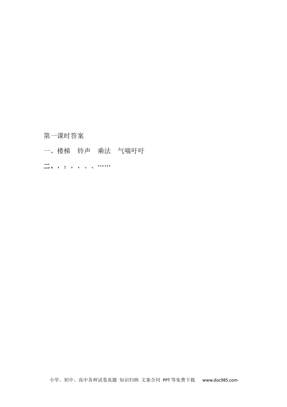 小学、初中、高中各种试卷真题知识归纳文案合同PPT等免费下载www.doc985.com第一课时一、看拼音,写汉字lóutīlínɡshēnɡchénɡfǎqìchuǎnxūxū()()()()二、给下列句子加上标点。在宇宙的另一边()加法是这样的()大地万物加上一场大雪等于一片白茫茫()那时()无数的孩子会从家里冲出来()打雪仗()堆雪人()滑雪()小学、初中、高中各种试卷真题知识归纳文案合同PPT等免费下载www.doc985.com第一课时答案一、楼梯铃声乘法气喘吁吁二、,:,,、、……小学、初中、高中各种试卷真题知识归纳文案合同PPT等免费下载www.doc985.com
