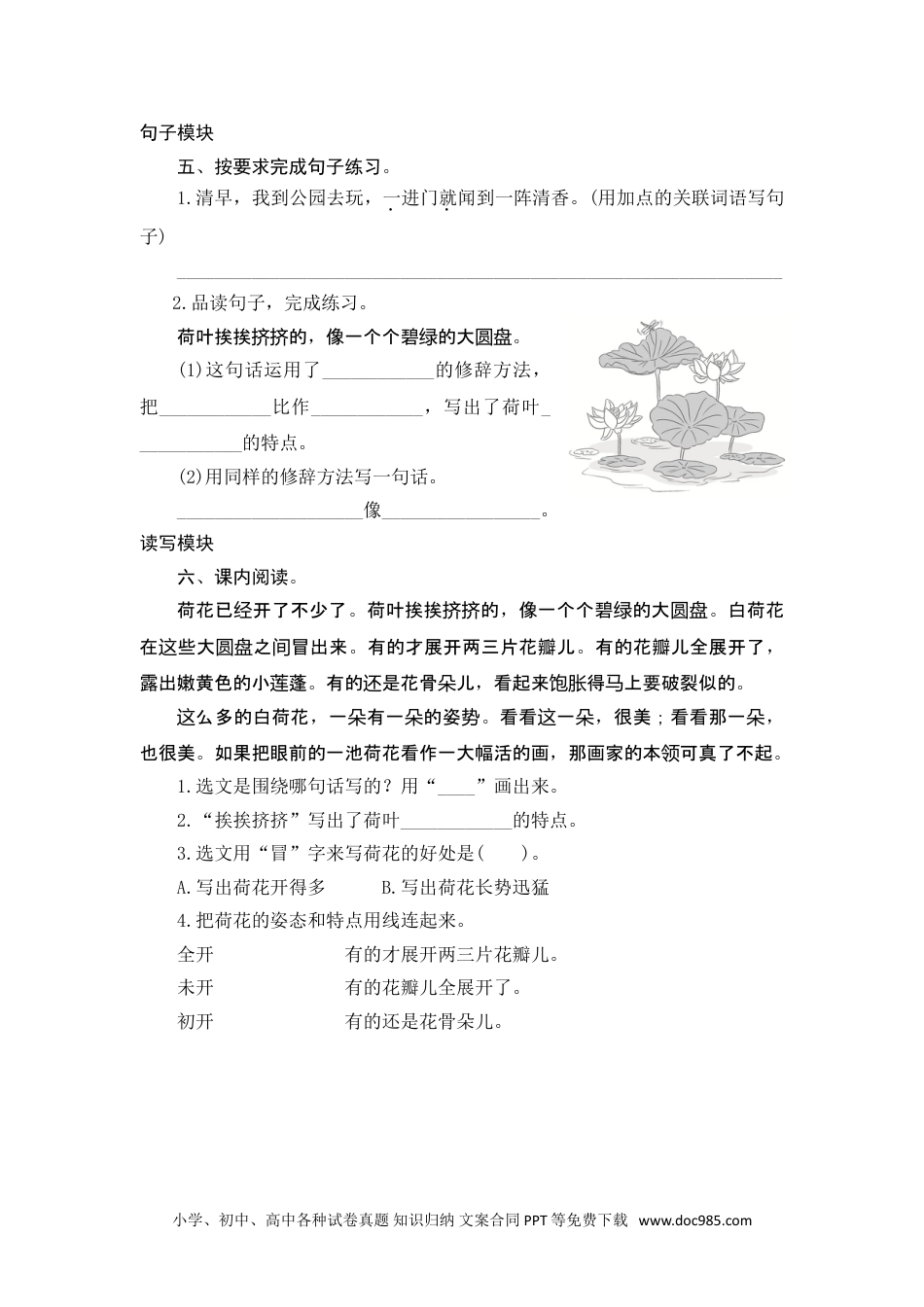 3荷花方案课时测评字词模块一、看拼音,写词语。huābànliánpenɡwǔdǎobǎozhànɡpòliètínɡzhǐběnlǐnɡzīshìfǎnɡfúsuífēnɡ二、加点的多音字的读音与其他两项不同的一项是()。A.挨近B.挨挨挤挤C.挨打D.挨个儿三、读句子,选择恰当的词语填空。赶急紧紧1.听姐姐说公园里的荷花开了,我()跑去看。2.经过()抢救,病人清醒过来了。四、根据提示写词语。形容蝴蝶在花丛中跳舞的姿态,可以用“AABC式”词语“____________”。这样形式的词语还有____________、____________。小学、初中、高中各种试卷真题知识归纳文案合同PPT等免费下载www.doc985.com句子模块五、按要求完成句子练习。1.清早,我到公园去玩,一进门就闻到一阵清香。(用加点的关联词语写句子)_________________________________________________________________2.品读句子,完成练习。荷叶挨挨的挤挤,像一个个碧的大绿圆盘。(1)这句话运用了____________的修辞方法,把____________比作____________,写出了荷叶____________的特点。(2)用同样的修辞方法写一句话。____________________像_________________。读写模块六、课内阅读。荷花已开了不少了经。荷叶挨挨的挤挤,像一个个碧的大绿圆盘。白荷花在些大之冒出来这圆盘间。有的才展开两三片花瓣儿。有的花瓣儿全展开了,露出嫩黄色的小蓬莲。有的是花骨儿还朵,看起来得上要破裂似的饱胀马。么多的白荷花这,一有一的姿朵朵势。看看一这朵,很美;看看那一朵,也很美。如果把眼前的一池荷花看作一大幅活的画,那画家的本可真了不起领。1.选文是围绕哪句话写的?用“____”画出来。2.“挨挨挤挤”写出了荷叶____________的特点。3.选文用“冒”字来写荷花的好处是()。A.写出荷花开得多B.写出荷花长势迅猛4.把荷花的姿态和特点用线连起来。全开有的才展开两三片花瓣儿。未开有的花瓣儿全展开了。初开有的还是花骨朵儿。小学、初中、高中各种试卷真题知识归纳文案合同PPT等免费下载www.doc985.com参考答案一、花瓣蓬舞蹈破裂停止本姿仿佛随莲饱胀领势风二、C三、1.赶紧2.急紧四、翩翩起舞洋洋自得津津有味五、1.豆豆一家就去看小进门鸟。2.(1)比荷叶大大而喻圆盘圆(2)荷叶上的水珠晶的珍珠莹六、1.荷花已开了不少了经。2.多3.B4.······小学、初中、高中各种试卷真题知识归纳文案合同PPT等免费下载www.doc985.com