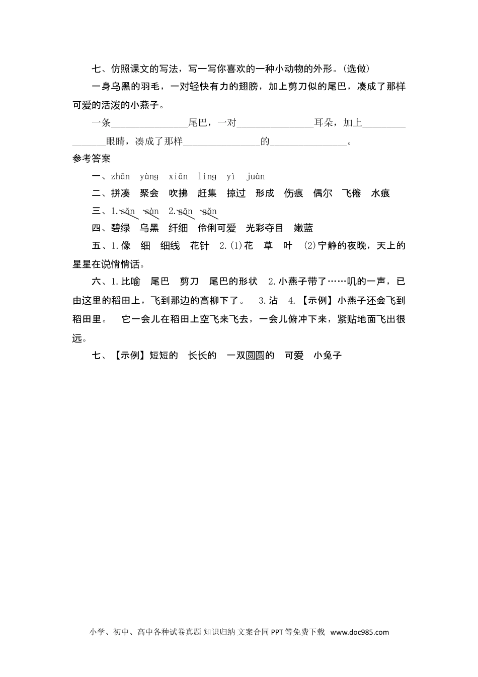 2燕子方案课时测评字词模块一、给加点字选择正确的读音,画“√”。沾水(zānzhān)荡漾(rànɡyànɡ)纤维(qiànxiān)伶俐(línlínɡ)翼尖(yìjì)困倦(juànjàn)二、看拼音,写词语。pīncòujùhuìchuīfúɡǎnjílüèɡuòxínɡchénɡshānɡhénǒuěrfēijuànshuǐhén三、用“\”画掉句子中加点的多音字的错误读音。1.傍晚,我和妈妈出去散(sǎnsàn)步时,妈妈告诉我做事不能懒散(sǎnsàn)。2.他把腰杆(ɡānɡǎn)挺直,看上去就像一根电线杆(ɡānɡǎn)。四、在括号里填入恰当的词语。()的柳树()的羽毛()的电线()的燕子()的图画()的春天句子模块五、品读句子,完成练习。小学、初中、高中各种试卷真题知识归纳文案合同PPT等免费下载www.doc985.com1.轻风微微地吹拂着,如毛的细雨由天上洒落着。“如”是________的意思,这句话说春天的雨像毛一样,写出了春雨________的特点。我也能这样写春雨:春天的雨如________,如________,飘飘洒洒。2.红的白的黄的花,青的草,绿的叶,都像赶集似的聚拢来,形成了烂漫无比的春天。(1)这句话运用了拟人的修辞方法,把____________、____________和____________当成人来写,生动形象地突出了春天充满生机的景象。(2)我也会仿写拟人句:___________________________________________读写模块六、课内阅读。小燕子了它的剪刀似的尾巴带,在阳光地满时,斜于亮无比的天空飞旷,的一声叽,已由里的稻田上这,到那的高柳下了飞边。另有几只却在波光粼粼的湖面上横掠着,小燕子的翼尖或剪尾,偶沾了尔一下水面,那小便一圈圆晕一圈地漾开去荡。1.“小燕子带了它的剪刀似的尾巴”运用了________的修辞方法,把________比作________,生动形象地写出了燕子____________________。2.用“”画出描写小燕子飞行速度快的句子。3.画“____”的句子中,从“______”这个字,我们可以体会到小燕子的轻盈。4.想一想,小燕子还会飞到哪里,它是怎样飞的。用几句话写下来。___________________________________________________________________________________________________________________________________________________________________________________________________小学、初中、高中各种试卷真题知识归纳文案合同PPT等免费下载www.doc985.com七、仿照课文的写法,写一写你喜欢的一种小动物的外形。(选做)一身黑的羽毛乌,一快有力的翅膀对轻,加上剪刀似的尾巴,凑成了那样可的活的小燕子爱泼。一条________________尾巴,一对________________耳朵,加上________________眼睛,凑成了那样________________的________________。参考答案一、zhānyànɡxiānlínɡyìjuàn二、拼凑聚会吹拂赶集掠形成痕偶倦水痕过伤尔飞三、1.sǎnsàn2.ɡānɡǎn四、碧黑伶俐可光彩目嫩绿乌纤细爱夺蓝五、1.像花细细线针2.(1)花草叶(2)宁静的夜晚,天上的星星在悄悄说话。六、1.比尾巴剪刀尾巴的形状喻2.小燕子了带……的一声叽,已由里的稻田上这,到那的高柳下了飞边。3.沾4.【示例】小燕子会到还飞稻田里。它一会儿在稻田上空来去飞飞,一会儿俯冲下来,地面出很紧贴飞远。七、【示例】短短的的一双的可小兔子长长圆圆爱小学、初中、高中各种试卷真题知识归纳文案合同PPT等免费下载www.doc985.com