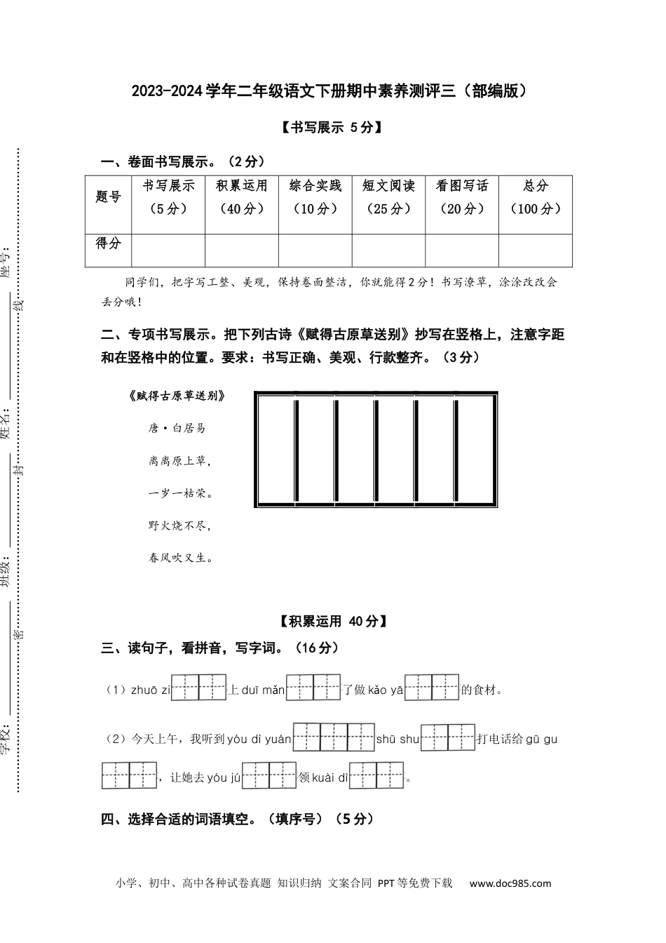 小学、初中、高中各种试卷真题知识归纳文案合同PPT等免费下载www.doc985.com2023-2024学年二年级语文下册期中素养测评三(部编版)【书写展示5分】一、卷面书写展示。(2分)同学们,把字写工整、美观,保持卷面整洁,你就能得2分!书写潦草,涂涂改改会丢分哦!二、专项书写展示。把下列古诗《赋得古原草送别》抄写在竖格上,注意字距和在竖格中的位置。要求:书写正确、美观、行款整齐。(3分)《赋得古原草送别》唐·白居易离离原上草,一岁一枯荣。野火烧不尽,春风吹又生。【积累运用40分】三、读句子,看拼音,写字词。(16分)(1)zhuōzi上duīmnǎ了做koyāǎ的食材。(2)今天上午,我听到yóudìyuánshūshu打电话给gūgu,让她去yóujú领kuàidì。四、选择合适的词语填空。(填序号)(5分)学校:班级:姓名:座号:…………………………………密…………………………………封…………………………………线…………………………………题号书写展示(5分)积累运用(40分)综合实践(10分)短文阅读(25分)看图写话(20分)总分(100分)得分小学、初中、高中各种试卷真题知识归纳文案合同PPT等免费下载www.doc985.com①绿油油②蓝蓝③温暖④可爱⑤绚丽春天来了,春天来了!()的天空中飘着白云,()的阳光普照大地。田野上长满了()的小草,山坡上开满了()的鲜花,()的小朋友们冲出家门,感受春天,开心极了!五、根据课本内容填空。(9分)(1)十二生肖排行榜上,“子鼠”后面是“________”“巳蛇”后面是“________”。(2)小林不守信用,答应别人的事情总做不到,我想对他说:“失信__________。”(3)“与其锦上添花,_____________送炭。”别人有困难的时候,我们一定要帮助他们。(4)“碧玉___________,___________绿丝绦”这两句诗为我们描绘了一幅春天的美景图。(5)与“粽香艾香满堂飘”有关的传统节日是__________,这一天的习俗有____________。(6)《雷锋叔叔,你在哪里》这首诗歌赞扬了雷锋________________________的精神。六、选择题。(10分)1.下列词语中,加点字的读音有误的一项是()(2分)A.害羞(xiū)包裹(guǒ)B.嫩芽(nèn)询问(xún)C.懊丧(sàng)荆棘(jīng)D.年龄(líng)泛起(fá)2.下面的节日按时间顺序排列正确的一项是()(2分)A.春节清明节端午节中秋节重阳节B.春节清明节端午节重阳节中秋节C.春节端午节清明节重阳节中秋节3.下面哪一句诗是对母爱的赞美()(2分)A.谁言寸草心,报得三春晖。B.日出江花红胜火,春来江水绿如蓝。C.不知细叶谁裁出,二月春风似剪刀。小学、初中、高中各种试卷真题知识归纳文案合同PPT等免费下载www.doc985.comD.接天莲叶无穷碧,映日荷花别样红。4.你的朋友说话不算数,你会用()这一句话来提醒他。(2分)A.失信不立B.与人玫瑰,手有余香C.平时肯帮人,急时有人帮D.人心齐,泰山移5.下列说法有误的一项是()(2分)A.通过“刺、分、切、刮”,我发现带“刂、刀”的字多与“刀”有关。B.“黑”用部首查字法查字典,应查部首“灬”,由此可知“默”用部首查字法查字典,应查部首“灬”。C.小明属“蛇”,姐姐比他大两岁,姐姐应该属“兔”。【综合实践10分】七、阅读积累。(10分)仔细阅读《了不起的狐狸爸爸》的目录,判断下面说法是否正确,对的打“√”,错的打“×”。1.根据书名,我知道这本书的主人公是狐狸太太。()2.第5章《可怕的挖掘机》从25页开始的。()3.《狐狸先生有两个计划》从43页开始的。()4.这本书一共有12章。()5.“博吉斯的1号鸡舍!”狐狸先生喊道,“这正是我看准的地方!”这句话应该出自第2章《狐狸先生》。()【短文阅读25分】小学、初中、高中各种试卷真题知识归纳文案合同PPT等免费下载www.doc985.com八、短文阅读(一)。(13分)古时候有个人,他巴望自己田里的禾苗长得快些,天天到田边去看。可是,一天,两天,三天,禾苗好像一点儿也没有长高。他在田边焦急地转来转去,自言自语地说:“我得想个办法帮它们长。”1.这段话选自寓言《__________》。文中种田的那个人“拔苗”的原因是________________,“助长”...