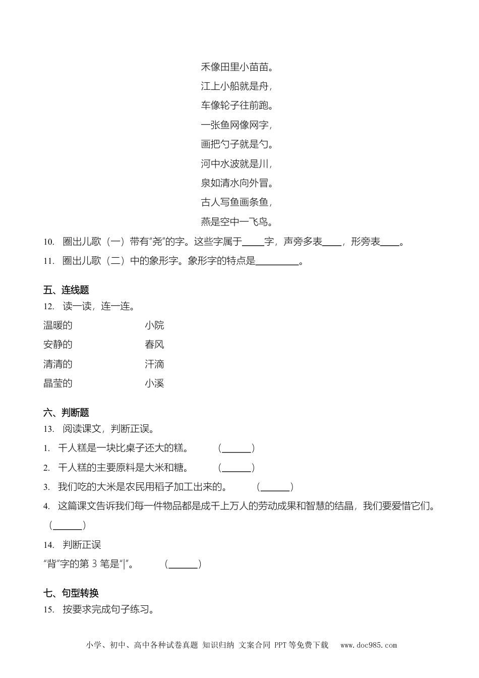 小学、初中、高中各种试卷真题知识归纳文案合同PPT等免费下载www.doc985.com部编版二年级语文下册期中检测卷(A卷)班级姓名学号分数(时间:120分钟满分:100分)一、书写1.读拼音,写词语。tiēzhǐdàjiēlóngzhōuàixiāngjìngàizhuǎnyǎntuányuánrènào二、选择题2.看到同学洗手后忘了关水龙头,我会跟他说:()A.“同学,快把水龙头关掉!”B.“同学,你好!你洗手后忘关水龙头了,我已经帮忙关了,你以后要记得关啊!”3.下列都是传统节日的一项是()。A.春节清明节端午节劳动节B.春节元宵节重阳节国庆节C.元宵节端午节中秋节重阳节D.清明节乞巧节儿童节中秋节4.下列词语中,音节全部正确的一组是()A.恻隐(cèyín)塔石(tāshí)餐厅(cāntīng)B.优秀(yōuxiù)厨师(chúshī)葱绿(cōnglǜ)C.诊所(zhěnsuǒ)哨所(sàosuǒ)展览馆(zhǎnlǎnguǎn)5.选词填空正确的是()①鲜花②花籽()是长颈鹿大叔寄给鼹鼠先生的,它漏在了一条小路上,现在这条小路成了一条开满()的小路。A.①②B.②①小学、初中、高中各种试卷真题知识归纳文案合同PPT等免费下载www.doc985.com二、填空题6.写出下列词语的反义词。可爱——()喜欢——()深——()小心——()幸运——()好——()7.我会比一比再组词。弯()鸟()材()钱()炒()湾()岛()财()线()吵()8.填量词。一()野花一()包裹一()小路一()柏树9.查字典。“森”共画,第5画是,组词。“结”共画,第5画是,组词。“灵”共画,第3画是,组词。“母”共画,第5画是,组词。“游”共画,第3画是,组词。“便”共画,最后1画是,组词。四、诗词曲鉴赏读读儿歌,完成练习。(一)用水浇,用火烧,手儿挠,尾巴翘,日出东方天刚晓,丰衣足食才富饶。(二)象形字,真奇妙,模仿形状把字造,画棵小树就是木,小学、初中、高中各种试卷真题知识归纳文案合同PPT等免费下载www.doc985.com禾像田里小苗苗。江上小船就是舟,车像轮子往前跑。一张鱼网像网字,画把勺子就是勺。河中水波就是川,泉如清水向外冒。古人写鱼画条鱼,燕是空中一飞鸟。10.圈出儿歌(一)带有“尧”的字。这些字属于字,声旁多表,形旁表。11.圈出儿歌(二)中的象形字。象形字的特点是。五、连线题12.读一读,连一连。温暖的小院安静的春风清清的汗滴晶莹的小溪六、判断题13.阅读课文,判断正误。1.千人糕是一块比桌子还大的糕。()2.千人糕的主要原料是大米和糖。()3.我们吃的大米是农民用稻子加工出来的。()4.这篇课文告诉我们每一件物品都是成千上万人的劳动成果和智慧的结晶,我们要爱惜它们。()14.判断正误“背”字的第3笔是“|”。()七、句型转换15.按要求完成句子练习。小学、初中、高中各种试卷真题知识归纳文案合同PPT等免费下载www.doc985.com1.他抢去了美丽的公主!(改为“被”字句)小学、初中、高中各种试卷真题知识归纳文案合同PPT等免费下载www.doc985.com2.我们趴在沙滩上,从四.面.八.方.挖着地道。(用加点词写话)16.“把”字句与“被”字句互换。1.古人把贝壳当成钱币。2.我们把城堡轰塌了。3.公主被我们救出来了。4.敌人被解放军战士打败了。八、排序题17.按照时间顺序排列下面的节日,并照样子写句子。端午节清明节元宵节春节重阳节中秋节(1)春节春节,我们贴春联,挂灯笼。(2)(3)(4)(5)(6)九、语言表达18.我会照样子写句子。例:我的彩色铅笔是大森林的精灵。大森林的精灵是我的彩色铅笔。1.海边的沙滩是我们的快乐天地。例:枫树好像一把很大又很高的绿色太阳伞。2._________________好像。小学、初中、高中各种试卷真题知识归纳文案合同PPT等免费下载www.doc985.com例:有几个虫子怕什么?有几个虫子不可怕。3.这件事你不应该做吗?19.我会扩写句子。例:鱼儿在水里游来游去。鱼儿在水里自由自在地游来游去。(1)孩子们都觉得小鸟很可爱。孩子们都觉得小鸟很可爱。(2)马儿在原野上奔驰。马儿在原野上奔驰。(3)我们在操场上做游戏。我们在操场上做游戏。20.仿写句子。他回家后打开包裹,看见一堆小颗粒。兰兰打开,看见。十、信息匹配21.用“...