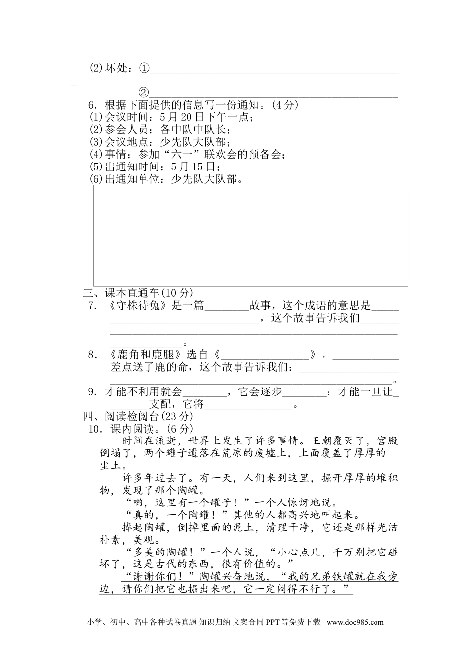 第二单元达标检测卷时间:90分钟满分:100分一、基础训练营(34分)1.读拼音,写词语。(8分)2.读句子,用“√”标出加点字的正确读音。(6分)(1)小娟的字写得匀称(chēngchèn)美观,受到很多人的称(chēngchèn)赞。(2)小虫在蜘蛛网上挣(zhēngzhèng)扎着,却怎么也挣(zhēngzhèng)脱不了。(3)看着妹妹撒(sǎsā)娇的样子,妈妈不禁(jīnjìn)笑了起来。3.词语巧填空。(12分)(1)把下列词语补充完整。(6分)自相()()()()盗铃杞()忧()邯郸()()画()添()()()蛇影(2)照样子,写词语。(6分)①源源不断(AABC式)____________________________②无忧无虑(ABAC式)_____________________________4.句子训练营。(8分)(1)姐姐________________:“难道墙壁还会‘冒汗’?”(把句子补充完整)(2)这四条腿太细了,怎么配得上这两只美丽的角呢?(改为陈述句)_____________________________________________________(3)他说:“没关系,我的马跑得快。”(改为转述句)_____________________________________________________(4)因释其耒而守株,冀复得兔。(写出这句话的意思)_____________________________________________________二、综合展示厅(8分)5.口语交际:班级开展“该不该实行班干部轮流制”的讨论,请你参与进来,各列举两条班干轮流制的好处和坏处。(4分)(1)好处:①______________________________________________②_____________________________________________小学、初中、高中各种试卷真题知识归纳文案合同PPT等免费下载www.doc985.com(2)坏处:①______________________________________________②_____________________________________________6.根据下面提供的信息写一份通知。(4分)(1)会议时间:5月20日下午一点;(2)参会人员:各中队中队长;(3)会议地点:少先队大队部;(4)事情:参加“六一”联欢会的预备会;(5)出通知时间:5月15日;(6)出通知单位:少先队大队部。三、课本直通车(10分)7.《守株待兔》是一篇________故事,这个成语的意思是________________________________,这个故事告诉我们________________________________________________________________________。8.《鹿角和鹿腿》选自《________________》。____________差点送了鹿的命,这个故事告诉我们:_____________________________________________________________________。9.才能不利用就会________,它会逐步________;才能一旦让________支配,它将________________。四、阅读检阅台(23分)10.课内阅读。(6分)时间在流逝,世界上发生了许多事情。王朝覆灭了,宫殿倒塌了,两个罐子遗落在荒凉的废墟上,上面覆盖了厚厚的尘土。许多年过去了。有一天,人们来到这里,掘开厚厚的堆积物,发现了那个陶罐。“哟,这里有一个罐子!”一个人惊讶地说。“真的,一个陶罐!”其他的人都高兴地叫起来。捧起陶罐,倒掉里面的泥土,清理干净,它还是那样光洁朴素,美观。“多美的陶罐!”一个人说,“小心点儿,千万别把它碰坏了,这是古代的东西,很有价值的。”“谢谢你们!”陶罐兴奋地说,“我的兄弟铁罐就在我旁边,请你们把它也掘出来吧,它一定闷得不行了。”小学、初中、高中各种试卷真题知识归纳文案合同PPT等免费下载www.doc985.com人们立即动手,翻来覆去,把土都掘遍了,但是,连铁罐的影子也没见到。(1)读画“——”的句子,结合全文想一想,陶罐为什么能这样对待铁罐?()(1分)A.陶罐过于健忘B.陶罐胸怀宽广C.陶罐没有骨气(2)判断:铁罐为什么连影子也没有了?(3分)①铁罐自知自己没有价值,不想出来了。()②铁罐看到人们发现陶罐,就躲起来了。()③铁罐最终被侵蚀、氧化、分解了。()(3)想一想:陶罐的价值在哪里?(2分)_____________________________________________________11.课外阅读。(13分)滥竽充数古时候,齐国的国君齐宣王爱好音乐,尤其喜欢听吹竽,手下有300个善于吹竽的乐师。齐宣王喜欢热闹,爱摆排场,总想在人前显示做国君的威严,所以每次听吹竽的时候,总是叫这300个人在一起合奏给他听。有个南郭先生听说了齐宣王的这个癖好,觉得有机可乘,是个赚钱的好机会,就跑...