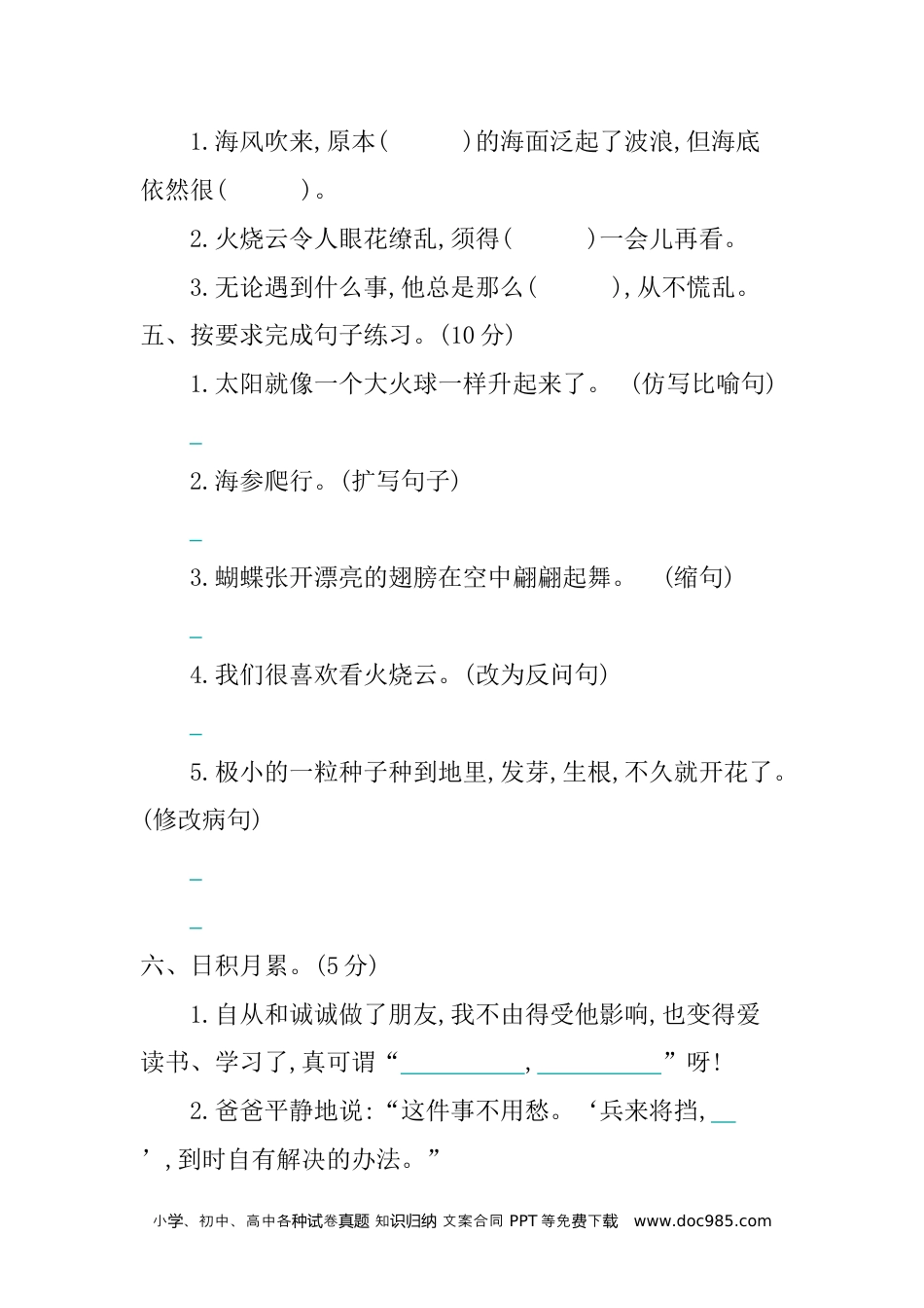 小、初中、高中各卷知文案合同学种试真题识归纳PPT等免下费载www.doc985.com第七单元提升练习时间:90分钟满分:100分得分:一、用“√”给下列加点的字选择正确的读音。(6分)细胞(bāopāo)木雕(dāodiāo)紫檀(dántán)光芒(mángwáng)汪汪(wāngwànɡ)小庙(màomiào)二、看拼音,写词语。(12分)biànhuàn()jìngōng()dāojiàn()xiōngměng()dāojiàn()qìguān()tuīkāi()xùnsù()yuánrùn()wēiwǔ()chéngliáng()yòurén()三、用“\”画去每组词中不同类的一项。(8分)1.百合色鲜红色梨黄颜色2.嗡嗡啾啾汪汪悄悄叽叽3.奇妙寻找凶猛镇静模糊4.游动攻击形状后退闪烁四、选词填空。(8分)宁静平静镇静沉静小、初中、高中各卷知文案合同学种试真题识归纳PPT等免下费载www.doc985.com1.海风吹来,原本()的海面泛起了波浪,但海底依然很()。2.火烧云令人眼花缭乱,须得()一会儿再看。3.无论遇到什么事,他总是那么(),从不慌乱。五、按要求完成句子练习。(10分)1.太阳就像一个大火球一样升起来了。(仿写比喻句)2.海参爬行。(扩写句子)3.蝴蝶张开漂亮的翅膀在空中翩翩起舞。(缩句)4.我们很喜欢看火烧云。(改为反问句)5.极小的一粒种子种到地里,发芽,生根,不久就开花了。(修改病句)六、日积月累。(5分)1.自从和诚诚做了朋友,我不由得受他影响,也变得爱读书、学习了,真可谓“,”呀!2.爸爸平静地说:“这件事不用愁。‘兵来将挡,’,到时自有解决的办法。”小、初中、高中各卷知文案合同学种试真题识归纳PPT等免下费载www.doc985.com3.接着又来了一头,跟庙门前的石狮子,也那么,也那样,很很地。七、课内阅读。(11分)海里的动物,各有各的活动方法。海参靠肌肉伸缩爬行,每小时只能前进四米。有一种鱼身体像梭子,每小时能游几十千米,攻击其他动物的时候,比普通的火车还快。乌贼和章鱼能突然向前方喷水,利用水的反推力迅速后退。还有些贝类自己不动,却能巴在轮船底下做免费的长途旅行。1.写出下列词语的近义词或反义词。(2分)近义词:攻击—()突然—()反义词:普通—()后退—()2.下列句子运用了哪种说明方法?选一选。(2分)A.列数字B.举例子C.打比方D.作比较(1)海参靠肌肉伸缩爬行,每小时只能前进四米。()(2)有一种鱼身体像梭子,每小时能游几十千米,攻击其他动物的时候,比普通的火车还快。()3.用“”画出选段的中心句。(2分)4.为了说明动物的活动方式多种多样,文中列举了、、、、等动物的活小、初中、高中各卷知文案合同学种试真题识归纳PPT等免下费载www.doc985.com动方式,其中运动最慢,最快,和能喷水后退,能巴在船底“旅行”。(5分)八、课外阅读。(11分)神奇的鸟岛一个春天的早晨,我们怀着一颗好奇的心,从西宁乘车向鸟岛进发。汽车沿着青藏公路向前(),()日月山,()倒淌河,来到碧波万顷的青海湖。我们()一叶轻舟驶向美丽的鸟岛。岛上的奇景令人眼花缭乱。抬头望,头顶上空遍布飞鸟,红的、白的、花的,组成一幅幅色彩夺目的锦绣画卷;低头瞧,满岛都是各种各样的鸟巢和五光十色的鸟蛋,几乎没有我可以插足的空地。你看,那披着一领色彩花衫的斑头大雁,小巧玲珑的燕鸥,张着长长的嘴东张西望的环嘴鹬,还有洁白的天鹅,美丽的凤头潜鸭,亮着动听歌喉的云雀,迈动着长腿在优雅踱步觅食的黑颈鹤……我们大概数了一下就有一百多种鸟哩!真是天上飞的是鸟,地上跑的是鸟,湖里游的还是鸟。这是一个多么欢乐的鸟的乐园哪!1.将下列词语填入短文第1自然段的括号内。(2分)穿过翻过驾起飞驰2.将下列词语补充完整。(3分)小、初中、高中各卷知文案合同学种试真题识归纳PPT等免下费载www.doc985.com()()万顷()()缭乱色彩()()小()()珑()张()望五()十()3.短文的第2自然段写了飞鸟、和都很多,作者的观察顺序是,这段话的中心句是。(4分)4.用“”画出文中最能体现鸟多的句子,说一说你从中体会到了什么。(2分)九、习作芳草地。(25分)大自然是奇妙的,它是人类最早的启蒙老师。让我们一起走进大自然,去领略它那独特的风姿。请你选择一处景物,将它描述出来。题目自拟。小、初中、高中各卷知文案合同学种试真题识归纳PPT等免下费载www.doc985.com第七单元提升练习答案一、bāodiāotánmángwāngmiào二、变幻进攻蜡烛凶猛刀剑器官推...