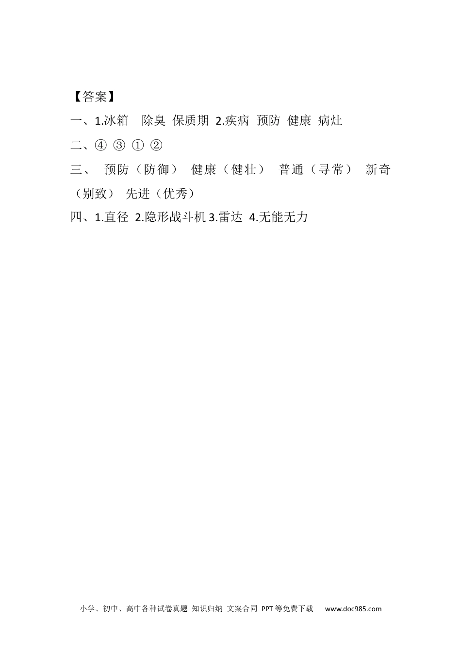 小学、初中、高中各种试卷真题知识归纳文案合同PPT等免费下载www.doc985.com7纳米技术就在我们身边课时练第一课时一、读拼音,写汉字。1.bīnɡxiānɡ()里面用到一种纳米涂层,具有杀菌和chúchòu()功能,能够使食物bǎozhìqī()更长。2.纳米技术可以实现jíbìnɡ()的早期检测与yùfánɡ(),让人们更加jiànkānɡ()。未来的纳米机器人可以通过血管直达bìnɡzào(),杀死癌细胞。二、给下面画线的字选择正确的意思,填在相应的括号里。疾:①疾病;②痛苦;③痛恨;④急速猛烈。群马疾驰()疾恶如仇()积劳成疾()疾苦()三、写出下列词语的近义词。预防()健康()普通()新奇()先进()四、根据解释写词语。1.是指通过一平面图形或立体(如圆、圆锥截面、球、立方体)中心到边上两点间的距离。()2.通常是指在电磁、可见光、红外、声学等方面难以探测或跟踪的战斗机,其中最主要的就是电磁隐形。()小学、初中、高中各种试卷真题知识归纳文案合同PPT等免费下载www.doc985.com3.测定目标位置的无线电装置或系统。()4.不能施展力量,指使不上劲或没有能力去做好某件事情、解决某个问题。()小学、初中、高中各种试卷真题知识归纳文案合同PPT等免费下载www.doc985.com【答案】一、1.冰箱除臭保质期2.疾病预防健康病灶二、④③①②三、预防(防御)健康(健壮)普通(寻常)新奇(别致)先进(优秀)四、1.直径2.隐形战斗机3.雷达4.无能无力小学、初中、高中各种试卷真题知识归纳文案合同PPT等免费下载www.doc985.com第二课时一、在括号里填上合适的词语。()的特性()的隐形战斗机()的物质()的变化二、阅读课文片段,回答问题。纳米技术就在我们身边。冰箱里如果使用一种(),就会具有()和()的功能,蔬菜()更长。有一种叫“()”的神奇材料,比()结实百倍,而且非常(),将来我们有可能坐上“()”到()旅行。在()隐形战机上,用到一种(),能够把探测()吸收掉,所以雷达根本看不见它。1.根据课文内容,将短文补充完整。2.找出本段的中心句,用“”画出来。3.有一种叫“碳纳米管”的神奇材料,比钢铁结实百倍,而且非常轻,将来我们有可能坐上“碳纳米管天梯”到太空旅行。这句话用到的说明方法是()的说明方法。4.写出下列词语的反义词。先进()吸收()神奇()5.本段中介绍了()种纳米技术,分别是()、()、()。小学、初中、高中各种试卷真题知识归纳文案合同PPT等免费下载www.doc985.com三、填空。《纳米技术就在我们身边》是著名科学家写的一篇科普文章,从、两个方面介绍了纳米技术在我们生产生活中的运用。小学、初中、高中各种试卷真题知识归纳文案合同PPT等免费下载www.doc985.com【答案】一、(新奇)的特性(最先进)的隐形战斗机(小小)的物质(深刻)的变化二、1.纳米涂层杀菌除臭保鲜期碳纳米管钢铁轻碳纳米管天梯太空最先进的纳米吸波材料雷达波2.纳米技术就在我们身边。3.作比较4.先进(落后)吸收(排泄)神奇(普通)5.三纳米涂层碳纳米管纳米吸波材料三、刘忠范改善我们的生活,医疗制药