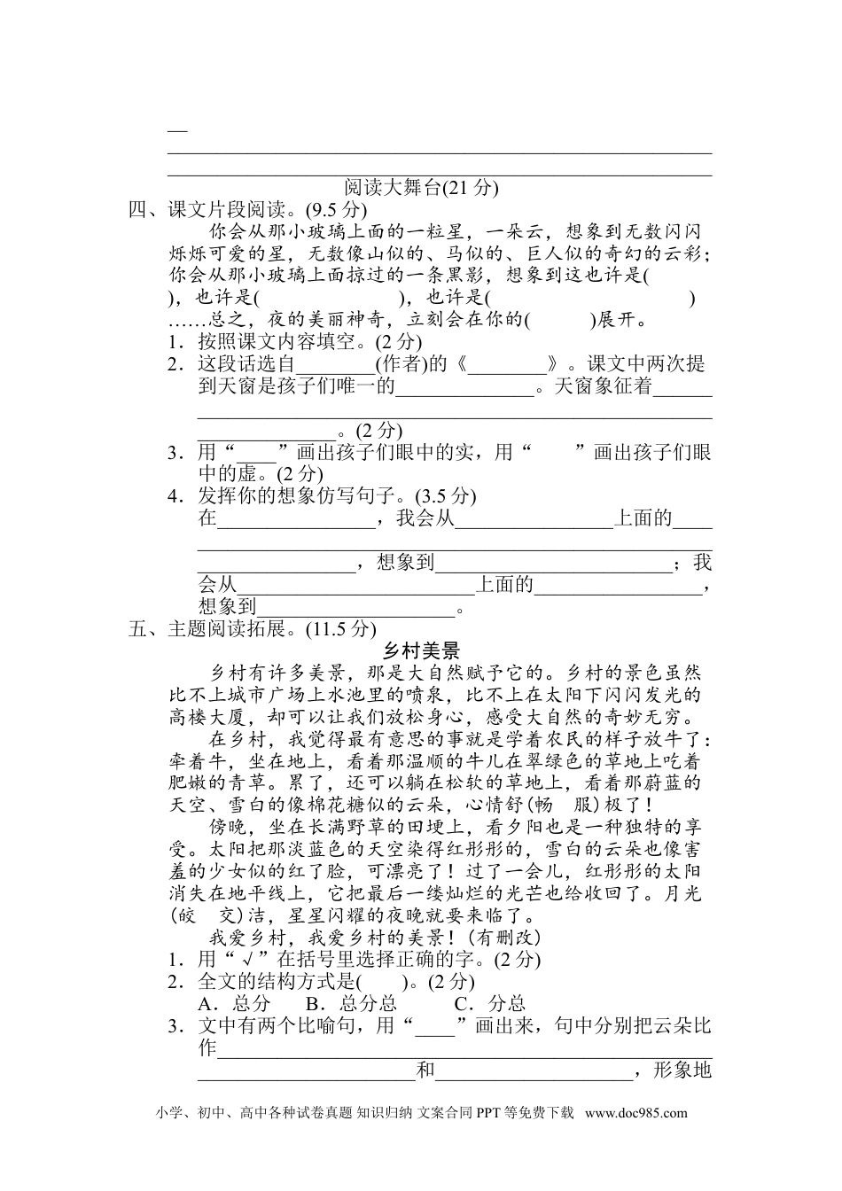 第一单元主题训练卷主题百花园(49分)一、主题达标。(26分)1.纯朴的乡村,和谐的画卷。读拼音,写字词。(6分)(1)青的、红的瓜,碧绿的藤和叶,gòuchéng()了一道别有风趣的zhuāngshì(),比那高楼门前dūnzhe()一对石狮子或是竖着两根大旗杆,可爱多了。(2)乡下人在屋顶开一个小方洞,装一块玻璃,叫作“天窗”。下雨天或是晚上,天窗便成了你唯一的wèijiè(),它会使你的想象ruìlì()起来!(3)鸡,乡下人家zhàolì()总要养几只的。从他们的房前屋后走过,肯定会瞧见一只母鸡,shuàilǐnɡ()一群小鸡,在竹林中mìshí()。(4)lí()落shūshū()一径深,树头新绿未成阴。(5)máoyán()低小,溪上青青草。醉里吴音相媚好,白发谁家wēngǎo()?2.恰当的搭配。在括号里填上恰当的词语。(3分)()的星星()的风景()的低语()的云彩()的孩子()的丝绸3.比一比,再组词。(4分)4.诗词中的乡村乐。请将下列诗词补充完整。(8分)(1)儿童急走__________________,____________________无处寻。(2)大儿______________,中儿______________。最喜小儿____________,______________________________。(3)____________________无人过,惟有_________________。5.写出下面句子使用的修辞手法。(5分)(1)几场春雨过后,到那里走走,你常常会看见许多鲜嫩的笋,成群地从土里探出头来。()(2)碰着大风大雨,或者北风呼呼叫的冬天,木板窗只好关起来,屋子里就黑得像地洞似的。()(3)那忽大忽小的水声,应和着拖拉机的鸣响;那纤细的低语,是在和刚刚从雪被里伸出头来的麦苗谈心;那碰着岸边石块的叮当声,像是大路上车轮滚过的铃声……()()()二、主题探究。(20分)1.将下面的句子补充完整,感受作者想象的奇妙。(2分)从那小小的玻璃,你会看见______________________________,你会看见______________________________;你想象到这雨,这风,这雷,这电,怎样____________________小学、初中、高中各种试卷真题知识归纳文案合同PPT等免费下载www.doc985.com________,你想象它们的威力________________________________________________________________________________________________________。小小的天窗会使你的想象锐利起来!2.《宿新市徐公店》是一首描写__________________景色的诗歌。这首诗运用了________手法,平易自然,形象鲜明。“____________”“____________”这两个动词十分形象贴切,将儿童天真活泼、好奇好胜的形象刻画得惟妙惟肖。“____________”一词引发读者的想象,在我们面前仿佛浮现出了儿童面对一片菜花搔首踟蹰、不知所措的画面。(5分)3.《清平乐•村居》中,__________是词牌名,词的作者是____________代词人____________。词中通过描写__________、________、________等平常的景物,及对______________________________________________的形象刻画,抒发了作者________________________________的思想感情。(4分)4.将下列内容按课文《乡下人家》的写作顺序排列:___________________________________________________________。(写序号)(3分)①门前晚餐图②鲜花轮绽图③月夜安眠图④瓜藤攀檐图⑤鸡鸭觅食图⑥雨后春笋图5.转述时,我们要弄清________________,不要遗漏__________________。同时还要注意________________。(3分)6.《卜算子•咏梅》是__________________作者写的一首词,这首词赞颂了梅花________________________的特点和__________________的崇高精神。(3分)三、主题交际。(3分)林锋的爸爸是家校联盟的代表,老师让林锋把这个通知转告给他爸爸,他会这样说:_____________________________________________________________________________________________________________________________________________小学、初中、高中各种试卷真题知识归纳文案合同PPT等免费下载www.doc985.com________________________________________________________________________________________________________________阅读大舞台(21分)四、课文片段阅读。(9.5分)你会从那小玻璃上面的一粒星,一朵云,想象到无数闪闪烁烁可爱的星,无数像山似的、马似的、...