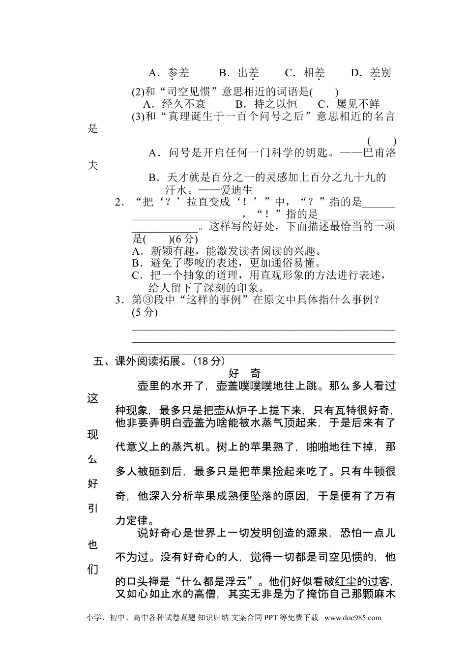 第五单元主题训练卷主题百花园(40分)一、主题达标。(25分)1.读拼音,写词语。(8分)大千世界,有多少奥秘?xīshuài()什么会为发出qīngcuì()的叫声?在北半球,xǐzǎo()水的xuánwō()什么会朝为nìshízhēn()方向旋?如果你也能从些转这sīkōngjiànguàn()的现象中提出yíwèn()并qièérbùshě()地去探究,就一定能发现zhēnlǐ()。2.照样子,写成语。(6分)(1)百思不得其解(六字成语):_____________、____________(2)打破砂锅问到底(七字成语):____________、___________(3)专心致志(表示注意力集中的成语):________、_________3.在括号里填上恰当的词语。(6分)的声音的现象地观察4.把下面排列错乱的短语按一定顺序重新排列。(4分)(1)猜答案证实猜测提疑问听声音__________________________________________________(2)观察现象发现真理实验研究提出问题__________________________________________________二、主题探究。(10分)1.下面的句子表现了人物的什么特点?请写在句子后面的括号里。(4分)(1)其一人专心致志,惟弈秋之为听。()(2)孔子不能决也。()(3)“不许动”,里边该是什么东西在响呢?我对于它的好奇心一天比一天增加。()(4)谢皮罗紧紧抓住这个问号不放,进行了反复的实验和研究。1962年,他发表了论文,认为这种漩涡与地球的自转有关,如果地球停止旋转,就不会产生这种漩涡。()2.根据课本内容填空。(6分)(1)《两小儿辩日》选自《____________》。文中的两个小孩围绕________________展开了辩论,一儿曰:“我小学、初中、高中各种试卷真题知识归纳文案合同PPT等免费下载www.doc985.com以日始出时去人近,而日中时远也。”其理由是_______________________________________________一儿曰:“我以日初出远,而日中时近也。”其理由是___________________________________________(2)《真理诞生于一百个问号之后》的作者是__________。作者的观点是________________________________。为了证明这个观点,作者举了三个具体的事例:①______________发现洗澡水的漩涡与____________________________有关;②____________________从蚯蚓的分布,推论地球上____________________;③________________发现人睡觉时眼珠转动跟____________________________________________有关。三、主题讨论。(5分)蜜蜂发声靠的是翅膀振动——这个被列入我国小学教材的生物学“常识”,被一位名叫聂利的学生用实验推翻。1.下列名言与上述材料说明的道理意思相近的是()(2分)A.弟子不必不如师,师不必贤于弟子。B.学而不思则罔,思而不学则殆。C.知之为知之,不知为不知,是知也。2.你从聂利身上学到了什么?请写出你读了这则材料的体会。(3分)________________________________________________________________________________________________阅读大舞台(35分)四、课内片段阅读。(17分)①有人一句:真理生于一百个号之后说过这样话诞问。其,句本身就是一个真理。实这话②千百年来的科学技展史,那些定理、定律纵观术发、学的者、立者,差不多都善于从小的、司空说发现创细见惯的象中看出,不断,不断解决疑,追根求源现问题发问问,最后把“?”拉直成“!”,找到了真理。变…………③在科学史上,的事例有很多,它明科学并这样还说不神秘,真理并不遥。只要你微知著,善于并不断远见发问探索,那么,当你解答了若干个号之后,就能真理。问发现1.选择正确答案,把字母填到括号里。(6分)(1)和“差不多”的“差”读音相同的一项是()小学、初中、高中各种试卷真题知识归纳文案合同PPT等免费下载www.doc985.comA.参差B.出差C.相差D.差别(2)和“司空见惯”意思相近的词语是()A.经久不衰B.持之以恒C.屡见不鲜(3)和“真理诞生于一百个问号之后”意思相近的名言是()A.问号是开启任何一门科学的钥匙。——巴甫洛夫B.天才就是百分之一的灵感加上百分之九十九的汗水。——爱迪生2.“把‘?’拉直变成‘!’”中,“?”指的是__________________________,“!”指的是__________________________。这样写的好处,下面描述最恰当的一项是()(6分)A.新颖有趣,能...