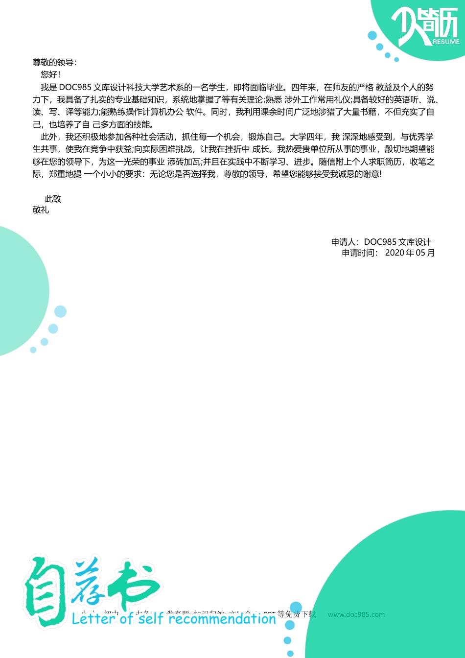 小学、初中、高中各种试卷真题知识归纳文案合同PPT等免费下载www.doc985.com尊敬的领导:您好!我是DOC985文库设计科技大学艺术系的一名学生,即将面临毕业。四年来,在师友的严格教益及个人的努力下,我具备了扎实的专业基础知识,系统地掌握了等有关理论;熟悉涉外工作常用礼仪;具备较好的英语听、说、读、写、译等能力;能熟练操作计算机办公软件。同时,我利用课余时间广泛地涉猎了大量书籍,不但充实了自己,也培养了自己多方面的技能。此外,我还积极地参加各种社会活动,抓住每一个机会,锻炼自己。大学四年,我深深地感受到,与优秀学生共事,使我在竞争中获益;向实际困难挑战,让我在挫折中成长。我热爱贵单位所从事的事业,殷切地期望能够在您的领导下,为这一光荣的事业添砖加瓦;并且在实践中不断学习、进步。随信附上个人求职简历,收笔之际,郑重地提一个小小的要求:无论您是否选择我,尊敬的领导,希望您能够接受我诚恳的谢意!此致敬礼申请人:DOC985文库设计申请时间:2020年05月