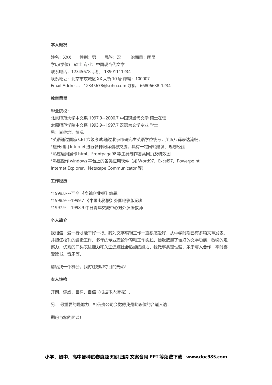 小学、初中、高中各种试卷真题知识归纳文案合同PPT等免费下载www.doc985.com本人概况姓名:XXX性别:男民族:汉治面目:团员学历(学位):硕士专业:中国现当代文学联系电话:12345678手机:13901111234联系地址:北京市东城区XX大街10号邮编:100007EmailAddress:12345678@sohu.com呼机:66806688-1234教育背景毕业院校:北京师范大学中文系1997.9--2000.7中国现当代文学硕士在读太原师范学院中文系1993.9--1997.7汉语言文学专业学士另:其他培训情况*英语通过国家CET六级考试,通过北京市研究生英语学位统考,英汉互译表达流畅。*擅长利用Internet进行各种网际信息交流,具有一定网站建设、规划经验*熟练运用操作html、Frontpage98等工具制作各类网页及特效图*熟练操作windows平台上的各类应用软件(如Word97、Excel97、PowerpointInternetExplorer、NetscapeCommunicator等)工作经历*1999.8---至今《乡镇企业报》编辑*1998.9---1999.7《中国电影报》外国电影版记者*1997.9---1998.9中日青年交流中心对外汉语教师个人简介我相信,爱一行才能干好一行。我对文字编辑工作一直很感爱好,从中学时期已有多篇文章发表,并担任校刊的编辑工作。多年的专业理论学习和工作实践,使我把握了较好的文字功底,敏锐的观察力,优秀的口头表达能力和关注追踪社会热点的能力。我做事条理性强,乐于与人合作,平时喜爱读书、音乐等。请给我一个机会,我将还您以夺目的光彩!本人性格开朗、谦虚、自律、自信(根据本人情况)。另:最重要的是能力,相信贵公司会觉得我是此职位的合适人选!期盼与您的面谈!小学、初中、高中各种试卷真题知识归纳文案合同PPT等免费下载www.doc985.com