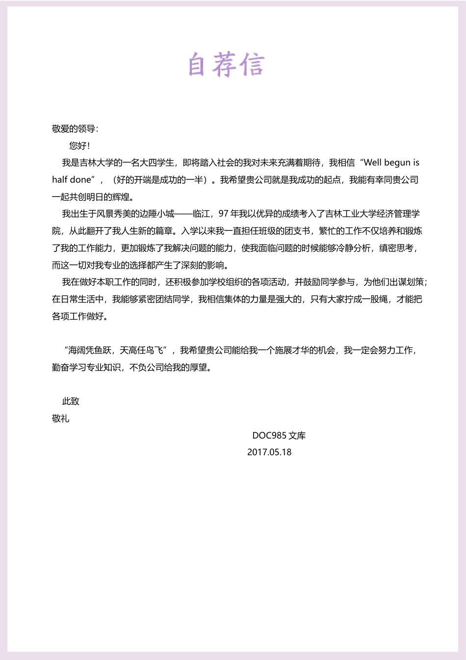 小学、初中、高中各种试卷真题知识归纳文案合同PPT等免费下载www.doc985.com电话:18688888888姓名:DOC985文库邮箱:888888@qq.com小学、初中、高中各种试卷真题知识归纳文案合同PPT等免费下载www.doc985.com职业技能:初级会计证会计从业资格证计算机技能:ERP软件英语师全国计算机等级二级熟练使用SPSS、用友语言水平:英语(CET-6)2014.06~2015.02奇虎360科技有限公司财务中心实习生负责原始凭证(纸质版/电子版)的维护与整理工作负责结算发票的审核计算,年审与季审的抽凭工作负责与总账、出纳及其他各组的交接工作,进行付款单核对在6个月实习期间,将26家公司主体10个月的5400份凭证装订成册2014.03~2014.06中以联科电子安装工程公财务部实习生亚洲地区领先的安防系统集成商根据公司财务的要求,审核并处理员工个人费用及公司的一般经费使用NetSuite系统录入凭证及会计批准工作,协助AP会计完成付款会计凭证、账簿及其他财务资料整理归档,发票购领、开具及登记保管2013.04~2015.06文学社书记负责策划和组织社团活动如:灯谜活动、小学支教、汉字英雄等精品活动,丰富了社员文化生活提升了社团魅力,同时沟通校内校外文学社团交流,提高了社员文化素养。并获得“四星级社团”荣誉称号。1年会计实习,熟悉会计工作流程,熟悉会计软件用友的使用。拥有一点的组织策划能力,曾多次组织策划社团活动。勤奋好学,吃苦耐劳,诚实守信2011.09-2015.06中央民族大学会计学本科2011.09-2015.06中央民族大学会计学本科QQ:88888888电话:18688888888邮件:88888888@qq.com姓名:DOC985文库出生日期:1990.09地址:北京朝阳区技能证书教育背景自我评价校园经历实习经历小学、初中、高中各种试卷真题知识归纳文案合同PPT等免费下载www.doc985.com敬爱的领导:您好!我是吉林大学的一名大四学生,即将踏入社会的我对未来充满着期待,我相信“Wellbegunishalfdone”,(好的开端是成功的一半)。我希望贵公司就是我成功的起点,我能有幸同贵公司一起共创明日的辉煌。我出生于风景秀美的边陲小城——临江,97年我以优异的成绩考入了吉林工业大学经济管理学院,从此翻开了我人生新的篇章。入学以来我一直担任班级的团支书,繁忙的工作不仅培养和锻炼了我的工作能力,更加锻炼了我解决问题的能力,使我面临问题的时候能够冷静分析,缜密思考,而这一切对我专业的选择都产生了深刻的影响。我在做好本职工作的同时,还积极参加学校组织的各项活动,并鼓励同学参与,为他们出谋划策;在日常生活中,我能够紧密团结同学,我相信集体的力量是强大的,只有大家拧成一股绳,才能把各项工作做好。“海阔凭鱼跃,天高任鸟飞”,我希望贵公司能给我一个施展才华的机会,我一定会努力工作,勤奋学习专业知识,不负公司给我的厚望。此致敬礼DOC985文库2017.05.18小学、初中、高中各种试卷真题知识归纳文案合同PPT等免费下载www.doc985.com