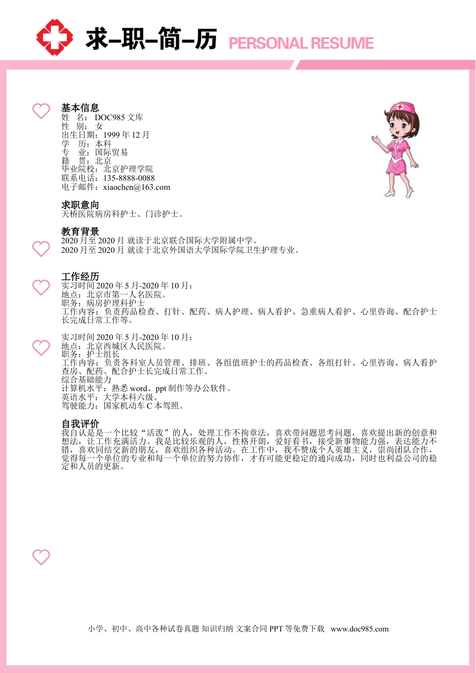 小学、初中、高中各种试卷真题知识归纳文案合同PPT等免费下载www.doc985.com求职简历姓名:DOC985文库联系电话:电子邮箱:毕业院校:所学专业:基本信息姓名:DOC985文库性别:女出生日期:1999年12月学历:本科专业:国际贸易籍贯:北京毕业院校:北京护理学院联系电话:135-8888-0088电子邮件:xiaochen@163.com求职意向天桥医院病房科护士、门诊护士。教育背景2020月至2020月就读于北京联合国际大学附属中学。2020月至2020月就读于北京外国语大学国际学院卫生护理专业。工作经历实习时间2020年5月-2020年10月:地点:北京市第一人名医院。职务:病房护理科护士工作内容:负责药品检查、打针、配药、病人护理、病人看护、急重病人看护、心里咨询、配合护士长完成日常工作等。实习时间2020年5月-2020年10月:地点:北京西城区人民医院。职务:护士组长工作内容:负责各科室人员管理、排班、各组值班护士的药品检查、各组打针、心里咨询、病人看护查房、配药、配合护士长完成日常工作。综合基础能力计算机水平:熟悉word、ppt制作等办公软件。英语水平:大学本科六级。驾驶能力:国家机动车C本驾照。自我评价我自认是是一个比较“活泼”的人,处理工作不拘章法,喜欢带问题思考问题,喜欢提出新的创意和想法,让工作充满活力。我是比较乐观的人,性格开朗,爱好看书,接受新事物能力强,表达能力不错,喜欢同结交新的朋友,喜欢组织各种活动。在工作中,我不赞成个人英雄主义,崇尚团队合作,觉得每一个单位的专业和每一个单位的努力协作,才有可能更稳定的通向成功,同时也利益公司的稳定和人员的更新。小学、初中、高中各种试卷真题知识归纳文案合同PPT等免费下载www.doc985.com自荐信:尊敬的领导你好,我丫丫精饰,现年28岁,来自,是北京大学校护理专业专业一名学生。今天我是怀着十分尊重而又感激的心情呈上这份自荐书的。之所以尊重,是我对这份职业的敬仰,因为护士是人们眼中的白衣天使,我相信的知识和能力不会让你们失望,我有能力做好这个称谓;之所以感激,是因为您能够给我一次的机会,不管结果如何,我都将拿出我最大的努力来面对。在这里,我没有任何有权威人士的推荐书来为我谋得职业,也没有“制造”那么多的获奖证明,而我只能凭借我在学校多年的实习经历和扎实的专业基础,如果说我有什么优点的话,那就是我比较活跃的心态。大学是一个很容易迷失的地方,现在很多人都在大学里过着“象牙塔”般的生活,浑浑噩噩的风一样的过往,而我没有选择那样的安逸,所以我成了大多数人眼里“不合群”分子,因为我深知,我没有李刚一样的爸爸,我只能靠自己的双手和努力争取一片属于自己的天空,大学期间,我除了上课学习之外,最多的就是去校外的医院兼职,这也为我的专业和工作经验有了很多的帮助,通过自己的努力,我不再是青涩的学子,我有了同龄学生不一样的社会交往能力和工作能力,此时此刻,我也感激我当初的选择,虽然失去了美好的同学朋友圈和难以忘记大学校园生活,但我觉得这是值得的。我坚信,路是一步一步走出来的。只有脚踏实地,努力工作,才能做出更出色的成绩!“器必试而先知其利钝,马必骑而后知其良驽。”我深信:只要我找到一个支点,就能撬起整个地球,只要给我一片土壤,我会用年轻的生命云耕耘,您不仅能看到我的成功,而且能够收获整个秋天。这就是我的自信和能力的承诺。剑鸣厘中,期之以声。热切期望我这拳拳寸草心、浓浓赤诚情能与您同呼吸、共命运、同发展、求进步。请各位领导给我一个机会,我会用行动来证明自己。最后,衷心祝愿医院事业平稳发展,祝大家工作顺利!自荐人:DOC985文库20xx年12月12小学、初中、高中各种试卷真题知识归纳文案合同PPT等免费下载www.doc985.com小学、初中、高中各种试卷真题知识归纳文案合同PPT等免费下载www.doc985.com真诚的期待您的回复!