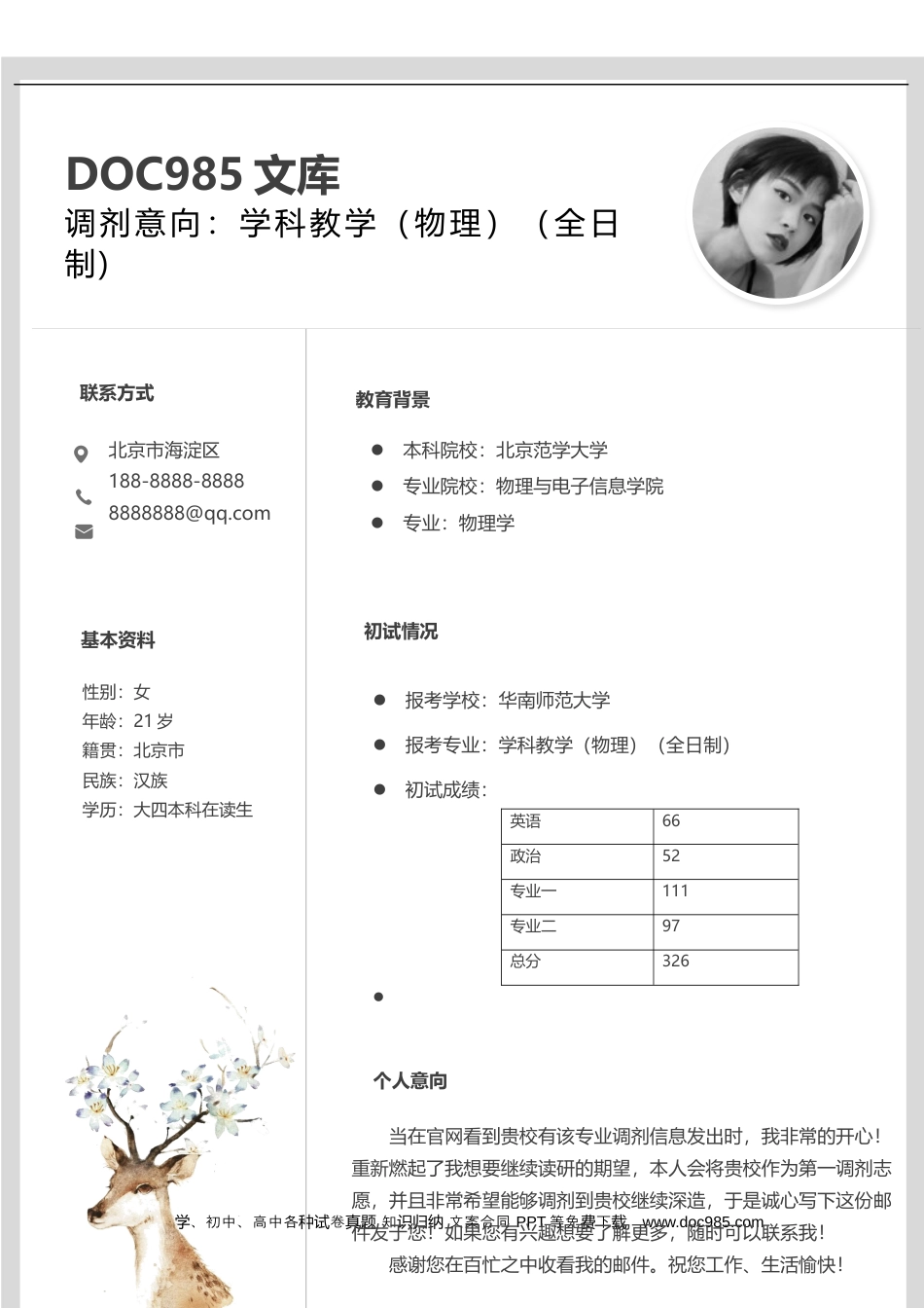 小、初中、高中各卷知文案合同学种试真题识归纳PPT等免下费载www.doc985.comDOC985文库调剂意向:学科教学(物理)(全日制)北京市海淀区188-8888-88888888888@qq.com初试情况报考学校:华南师范大学报考专业:学科教学(物理)(全日制)初试成绩:英语66政治52专业一111专业二97总分326本科院校:北京范学大学专业院校:物理与电子信息学院专业:物理学性别:女年龄:21岁籍贯:北京市民族:汉族学历:大四本科在读生教育背景联系方式基本资料个人意向当在官网看到贵校有该专业调剂信息发出时,我非常的开心!重新燃起了我想要继续读研的期望,本人会将贵校作为第一调剂志愿,并且非常希望能够调剂到贵校继续深造,于是诚心写下这份邮件发于您!如果您有兴趣想要了解更多,随时可以联系我!感谢您在百忙之中收看我的邮件。祝您工作、生活愉快!