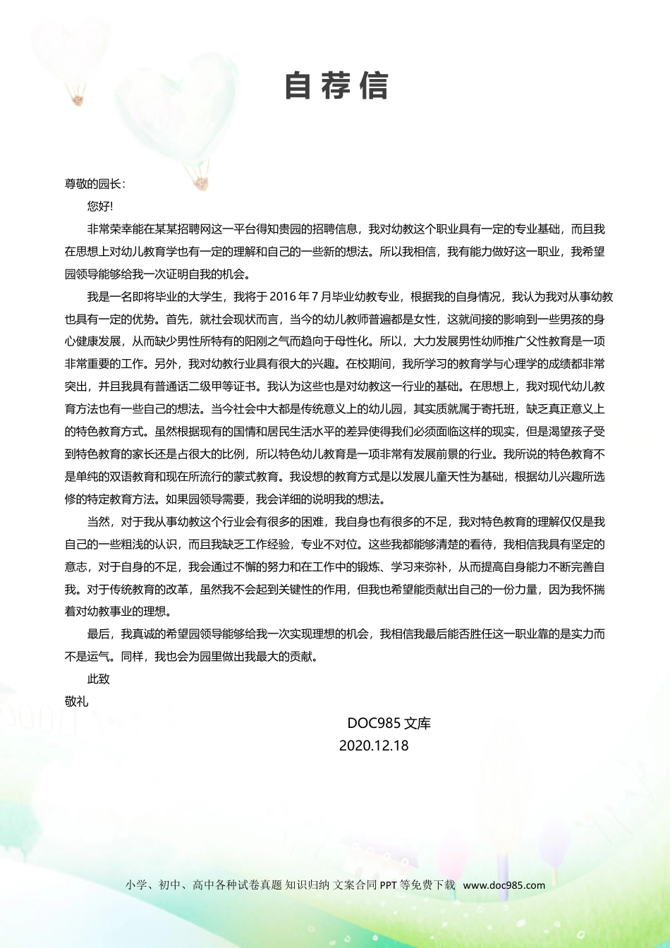 小学、初中、高中各种试卷真题知识归纳文案合同PPT等免费下载www.doc985.com求职意向:学前教育DOC985文库设计180714000023567688@qq.com小学、初中、高中各种试卷真题知识归纳文案合同PPT等免费下载www.doc985.com教育背景求职意向:教师2012.09-2016.07上海师范学院幼儿教育本科主修课程幼儿卫生保育教程、幼儿心理学、幼儿教育概论、幼儿园教育活动的设计与指导、教师口语、幼儿唱歌、幼儿绘画、幼儿舞蹈、幼师听话与说话、幼儿手工等。DOC985文库设计奖项证书自我评价幼儿教育教师资格证获得国家英语六级证书国家普通话二级乙等证书全国计算机一级等级证书实践经历1994.08123-4567-8901123456@qq.com上海市浦东区本人热爱祖国、热爱教育事业,立志于教育行业,崇敬教育职业精神;在教学方法上循循善诱,大胆创新,注重培养学生独立思考问题的能力,并能很好的处理师生关系。性格开朗活泼、思维严谨、乐观豁达、有亲和力、容易相处,团队荣誉感强。2016.01-2016.11上海优异幼儿园幼儿教师负责日常教学工作,比如备课、上课及课程管理工作;负责并维护学生和家长的管理工作;负责幼儿的一日生活习惯,行为习惯和学习习惯培养;做好教务部门安排的任务。2014.09-2015.12上海吉姆早教中心幼儿教师负责中心的课程教学工作,保证授课质量;为家长提供积极有效的沟通与服务;积极协助中心举办的亲子活动和市场活动。小学、初中、高中各种试卷真题知识归纳文案合同PPT等免费下载www.doc985.com尊敬的园长:您好!非常荣幸能在某某招聘网这一平台得知贵园的招聘信息,我对幼教这个职业具有一定的专业基础,而且我在思想上对幼儿教育学也有一定的理解和自己的一些新的想法。所以我相信,我有能力做好这一职业,我希望园领导能够给我一次证明自我的机会。我是一名即将毕业的大学生,我将于2016年7月毕业幼教专业,根据我的自身情况,我认为我对从事幼教也具有一定的优势。首先,就社会现状而言,当今的幼儿教师普遍都是女性,这就间接的影响到一些男孩的身心健康发展,从而缺少男性所特有的阳刚之气而趋向于母性化。所以,大力发展男性幼师推广父性教育是一项非常重要的工作。另外,我对幼教行业具有很大的兴趣。在校期间,我所学习的教育学与心理学的成绩都非常突出,并且我具有普通话二级甲等证书。我认为这些也是对幼教这一行业的基础。在思想上,我对现代幼儿教育方法也有一些自己的想法。当今社会中大都是传统意义上的幼儿园,其实质就属于寄托班,缺乏真正意义上的特色教育方式。虽然根据现有的国情和居民生活水平的差异使得我们必须面临这样的现实,但是渴望孩子受到特色教育的家长还是占很大的比例,所以特色幼儿教育是一项非常有发展前景的行业。我所说的特色教育不是单纯的双语教育和现在所流行的蒙式教育。我设想的教育方式是以发展儿童天性为基础,根据幼儿兴趣所选修的特定教育方法。如果园领导需要,我会详细的说明我的想法。当然,对于我从事幼教这个行业会有很多的困难,我自身也有很多的不足,我对特色教育的理解仅仅是我自己的一些粗浅的认识,而且我缺乏工作经验,专业不对位。这些我都能够清楚的看待,我相信我具有坚定的意志,对于自身的不足,我会通过不懈的努力和在工作中的锻炼、学习来弥补,从而提高自身能力不断完善自我。对于传统教育的改革,虽然我不会起到关键性的作用,但我也希望能贡献出自己的一份力量,因为我怀揣着对幼教事业的理想。最后,我真诚的希望园领导能够给我一次实现理想的机会,我相信我最后能否胜任这一职业靠的是实力而不是运气。同样,我也会为园里做出我最大的贡献。此致敬礼DOC985文库2020.12.18自荐信小学、初中、高中各种试卷真题知识归纳文案合同PPT等免费下载www.doc985.com