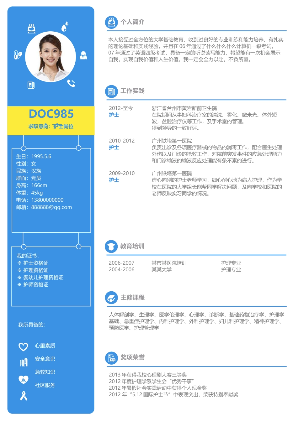2013年获得我校心理剧大赛三等奖2012年度护理学系学生会“优秀干事”2012年暑假社会实践活动中获得个人现金奖2012年“5.12国际护士节”中表现突出,荣获特别奉献奖2006-2007某市某医院培训护理专业2004-2006某某大学护理专业人体解剖学、生理学、医学伦理学、心理学、诊断学、基础药物治疗学、护理学基础、急重症护理学、内科护理学、外科护理学、妇儿科护理学、精神护理学、预防医学、护理管理学DOC985文库求职意向:护士岗位生日:1995.5.6性别:女民族:汉族群面:党员身高:166cm体重:45kg电话:13800000000邮箱:888888@qq.com我的证书:护士资格证❈护理资格证❈婴幼儿护理资格证❈护师资格证❈我所具备的:心里素质安全意识急救知识社区服务个人简介工作实践教育培训主修课程奖项荣誉本人接受过全方位的大学基础教育,收到过良好的专业训练和能力培养,有扎实的理论基础和实践经验,并且在06年通过了什么什么什么计算机一级考试,07年通过了英语四级考试,具备一定的听说读写能力,希望能有一次机会展示自我,实现自我价值和人生价值,我一定会全力以赴,不负所望。2012-至今浙江省台州市黄岩新前卫生院护士在院期间从事妇科治疗室的清洗、雾化、微米光、体外短波,盆腔治疗仪等工作,及手术室的管理。得到领导的一致好评。2010-2012广州铁塔第一医院护士负责出诊及各项医疗器械的物品的消毒工作,配合医生处理外伤以及门诊的抢救工作,对院前突发事件的应急处理能力和门诊输液的输液反应处理能有条不紊的进行。2009-2010广州铁塔第一医院护士虚心向别的护士老师学习,细心耐心地为病人护理,作为学校在医院的大学组长能帮同学解决问题,及向学校和医院的老师反映实习同学的情况。