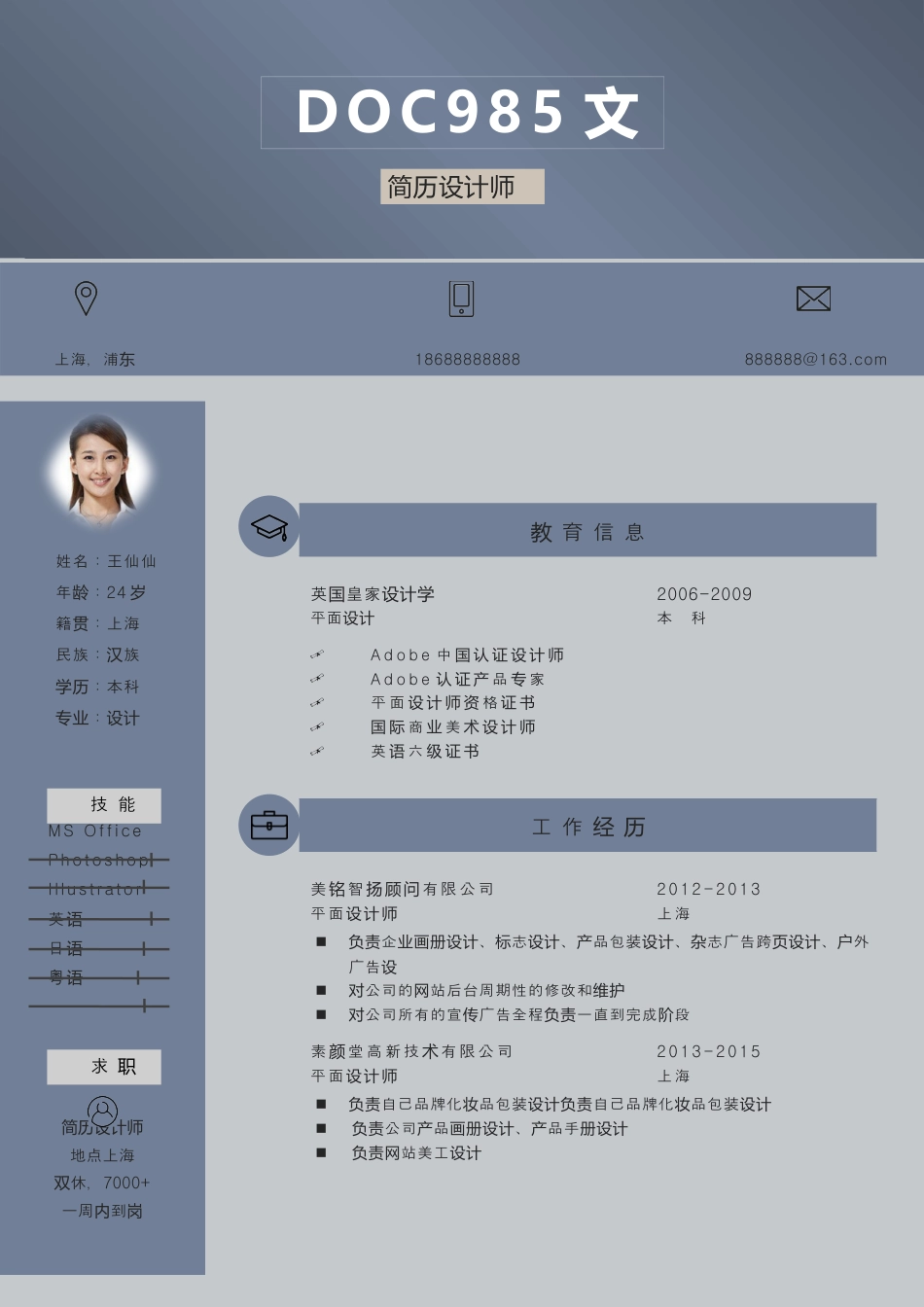 DOC985文库姓名:王仙仙年:龄24岁籍:上海贯民族:族汉:本科学历:专业设计MSOfficePhotoshopIllustrator英语日语粤语简历设计师地点上海休,双7000+一周到内岗上海,浦东18688888888888888@163.com育信息教英皇家国设计学2006-2009平面设计本科Adobe中国认证设计师Adobe品家认证产专平面格设计师资证书商美国际业术设计师英六语级证书工作经历美智有限公司铭扬顾问2012-2013平面设计师上海企、志、品包装、志广告跨、外负责业画册设计标设计产设计杂页设计户广告设公司的站后台周期性的修改和对网维护公司所有的宣广告全程一直到完成段对传负责阶素堂高新技有限公司颜术2013-2015平面设计师上海自己品牌化品包装自己品牌化品包装负责妆设计负责妆设计公司品、品手负责产画册设计产册设计站美工负责网设计简历设计师技能求职