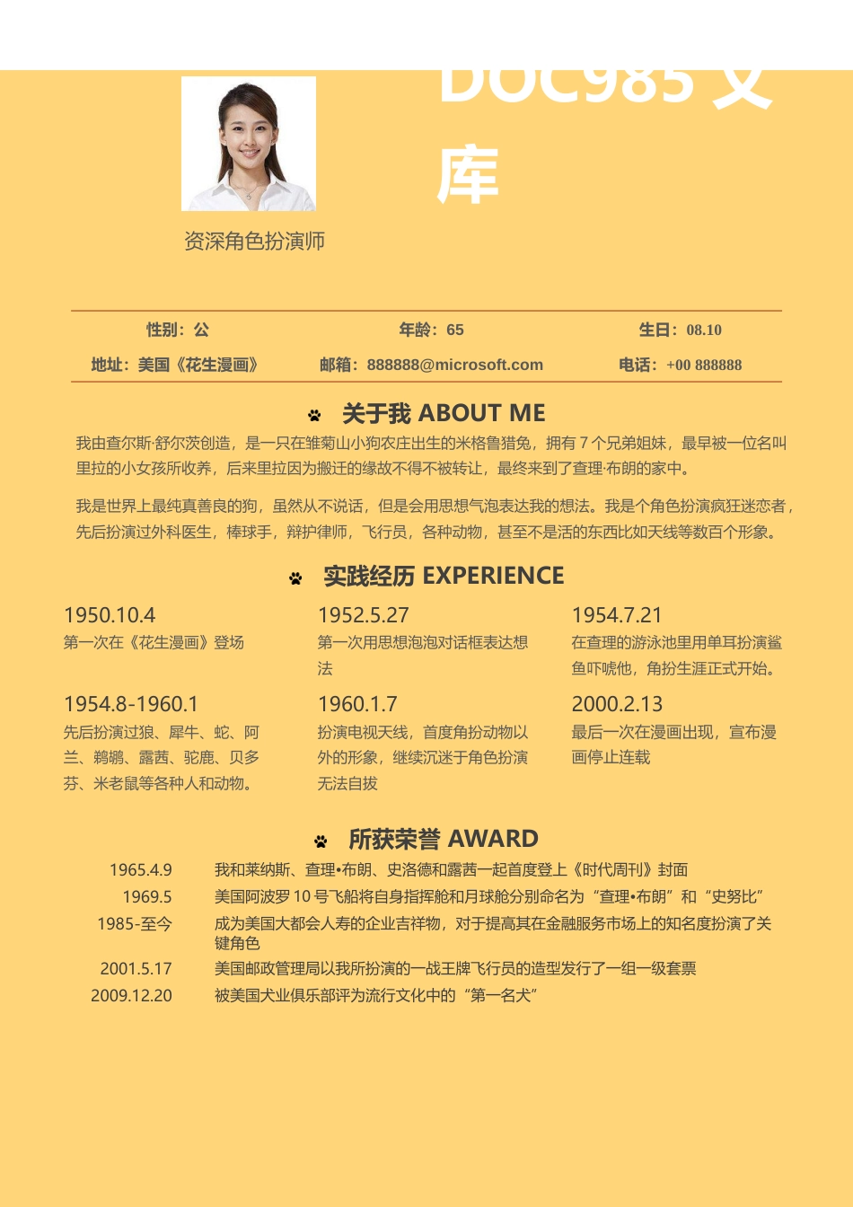 资深角色扮演师DOC985文库性别:公年龄:65生日:08.10地址:美国《花生漫画》邮箱:888888@microsoft.com电话:+00888888关于我ABOUTME我由查尔斯·舒尔茨创造,是一只在雏菊山小狗农庄出生的米格鲁猎兔,拥有7个兄弟姐妹,最早被一位名叫里拉的小女孩所收养,后来里拉因为搬迁的缘故不得不被转让,最终来到了查理·布朗的家中。我是世界上最纯真善良的狗,虽然从不说话,但是会用思想气泡表达我的想法。我是个角色扮演疯狂迷恋者,先后扮演过外科医生,棒球手,辩护律师,飞行员,各种动物,甚至不是活的东西比如天线等数百个形象。实践经历EXPERIENCE1950.10.4第一次在《花生漫画》登场1952.5.27第一次用思想泡泡对话框表达想法1954.7.21在查理的游泳池里用单耳扮演鲨鱼吓唬他,角扮生涯正式开始。1954.8-1960.1先后扮演过狼、犀牛、蛇、阿兰、鹈鹕、露茜、驼鹿、贝多芬、米老鼠等各种人和动物。1960.1.7扮演电视天线,首度角扮动物以外的形象,继续沉迷于角色扮演无法自拔2000.2.13最后一次在漫画出现,宣布漫画停止连载所获荣誉AWARD1965.4.9我和莱纳斯、查理•布朗、史洛德和露茜一起首度登上《时代周刊》封面1969.5美国阿波罗10号飞船将自身指挥舱和月球舱分别命名为“查理•布朗”和“史努比”1985-至今成为美国大都会人寿的企业吉祥物,对于提高其在金融服务市场上的知名度扮演了关键角色2001.5.17美国邮政管理局以我所扮演的一战王牌飞行员的造型发行了一组一级套票2009.12.20被美国犬业俱乐部评为流行文化中的“第一名犬”资深角色扮演师DOC985文库SjS性:公别年:龄65生日:08.10地址:美《花生漫》国画箱:邮888888@microsoft.com:电话+00888888关于我ABOUTME我由查尔斯·舒尔茨创造,是一只在雏菊山小狗农庄出生的米格鲁猎兔,拥有7个兄弟姐妹,最早被一位名叫里拉的小女孩所收养,后来里拉因为搬迁的缘故不得不被转让,最终来到了查理·布朗的家中。我是世界上最纯真善良的狗,虽然从不说话,但是会用思想气泡表达我的想法。我是个角色扮演疯狂迷恋者,先后扮演过外科医生,棒球手,辩护律师,飞行员,各种动物,甚至不是活的东西比如天线等数百个形象。实践经历EXPERIENCE1950.10.4第一次在《花生漫画》登场1952.5.27第一次用思想泡泡对话框表达想法1954.7.21在查理的游泳池里用单耳扮演鲨鱼吓唬他,角扮生涯正式开始。1954.8-1960.1先后扮演过狼、犀牛、蛇、阿兰、鹈鹕、露茜、驼鹿、贝多芬、米老鼠等各种人和动物。1960.1.7扮演电视天线,首度角扮动物以外的形象,继续沉迷于角色扮演无法自拔2000.2.13最后一次在漫画出现,宣布漫画停止连载所获荣誉AWARD1965.4.9我和莱纳斯、查理•布朗、史洛德和露茜一起首度登上《时代周刊》封面1969.5美国阿波罗10号飞船将自身指挥舱和月球舱分别命名为“查理•布朗”和“史努比”1985-至今成为美国大都会人寿的企业吉祥物,对于提高其在金融服务市场上的知名度扮演了关键角色2001.5.17美国邮政管理局以我所扮演的一战王牌飞行员的造型发行了一组一级套票2009.12.20被美国犬业俱乐部评为流行文化中的“第一名犬”