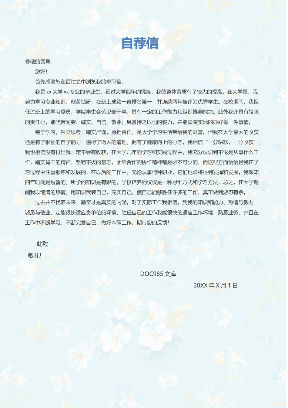 DOC985文库求职意向:通用简历教育经历文秘专业上海职业技术学院2012-2016专业课程:秘书学、秘书写作、秘书实务、大学语文、公共关系学、教育学、心理学、平面设计、秘书实务、公文写作、公文处理、档案学、办公室协调工作、计算机中英文录入、编辑、排版、制表、速记、书法、英文打字等工作经验部门文员上海善显科技有限公司2016-至今oi公司日常办公室业务,了解会员单位服务需求信息,进行有效跟踪,做好指导和服务工作;受理会员单位需求,传递交易市场需求,与相关部门紧密配合,协调沟通,维护客户关系;准确记录会员单位的需求,并将客户意愿及时反馈给相关人员进行跟进;后期做好会员单位培训和指导工作。行政、客户资料整理,完善和保管客户资料;上级领导交办的其他工作。宣传干事上海职业技术学院学生会2015-至今负责校学生会相关活动的宣传工作,带领部门成员制作宣传海报、传单、横幅等宣传材料;多次举办学校“社区文化节”、“消防知识竞答赛”、“预防安全隐患征文大赛”等大型活动;及时完成学生会的其他工作,工作得到学校老师认可。自我评价本人性格开朗、稳重、有活力,待人热情、真诚。有较强的组织能力、和团体协作精神,良好的社交能力,善于处理各种人际关系。能迅速的适应各种环境,并融合其中。能把企业当作家庭,企业的财富就是我的财富,在努力为企业服务的过程中实现自身价值。荣誉证书荣誉奖励国家级一等奖学金英语水平大学英语6级证书(CET-6)办公技能办公技能:熟练使用WORD、EXCEL、PPT办公软件。兴趣爱好游泳跑步篮球音乐绘画旅行DOC985文库求职意向:通用简历联系方式手机:18688888888邮箱:123456@qq.comv信:地址:上海市浦东区RESUME基本信息出生日期:1994-08-21籍贯:江苏南京民族:汉政治面貌:中共党员自荐信尊敬的领导:您好!首先感谢您在百忙之中浏览我的求职信。我是xx大学xx专业的毕业生。经过大学四年的锻炼,我的整体素质有了较大的提高。在大学里,我努力学习专业知识,刻苦钻研,在班上成绩一直排名第一,并连续两年被评为优秀学生。在校期间,我担任过班上的学习委员,学院学生会劳卫部干事,具有一定的工作能力和组织协调能力。此外我还具有较强的责任心,能吃苦耐劳、诚实、自信、敬业;具备持之以恒的毅力,并能脚踏实地的办好每一件事情。善于学习,独立思考,踏实严谨,勇担责任,是大学学习生活带给我的财富。但我在大学最大的收获还是有了很强的自学能力,懂得了做人的道理,拥有了健康向上的心态。我相信“一分耕耘,一分收获”,我也相信没有付出就一定不会有收获。在大学几年的学习和实践过程中,我充分认识到不论是从事什么工作,踏实肯干的精神,坚韧不拔的意志,团结合作的协作精神都是必不可少的,而这些方面恰恰是我在学习过程中注重锻炼和发展的,在以后的工作中,无论从事何种职业,它们也必将得到发挥和发展。我深知四年时间是短暂的,所学的知识是有限的,学校培养的仅仅是一种思维方式和学习方法,总之,在大学期间我以饱满的热情,用知识武装自己,充实自己,使自己能够胜任许多的工作,真正做到游刃有余。过去并不代表未来,勤奋才是真实的内涵。对于实际工作我相信,凭我的知识和能力、热情与毅力、诚恳与敬业,定能很快适应贵单位的环境,胜任自己的工作我能很快的适应工作坏境,熟悉业务,并且在工作中不断学习,不断完善自己,做好本职工作。期待您的反馈!此致敬礼!DOC985文库20XX年X月1日期待您的回复