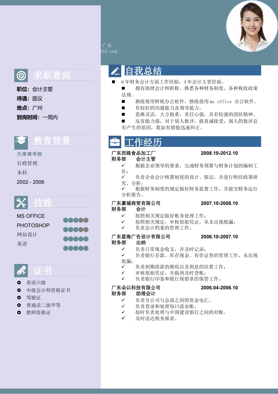 DOC985文库求职意向:会计主管年龄:24岁学历:本科籍贯:广东手机:18688888888|Email:888888@163.com求职意向职位:会计主管待遇:面议地点:广州到岗时间:一周内教育背景天津商学院行政管理本科2002-2006技能MSOFFICEPHOTOSHOP网站设计英语证书英语六级中级会计师资格证书驾驶证普通话二级甲等教师资格证自我总结6年财务会计方面工作经验,4年会计主管经验。拥有助理会计师职称,熟悉各种财务制度,各种税收政策法规。熟练使用财税办公软件,熟练使用msoffice办公软件。有较好的沟通能力及领导能力。思维灵活,大方稳重,责任心强,具有较强的团队精神。反省能力强,对于别人批评,能真诚接受,别人的批评总有产生的原因,我如有错能迅速纠正。工作经历广东西路食品加工厂2008.10-2012.10财务部会计主管根据企业领导的要求,完成财务预算与财务计划的编制工作;负责企业会计核算制度的设计、拟定,并进行财经政策研究、分析;根据财务制度的规定做好财务监督工作,并提交财务运行分析报告。广东嘉城商贸有限公司2007.10-2008.10财务部会计按照相关规定做好账务处理工作;按照相关规定,审核原始凭证,从未出现纰漏;负责会计档案的管理工作。广东蓝海广告设计有限公司2006.10-2007.10财务部出纳负责日常现金收支,并及时记录;负责银行存款、库存现金、有价证券的管理工作,未出现纰漏;负责到期借款的催收以及利息的结算工作;审核原始凭证,并做到及时登账;负责银行印鉴和银行保留章的保管工作。广东朵以科技有限公司2006.04-2006.10财务部助理会计负责分公司与总部之间的资金电汇。负责登录和处理每曰流水账。按时负责处理与中国建设银行之间的对账。及时送达税务报表。
