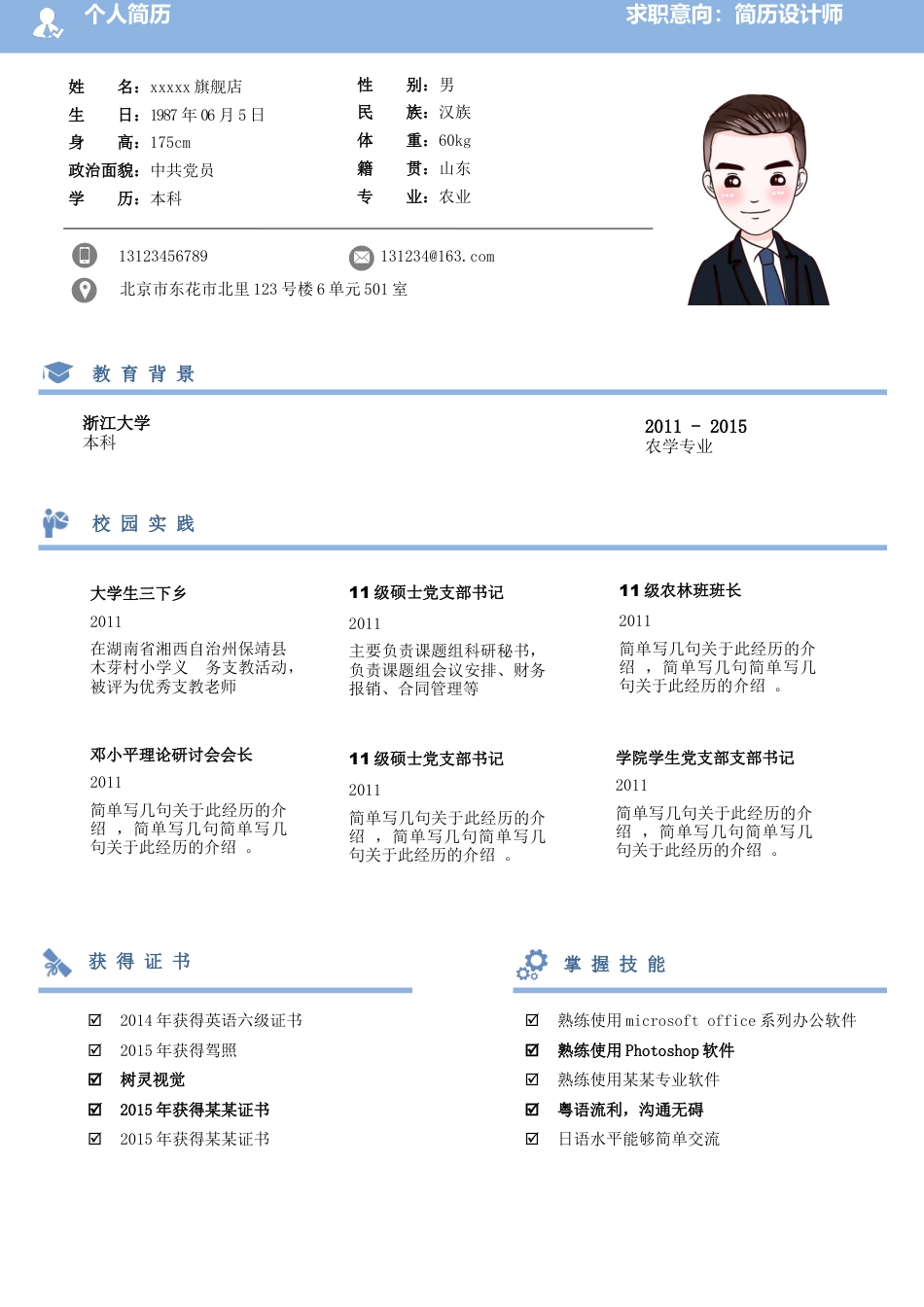 性别:男民族:汉族体重:60kg籍贯:山东专业:农业姓名:xxxxx旗舰店生日:1987年06月5日身高:175cm政治面貌:中共党员学历:本科13123456789131234@163.com北京市东花市北里123号楼6单元501室教育背景个人简历求职意向:简历设计师浙江大学本科2011-2015农学专业获得证书2014年获得英语六级证书2015年获得驾照树灵视觉2015年获得某某证书2015年获得某某证书熟练使用microsoftoffice系列办公软件熟练使用Photoshop软件熟练使用某某专业软件粤语流利,沟通无碍日语水平能够简单交流掌握技能大学生三下乡2011在湖南省湘西自治州保靖县木芽村小学义务支教活动,被评为优秀支教老师11级硕士党支部书记2011主要负责课题组科研秘书,负责课题组会议安排、财务报销、合同管理等校园实践11级农林班班长2011简单写几句关于此经历的介绍,简单写几句简单写几句关于此经历的介绍。邓小平理论研讨会会长2011简单写几句关于此经历的介绍,简单写几句简单写几句关于此经历的介绍。11级硕士党支部书记2011简单写几句关于此经历的介绍,简单写几句简单写几句关于此经历的介绍。学院学生党支部支部书记2011简单写几句关于此经历的介绍,简单写几句简单写几句关于此经历的介绍。个人简历求职意向:简历设计师学习上:勤奋刻苦、认真好学、脚踏实地、能不断地充实自己的专业知识,并主动吸收新知识。生活上:活泼开朗、乐观向上、兴趣广泛、爱好体育运动;适应力强、坚忍不拔、吃苦耐劳、勇于迎接新挑战;在同学中,有良好的人际关系。工作上:具有较强的团队管理能力,独立问题解决能力和较强的执行能力,具有较强的抗压能力,责任心强,具有良好的沟通能力和团队合作意识。自我评价工作经历XXXXXX高新技术有限公司平面设计师2012–2013上海协助总经理,成功召开公司年终“行动与目标”和“亮话”面对面沟通会修改为工作内容、所获业绩等情况说明,修改为工作内容、所获业绩等情况说明XXXXX高新技术有限公司平面设计师2012–2013上海协助总经理,成功召开公司年终“行动与目标”和“亮话”面对面沟通会修改为工作内容、所获业绩等情况说明,修改为工作内容、所获业绩等情况说明XXXXX高新技术有限公司平面设计师2012–2013上海协助总经理,成功召开公司年终“行动与目标”和“亮话”面对面沟通会修改为工作内容、所获业绩等情况说明,修改为工作内容、所获业绩等情况说明2011年被评为湖南省“省优秀毕业生”,湘潭大学“校优秀毕业生”2011年获湘潭大学“优秀共产党员”、湘潭大学“优秀辅导组成员”荣誉称号2012年获全国数学建模竞赛三等奖,湘潭大学物理竞赛二等奖2012年获校“优秀社团工作者”荣誉称号2013年荣获中国科学院“优秀班干部”,“三好学生”荣誉称号2013年获中国科学院金属研究所“原创科普作品大赛”优秀奖获奖经历