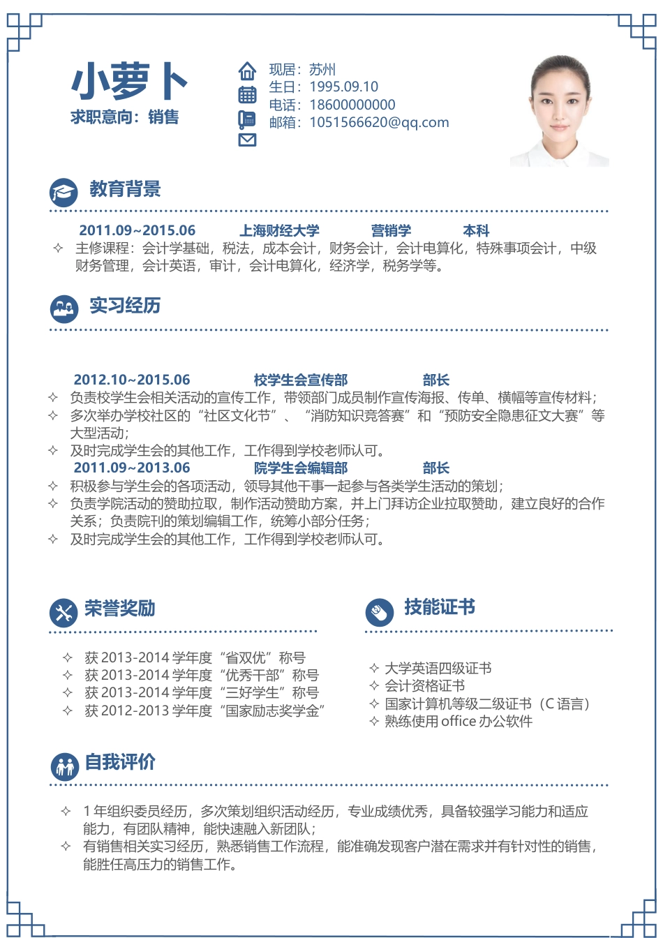 小萝卜求职意向:销售2011.09~2015.06上海财经大学营销学本科主修课程:会计学基础,税法,成本会计,财务会计,会计电算化,特殊事项会计,中级财务管理,会计英语,审计,会计电算化,经济学,税务学等。2012.10~2015.06校学生会宣传部部长负责校学生会相关活动的宣传工作,带领部门成员制作宣传海报、传单、横幅等宣传材料;多次举办学校社区的“社区文化节”、“消防知识竞答赛”和“预防安全隐患征文大赛”等大型活动;及时完成学生会的其他工作,工作得到学校老师认可。2011.09~2013.06院学生会编辑部部长积极参与学生会的各项活动,领导其他干事一起参与各类学生活动的策划;负责学院活动的赞助拉取,制作活动赞助方案,并上门拜访企业拉取赞助,建立良好的合作关系;负责院刊的策划编辑工作,统筹小部分任务;及时完成学生会的其他工作,工作得到学校老师认可。大学英语四级证书会计资格证书国家计算机等级二级证书(C语言)熟练使用office办公软件1年组织委员经历,多次策划组织活动经历,专业成绩优秀,具备较强学习能力和适应能力,有团队精神,能快速融入新团队;有销售相关实习经历,熟悉销售工作流程,能准确发现客户潜在需求并有针对性的销售,能胜任高压力的销售工作。教育背景实习经历技能证书自我评价荣誉奖励现居:苏州生日:1995.09.10电话:18600000000邮箱:1051566620@qq.com获2013-2014学年度“省双优”称号获2013-2014学年度“优秀干部”称号获2013-2014学年度“三好学生”称号获2012-2013学年度“国家励志奖学金”