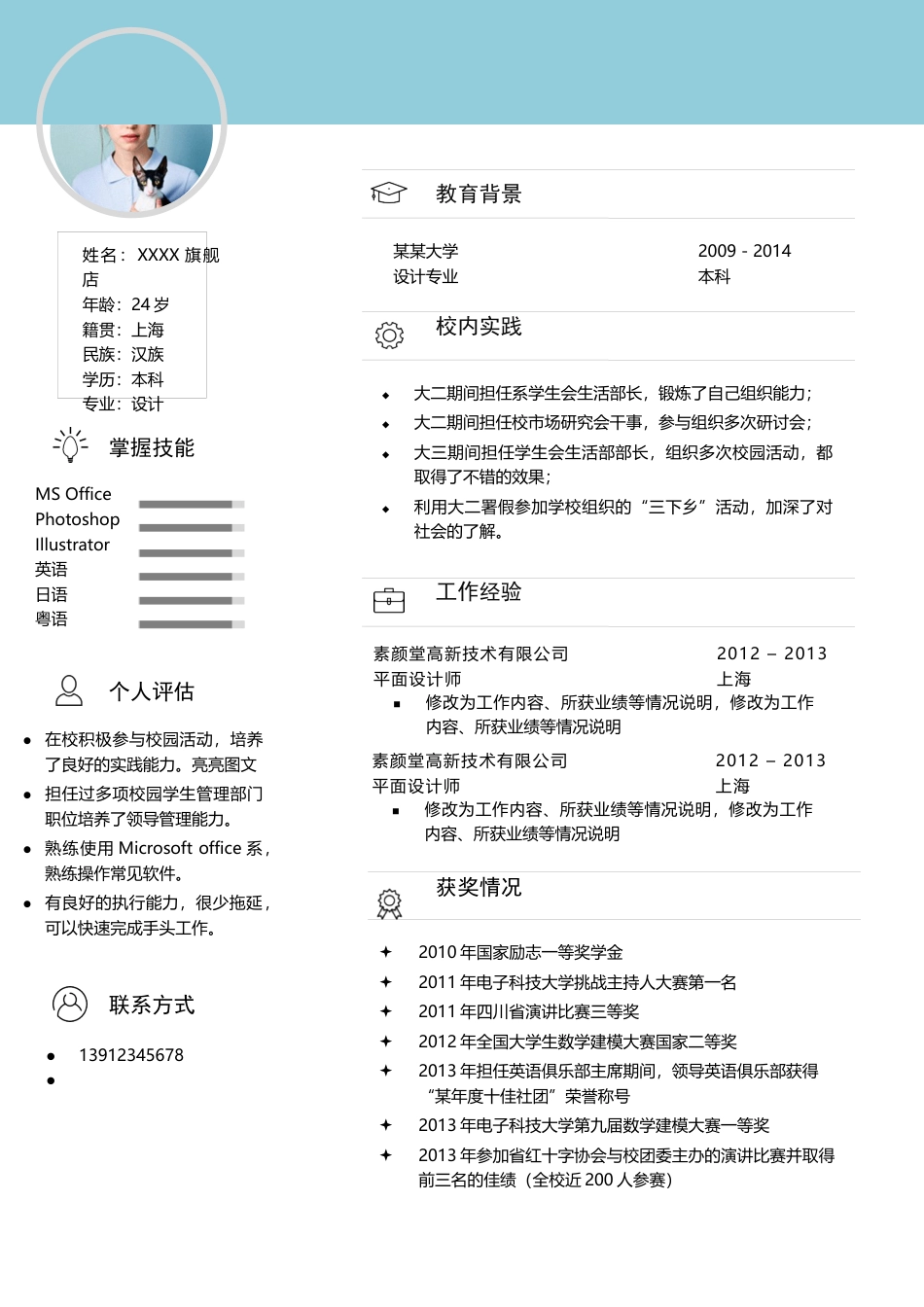 姓名:XXXX旗舰店年龄:24岁籍贯:上海民族:汉族学历:本科专业:设计掌握技能MSOfficePhotoshopIllustrator英语日语粤语联系方式13912345678某某大学设计专业2009-2014本科大二期间担任系学生会生活部长,锻炼了自己组织能力;大二期间担任校市场研究会干事,参与组织多次研讨会;大三期间担任学生会生活部部长,组织多次校园活动,都取得了不错的效果;利用大二署假参加学校组织的“三下乡”活动,加深了对社会的了解。素颜堂高新技术有限公司平面设计师2012–2013上海修改为工作内容、所获业绩等情况说明,修改为工作内容、所获业绩等情况说明素颜堂高新技术有限公司平面设计师2012–2013上海修改为工作内容、所获业绩等情况说明,修改为工作内容、所获业绩等情况说明2010年国家励志一等奖学金2011年电子科技大学挑战主持人大赛第一名2011年四川省演讲比赛三等奖2012年全国大学生数学建模大赛国家二等奖2013年担任英语俱乐部主席期间,领导英语俱乐部获得“某年度十佳社团”荣誉称号2013年电子科技大学第九届数学建模大赛一等奖2013年参加省红十字协会与校团委主办的演讲比赛并取得前三名的佳绩(全校近200人参赛)个人评估在校积极参与校园活动,培养了良好的实践能力。亮亮图文担任过多项校园学生管理部门职位培养了领导管理能力。熟练使用Microsoftoffice系,熟练操作常见软件。有良好的执行能力,很少拖延,可以快速完成手头工作。教育背景校内实践工作经验获奖情况