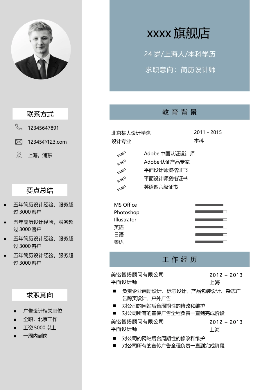 联系方式1234564789112345@123.com上海,浦东要点总结五年简历设计经验,服务超过3000客户xxxx旗舰店angtuwen.tmac求职意向:简历设计师24岁/上海人/本科学历教育背景北京某大设计学院设计专业2011-2015本科Adobe中国认证设计师Adobe认证产品专家平面设计师资格证书平面设计师资格证书英语四六级证书MSOfficePhotoshopIllustrator英语日语粤语工作经历美铭智扬顾问有限公司平面设计师2012–2013上海负责企业画册设计、标志设计、产品包装设计、杂志广告跨页设计、户外广告对公司的网站后台周期性的修改和维护对公司所有的宣传广告全程负责一直到完成阶段美铭智扬顾问有限公司平面设计师2012–2013上海对公司的网站后台周期性的修改和维护对公司所有的宣传广告全程负责一直到完成阶段五年简历设计经验,服务超过3000客户五年简历设计经验,服务超过3000客户五年简历设计经验,服务超过3000客户求职意向广告设计相关职位全职,北京工作工资5000以上一周内到岗