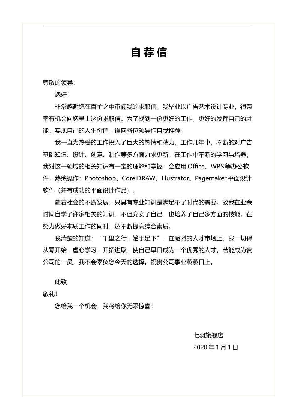 作品展示尊敬的领导:您好!非常感谢您在百忙之中审阅我的求职信,我毕业以广告艺术设计专业,很荣幸有机会向您呈上这份求职信。为了找到一份更好的工作,更好的发挥自己的才能,实现自己的人生价值,谨向各位领导作自我推荐。我一直为热爱的工作投入了巨大的热情和精力,工作几年中,不断的对广告基础知识、设计、创意、制作等多方面力求更新。在工作中不断的学习与培养,我对这一领域的相关知识有一定的理解和掌握:会应用Office、WPS等办公软件,熟练操作:Photoshop、CorelDRAW、Illustrator、Pagemaker平面设计软件(并有成功的平面设计作品)。随着社会的不断发展,只具有专业知识是满足不了时代的需要。故我在业余时间自学了许多相关的知识,不但充实了自己,也培养了自己多方面的技能。在努力做好本质工作的同时,还不断提高综合素质。我清楚的知道:“千里之行,始于足下”,在激烈的人才市场上,我一切得从零开始,虚心学习,开拓进取,使自己早日成为一个优秀的人才。若能成为贵公司的一员,我不会辜负您今天的选择。祝贵公司事业蒸蒸日上。此致敬礼!您给我一个机会,我将给你无限惊喜!七羽旗舰店2020年1月1日自荐信
