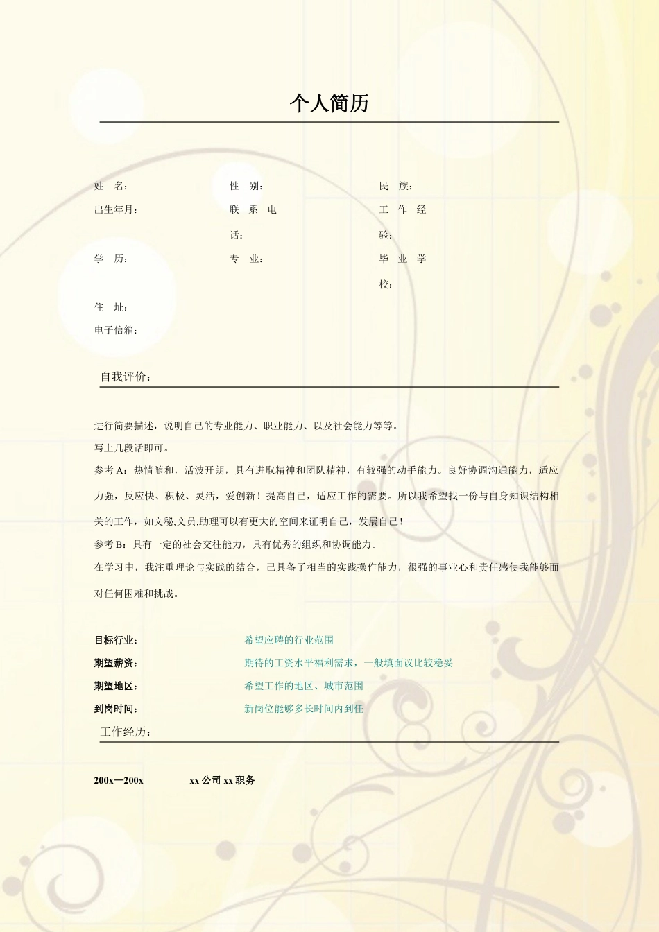 个人简历姓名:性别:民族:出生年月:联系电话:工作经验:学历:专业:毕业学校:住址:电子信箱:自我评价:进行简要描述,说明自己的专业能力、职业能力、以及社会能力等等。写上几段话即可。参考A:热情随和,活波开朗,具有进取精神和团队精神,有较强的动手能力。良好协调沟通能力,适应力强,反应快、积极、灵活,爱创新!提高自己,适应工作的需要。所以我希望找一份与自身知识结构相关的工作,如文秘,文员,助理可以有更大的空间来证明自己,发展自己!参考B:具有一定的社会交往能力,具有优秀的组织和协调能力。在学习中,我注重理论与实践的结合,己具备了相当的实践操作能力,很强的事业心和责任感使我能够面对任何困难和挑战。目标行业:希望应聘的行业范围期望薪资:期待的工资水平福利需求,一般填面议比较稳妥期望地区:希望工作的地区、城市范围到岗时间:新岗位能够多长时间内到任工作经历:200x—200xxx公司xx职务200x—200x教育培训:1997.9——2000.7XX技能培训中心xx培训关于***方面的专业技能培训,获得了***资格证书。20XX——20XXXX大学xx专业本科系统学习了***方面的理论知识,具有***职业的工作能力。