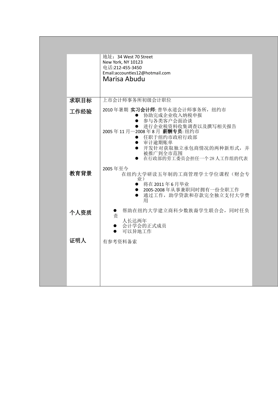 34West70StreetNewYork,NY10123Phone:212-455-3450Email:accounties12@hotmail.comMarisaAbuduObjectExperienceEducationPersonalDataReferencesEntry-LevelstaffaccountingpositionwithapublicaccountingfirmSummer2010AccountingIntern:PwCConsulting,NewYorkCityAssistedinpreparingcorporateincometaxreturnAttendedmeetingswithclientsConductedresearchincorporatetaxlibraryandwroteresearchreportNov.2005—Aug.2008PayrollSpecialist:CityofNewYorkWorkedincivilservicepositionindepartmentofAdministrationAuditedallovertimebillingDevelopedtwonewformsforrequestingindependentcontractorstatusthatarenowusedcity-wideRepresented28-personworkunitonthedepartment’smanagement-labourcommitteeJan.2005—presentPursuinga5-yearbachelorofbusinessadministrationdegree(majorinaccounting)fromNewYorkUniversitywillgraduateJune2011Attendedpart-timefrom2005until2008whileholdingdownafulltimejobHavefinanced100%ofallcollegeexpensesthroughsavings,work,andstudentloansHelpedstarttheMinorityBusinessStudentAssociationatNYUandservedasprogramdirectorfortwoyearsAmamemberoftheAccountingSocietyAmwillingtorelocateAvailableuponrequest地址:34West70StreetNewYork,NY10123电话:212-455-3450Email:accounties12@hotmail.comMarisaAbudu求职目标工作经验教育背景个人资质证明人上市会计师事务所初级会计职位2010年暑期实习会计师:普华永道会计师事务所,纽约市协助完成企业收入纳税申报参与各类客户会面洽谈进行企业税资料收集调查以及撰写相关报告2005年11月—2008年8月薪酬专员:纽约市任职于纽约市政府行政部审计逾期账单开发针对获取独立承包商情况的两种新形式,并被推广到全市范围在行政部的劳工委员会担任一个28人工作组的代表2005年至今在纽约大学研读五年制的工商管理学士学位课程(财会专业)将在2011年6月毕业2005-2008年从事兼职同时拥有一份全职工作通过工作,助学贷款和存款完全独立支付大学费用帮助在纽约大学建立商科少数族裔学生联合会,同时任负责人长达两年会计学会的正式成员可以异地工作有参考资料备索
