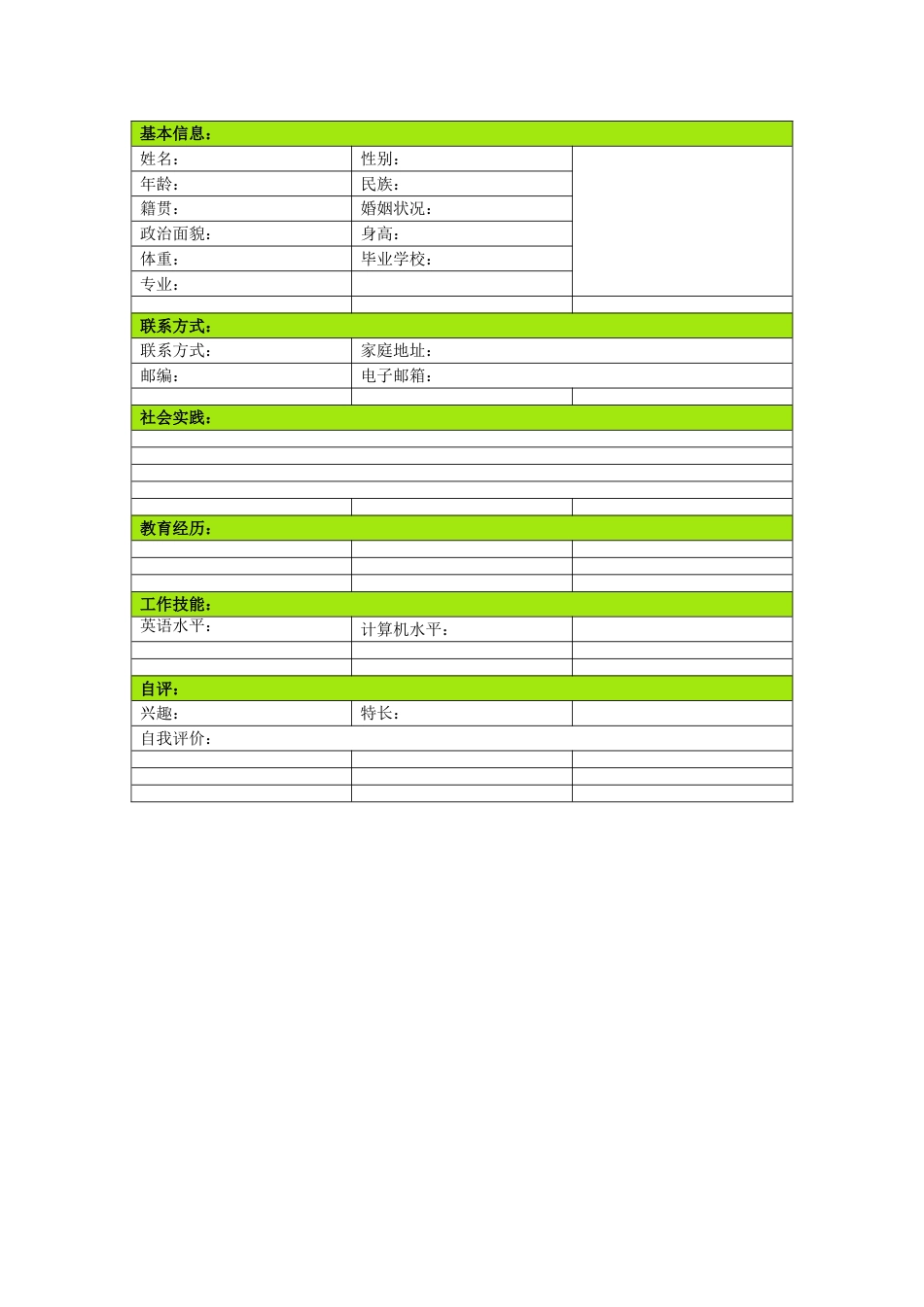 我的简历姓名:联系方式:电子邮箱:基本信息:姓名:性别:年龄:民族:籍贯:婚姻状况:政治面貌:身高:体重:毕业学校:专业:联系方式:联系方式:家庭地址:邮编:电子邮箱:社会实践:教育经历:工作技能:英语水平:计算机水平:自评:兴趣:特长:自我评价: