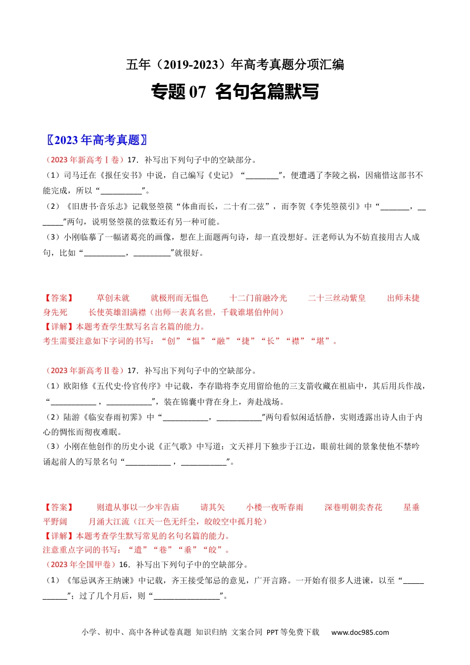 小学、初中、高中各种试卷真题知识归纳文案合同PPT等免费下载www.doc985.com五年(2019-2023)年高考真题分项汇编专题07名句名篇默写〖2023年高考真题〗(2023年新高考Ⅰ卷)17.补写出下列句子中的空缺部分。(1)司马迁在《报任安书》中说,自己编写《史记》“________”,便遭遇了李陵之祸,因痛惜这部书不能完成,所以“__________”。(2)《旧唐书·音乐志》记载竖箜篌“体曲而长,二十有二弦”,而李贺《李凭箜篌引》中“_______,_______”两句,说明竖箜篌的弦数还有另一种可能。(3)小刚临摹了一幅诸葛亮的画像,想在上面题两句诗,却一直没想好。汪老师认为不妨直接用古人成句,比如“__________,_________”就很好。【答案】草创未就就极刑而无愠色十二门前融冷光二十三丝动紫皇出师未捷身先死长使英雄泪满襟(出师一表真名世,千载谁堪伯仲间)【详解】本题考查学生默写名言名篇的能力。考生需要注意如下字词的书写:“创”“愠”“融”“捷”“长”“襟”“堪”。(2023年新高考Ⅱ卷)17.补写出下列句子中的空缺部分。(1)欧阳修《五代史·伶官传序》中记载,李存勖将李克用留给他的三支箭收藏在祖庙中,其后用兵作战,“___________,___________”,装在锦囊中背在身上,奔赴战场。(2)陆游《临安春雨初霁》中“___________,___________”两句看似闲适恬静,实则透露出诗人由于内心的惆怅而彻夜难眠。(3)小刚在他创作的历史小说《正气歌》中写道:文天祥月下独步于江边,眼前壮阔的景象使他不禁吟诵起前人的写景名句“___________,___________”。【答案】则遣从事以一少牢告庙请其矢小楼一夜听春雨深巷明朝卖杏花星垂平野阔月涌大江流(江天一色无纤尘,皎皎空中孤月轮)【详解】本题考查学生默写常见的名句名篇的能力。注意重点字词的书写:“遣”“巷”“垂”“皎”。(2023年全国甲卷)16.补写出下列句子中的空缺部分。(1)《邹忌讽齐王纳谏》中记载,齐王接受邹忌的意见,广开言路。一开始有很多人进谏,以至“___________”;过了几个月后,则“________________”。小学、初中、高中各种试卷真题知识归纳文案合同PPT等免费下载www.doc985.com(2)鲍照曾以“对案不能食,拔剑击柱长叹息”表达内心愤懑,李白《行路难》中的两句诗“_________,__________”,描写相近动作,抒写近似心情。(3)花和雪都是古诗词中常见的物象,古代诗人常常以雪喻花,或以花喻雪,比如“___________,___________”。【答案】门庭若市时时而间进停杯投箸不能食拔剑四顾心茫然忽如一夜春风来千树万树梨花开(砌下落梅如雪乱,拂了一身还满)【详解】本题考查学生默写常见的名句名篇的能力。注意重点字词的写法,如“庭”“箸”“拔”“茫”“砌”等。(2023年全国乙卷)16.补写出下列句子中的空缺部分。(1)白居易《琵琶行》中“_____________,_____________”两句,写琵琶女结束演奏后的动作及神态,同时也引出下文对其身世的叙述。(2)宋代张孝祥以“玉鉴琼田三万顷,着我扁舟一叶”描写舟泛水上,境致与苏轼《赤壁赋》中“_____________,_____________”两句所写的景致非常相似。(3)小刚因病不能参加比赛,汪教练给他发了一条信息。写道:“人生中的机遇绝非只有一次,古诗云:“_____________,_____________。”我对你永远充满信心!”【答案】沉吟放拨插弦中整顿衣裳起敛容纵一苇之所如凌万顷之茫然长风破浪会有时直挂云帆济沧海【详解】本题考查学生默写常见的名句名篇的能力。注意重点字词的写法,如“拨”“敛”“纵”“凌”等,要理解字义去记忆。〖2022年高考真题〗(2022年新高考Ⅰ卷)17.补写出下列句子中的空缺部分。(1)《荀子·劝学》中“_________________________,_________________________”两句,以劣马的执着为喻,强调为学必须持之以恒。(2)乐器在古代生活中发挥着重要作用,《诗经·周南·关雎》中写到乐器的句子是“_________________________”和“_________________________”。(3)自然界鸟类的啼鸣有时会引发人们的悲思愁绪,这在唐宋诗词中屡见不鲜,如“_________________小学、初中、高中各种试卷真题知识归纳文案...