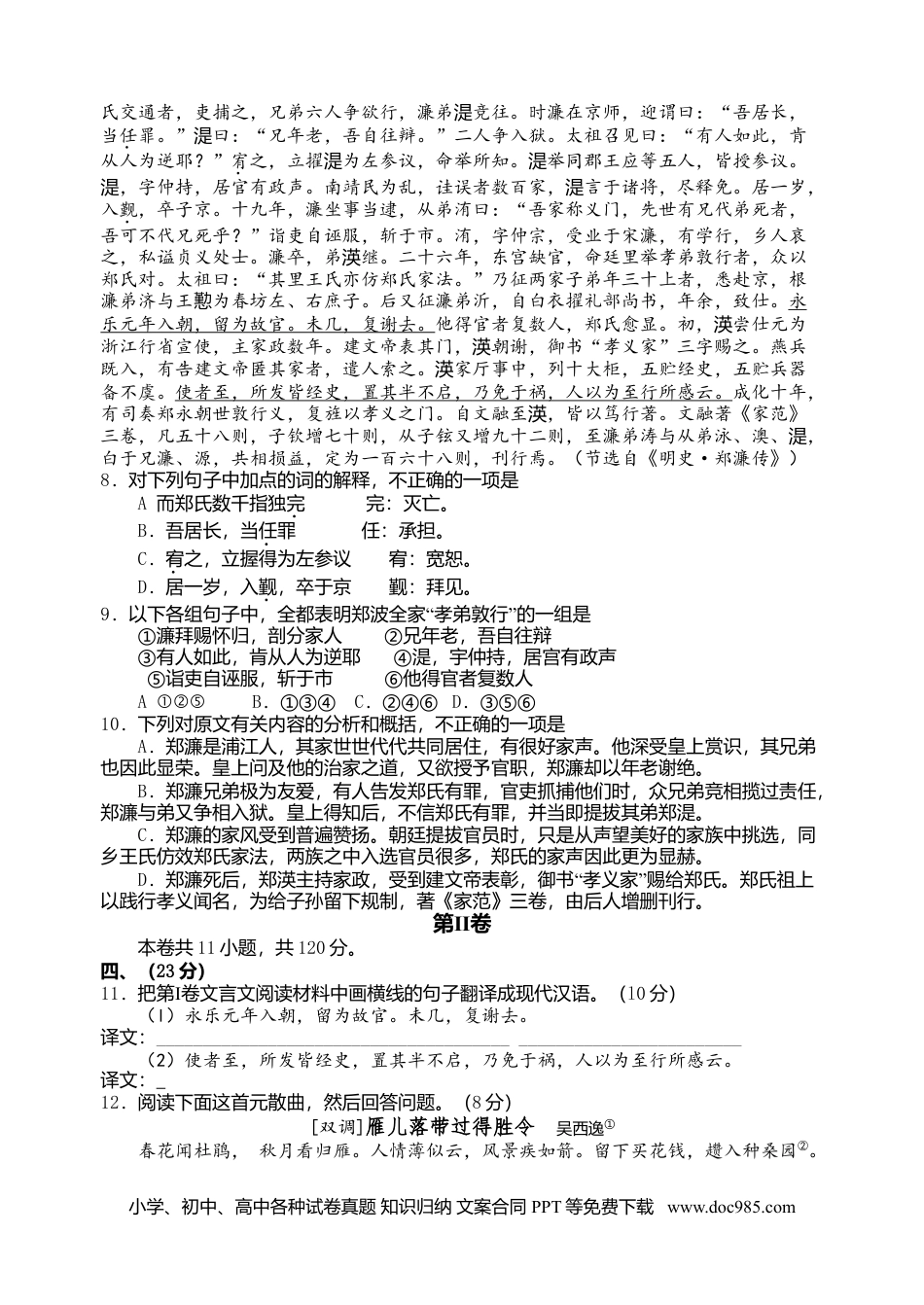 2008年普通高等学校招生全国统一考试(四川卷)语文Ⅰ第卷本卷共10小题,每小题3分,共30分。在每小题给出的四个选项中。只有一项符合题目要求。一、(12分,每小题3分)1.下列词语中加点的字,每对读音都相同的一组是A.中肯/中意穿着/歪打正着得心应手/应接不暇B.创伤/重创桂冠/弹冠相庆好大喜功/乐善好施C.供稿/供应涤纶/羽扇纶巾厚古薄今/日薄西山D.解数/解读寒舍/退避三舍曲径通幽/曲尽其妙2.下列各句中,加点的成语使用不恰当的一句是A.有的父母习惯在饭桌上表扬或批评孩子,一边吃饭,一边轻描淡写地说几句,显得不够重视,孩子也没听进去,效果自然会差一些。B“.迎奥运文明礼仪之光·”北京欢迎您展览,以漫画和歌谣这些人民大众喜闻乐见的艺术形式为载体,展现了北京的名胜古迹、市容新貌。C.微笑像和煦的春风,微笑像温暖的阳光,它蕴涵着一种神奇的力量,可以使人世间所有的烦恼都涣然冰释。D.今天我们提倡的创新,并不是要抛开先哲时贤的成果另起炉灶,而是要站在前辈的肩膀上一步一个脚印地前进,并努力超越前人。3.下列各句中,没有语病的一句是A.从调查的结果来看,该校学生的课余活动主要有班级野炊、年级文体比赛、校际联欢会等,内容丰富,形式多样。B.教育在综合国力的形成中处于基础地位,国力的强弱越来越多地取决于劳动者素质的提高,取决于各类人才培养的质量与数量。C.市政府决定配合奥运项目的实施,重点抓好地铁建设、危旧房改造、污水处理等工程工作,加快现代化大都市建设的进程。D.学习方法可能因人而异,但勤奋、努力等良好的学习态度和合理的时间安排却是每个想取得成功的学生所必须具备的。4.依次填入下面横线处的语句,衔接最恰当的一组是人格,。,,,_______。①它要求一个人应有高尚的道德追求②勇于承担对他人、对社会的道德义务③是做人的尊严、价值和品质的总和④正确处理个人与他人、个人与社会的关系⑤是指人与动物相区别的内在规定性⑥做到自尊、自爱、自强、自律A.③⑥①④⑤②B.③⑤①②③④C.⑤②①⑥④③D.⑤③①②④⑥二、(9分,每小题3分)阅读下面的文字,完成5~7题。目前,我国“煤变石油”的产业化进程正在有序进行之中。也许有人会问,煤和石油,一个是黑乎乎的固体,一个是油亮亮的液体,两者从形态上看似乎并无相同之处,为什么要将煤转化为石油?转化又是怎样实现的?小学、初中、高中各种试卷真题知识归纳文案合同PPT等免费下载www.doc985.com随着我国经济的快速发展,国内能源消费需求量越来越大。由于我国对石油进口的依存度较大,所以国际油价上涨、中东政局变化等因素,都会对我国石油能源安全构成潜在危险。同时由于石油具有流动性好,便于开采、输送和使用的特点,近年来国内石油消费量的增幅大大超过了石油产量的增幅。而煤作为能源,与石油同属化石能源,只是由于古植物和地质条件的不同,最后生成的形态才与石油大不相同。从现有数据看,煤在我国的可开采量及供应年限远远大于石油。于是有人考虑将煤转化为石油,以满足“”国内市场对石油的需求。虽然煤变石油需要有足够的投入,但是从经济效益来看,这种考虑还是可行的。基于这样一些认识,人们开始研究各种转化方式,间接液化技术就是其中较为有效的方法之一。煤的间接液化过程可以分三步进行。第一步制取原料气。把经过适当处理的煤送入反应器,在一定温度和压力下通过气化剂使煤不完全燃烧,这样就能以一定的流动方式将煤转化成一氧化碳和氢气混合的原料气,灰分形成残渣排出。第二步进行催化反应。将制取的原料气净化,在催化剂作用下,让其发生化合反应,合成类似石油的碳氢化合物。在这个过程中,催化剂起着关键的作用。早些时候,国外有一家公司曾经研制出一种成分为铁、硅、钾、铜的产效比较高的催化剂,其所得化合物的组成为:汽油32%、柴油21%、石蜡烃47%。第三步对催化反应的产物进行进一步的提质加工。就如刚开采出来的石油一样,经过催化反应出来的油也有很多指标不合格,如十六烷值含量、硫含量、水分以及粘度、酸度等,所以还需要对它进行处理,使它达到合格标准,满足市场需要。目前,我国的这种“煤变...