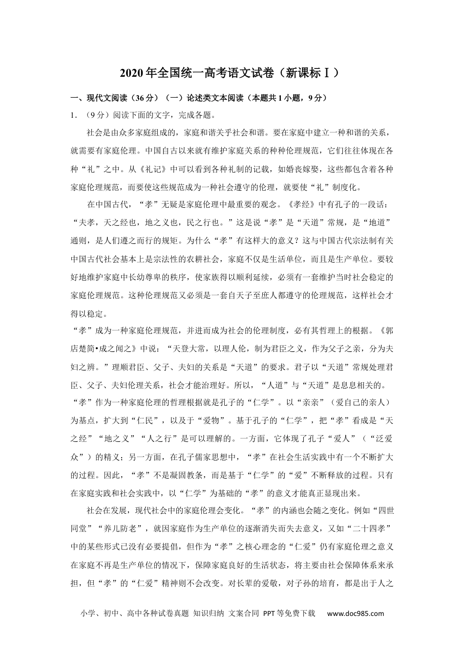 小学、初中、高中各种试卷真题知识归纳文案合同PPT等免费下载www.doc985.com2020年全国统一高考语文试卷(新课标Ⅰ)一、现代文阅读(36分)(一)论述类文本阅读(本题共1小题,9分)1.(9分)阅读下面的文字,完成各题。社会是由众多家庭组成的,家庭和谐关乎社会和谐。要在家庭中建立一种和谐的关系,就需要有家庭伦理。中国自古以来就有维护家庭关系的种种伦理规范,它们往往体现在各种“礼”之中。从《礼记》中可以看到各种礼制的记载,如婚丧嫁娶,这些都包含着各种家庭伦理规范,而要使这些规范成为一种社会遵守的伦理,就要使“礼”制度化。在中国古代,“孝”无疑是家庭伦理中最重要的观念。《孝经》中有孔子的一段话:“夫孝,天之经也,地之义也,民之行也。”这是说“孝”是“天道”常规,是“地道”通则,是人们遵之而行的规矩。为什么“孝”有这样大的意义?这与中国古代宗法制有关中国古代社会基本上是宗法性的农耕社会,家庭不仅是生活单位,而且是生产单位。要较好地维护家庭中长幼尊卑的秩序,使家族得以顺利延续,必须有一套维护当时社会稳定的家庭伦理规范。这种伦理规范又必须是一套自天子至庶人都遵守的伦理规范,这样社会才得以稳定。“孝”成为一种家庭伦理规范,并进而成为社会的伦理制度,必有其哲理上的根据。《郭店楚简•成之闻之》中说:“天登大常,以理人伦,制为君臣之义,作为父子之亲,分为夫妇之辨。”理顺君臣、父子、夫妇的关系是“天道”的要求。君子以“天道”常规处理君臣、父子、夫妇伦理关系,社会才能治理好。所以,“人道”与“天道”是息息相关的。“孝”作为一种家庭伦理的哲理根据就是孔子的“仁学”。以“亲亲”(爱自己的亲人)为基点,扩大到“仁民”,以及于“爱物”。基于孔子的“仁学”,把“孝”看成是“天之经”“地之义”“人之行”是可以理解的。一方面,它体现了孔子“爱人”(“泛爱众”)的精义;另一方面,在孔子儒家思想中,“孝”在社会生活实践中有一个不断扩大的过程。因此,“孝”不是凝固教条,而是基于“仁学”的“爱”不断释放的过程。只有在家庭实践和社会实践中,以“仁学”为基础的“孝”的意义才能真正显现出来。社会在发展,现代社会中的家庭伦理会变化。“孝”的内涵也会随之变化。例如“四世同堂”“养儿防老”,就因家庭作为生产单位的逐渐消失而失去意义,又如“二十四孝”中的某些形式已没有必要提倡,但作为“孝”之核心理念的“仁爱”仍有家庭伦理之意义在家庭不再是生产单位的情况下,保障家庭良好的生活状态,将主要由社会保障体系来承担,但“孝”的“仁爱”精神则不会改变。对长辈的爱敬,对子孙的培育,都是出于人之小学、初中、高中各种试卷真题知识归纳文案合同PPT等免费下载www.doc985.com内在本心的“仁爱”。鲁迅在《我们现在怎样做父亲》中批评抹掉了“爱”,一味说“恩”的“父为子纲”说,提出:“我现在心以为然的,便只是‘爱’。”“孝”之核心理念“仁爱”作为家庭伦理仍具有某种普遍价值的意义。(摘编自汤一介《“孝”作为家庭伦理的意义》)(1)下列关于原文内容的理解和分析,正确的一项是A.中国自古以来注重家庭伦理,把家庭伦理规范置于比社会伦理制度更重要的位置。B.家庭既是生活单位,又是生产单位,决定了“孝”是中国古代社会特有的家庭伦理。C.根据儒家思想,“孝”不仅是家庭内的规范,而且在社会中有一个不断扩大的过程。D.由于家庭结构和家庭伦理的变化,传统“孝”的形式在现代社会无提倡的必要。(2)下列对原文论证的相关分析,不正确的一项是A.文章几次引用文献,目的是论证中国古今经典中对“孝”的理解诠释是一致的。B.文章基于对孔子“仁学”思想的认同与接受,提出了关于“孝”的意义的论断。C.文章在论证结构上,先引出论题,再提出观点,然后纵向深入,最后补充论述。D.文章既肯定“孝”的普遍意义,又指出它的内涵变化,显示了作者的思辨态度。(3)根据原文内容,下列说法不正确的一项是A.中国古代的“礼”,既有伦理性的一面,也有制度性的一面,是二者的结合。B.儒家从“天道”与“人道”的关系看待“孝”,这体现了哲理与伦理的统...