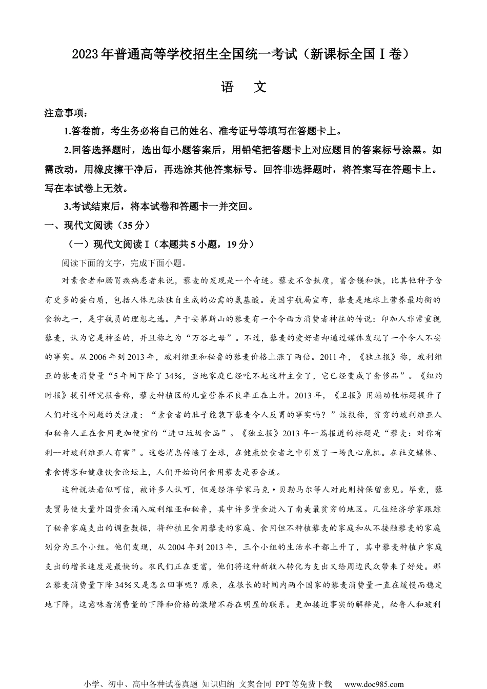 小学、初中、高中各种试卷真题知识归纳文案合同PPT等免费下载www.doc985.com2023年普通高等学校招生全国统一考试(新课标全国Ⅰ卷)语文注意事项:1.答卷前,考生务必将自己的姓名、准考证号等填写在答题卡上。2.回答选择题时,选出每小题答案后,用铅笔把答题卡上对应题目的答案标号涂黑。如需改动,用橡皮擦干净后,再选涂其他答案标号。回答非选择题时,将答案写在答题卡上。写在本试卷上无效。3.考试结束后,将本试卷和答题卡一并交回。一、现代文阅读(35分)(一)现代文阅读I(本题共5小题,19分)阅读下面的文字,完成下面小题。对素食者和肠胃疾病患者来说,藜麦的发现是一个奇迹。藜麦不含麸质,富含镁和铁,比其他种子含有更多的蛋白质,包括人体无法独自生成的必需的氨基酸。美国宇航局宣布,藜麦是地球上营养最均衡的食物之一,是宇航员的理想之选。产于安第斯山的藜麦有一个令西方消费者神往的传说:印加人非常重视藜麦,认为它是神圣的,并且称之为“万谷之母”。不过,藜麦的爱好者却通过媒体发现了一个令人不安的事实。从2006年到2013年,玻利维亚和秘鲁的藜麦价格上涨了两倍。2011年,《独立报》称,玻利维亚的藜麦消费量“5年间下降了34%,当地家庭已经吃不起这种主食了,它已经变成了奢侈品”。《纽约时报》援引研究报告称,藜麦种植区的儿童营养不良率正在上升。2013年,《卫报》用煽动性标题提升了人们对这个问题的关注度:“素食者的肚子能装下藜麦令人反胃的事实吗?”该报称,贫穷的玻利维亚人和秘鲁人正在食用更加便宜的“进口垃圾食品”。《独立报》2013年一篇报道的标题是“藜麦:对你有利--对玻利维亚人有害”。这些消息传遍了全球,在健康饮食者之中引发了一场良心危机。在社交媒体、素食博客和健康饮食论坛上,人们开始询问食用藜麦是否合适。这种说法看似可信,被许多人认可,但是经济学家马克·贝勒马尔等人对此则持保留意见。毕竟,藜麦贸易使大量外国资金涌入玻利维亚和秘鲁,其中许多资金进入了南美最贫穷的地区。几位经济学家跟踪了秘鲁家庭支出的调查数据,将种植且食用藜麦的家庭、食用但不种植藜麦的家庭和从不接触藜麦的家庭划分为三个小组。他们发现,从2004年到2013年,三个小组的生活水平都上升了,其中藜麦种植户家庭支出的增长速度是最快的。农民们正在变富,他们将这种新收入转化为支出又给周边民众带来了好处。那么藜麦消费量下降34%又是怎么回事呢?原来,在很长的时间内两个国家的藜麦消费量一直在缓慢而稳定地下降,这意味着消费量的下降和价格的激增不存在明显的联系。更加接近事实的解释是,秘鲁人和玻利小学、初中、高中各种试卷真题知识归纳文案合同PPT等免费下载www.doc985.com维亚人只是想换换口味,吃点别的东西。为了解藜麦的种植情况,我去了秘鲁科尔卡山谷,这里在印加时代以前就得到了开垦。藜麦是一种美丽的作物,拥有深红色或金黄色的巨大种球。在安第斯山的这片区域,人们在梯田上同时种植藜麦以及当地特有的玉米和马铃薯品种。“国外需求绝对是一件好事,”我的秘鲁向导杰西卡说道,“农民非常高兴,所有想吃藜麦的人仍然买得起这种食物。”她还解释了另一个好处。之前,秘鲁城里人往往认为他们这片区域吃藜麦的人“很土”。现在,由于美国人和欧洲人的重视,食用藜麦被视作一种时尚。“利马人终于开始尊重我们这些高原人和我们的传统了。”玻利维亚西南部有一片遥远而不适合居住的区域,那里到处都是盐湖和休眠火山。在那里,我看到了由藜麦资金支持的当地急需的开发和旅游项目。千百年来勉强能够养家糊口的自耕农开始为更加美好的未来而投资。我在2017年4月听到的玻利维亚人对于该作物的唯一抱怨是,日益增长的供给正在拉低价格。玻利维亚的藜麦种植面积增长了两倍多,从2007年的5万公顷增长到2016年的18万公项。马克·贝勒马尔后来对我说:“这是一个令人悲伤的结局,因为它的价格不太可能再度回升。”在风景如画的科尔卡山谷,当太阳落山时,我问杰西卡,欧洲和北美的消费者是否应该为吃掉秘鲁人和玻利维亚人的食物而感到内疚。我可以猜到答案,但我想听到当地人的亲口否认。“相信我,”杰西卡笑道,“...